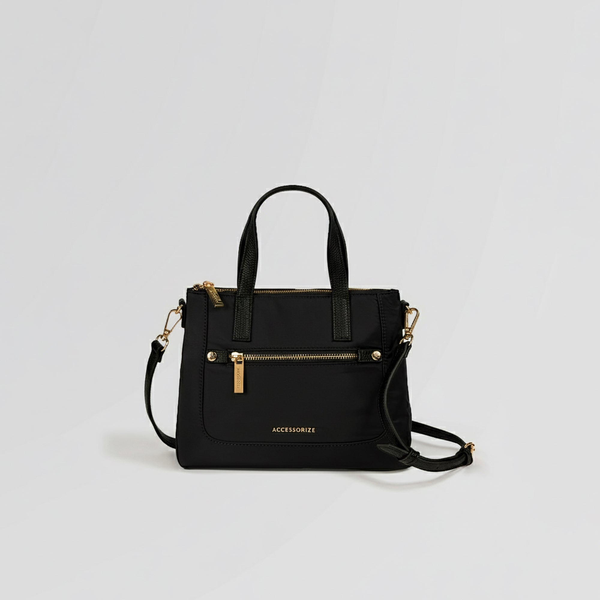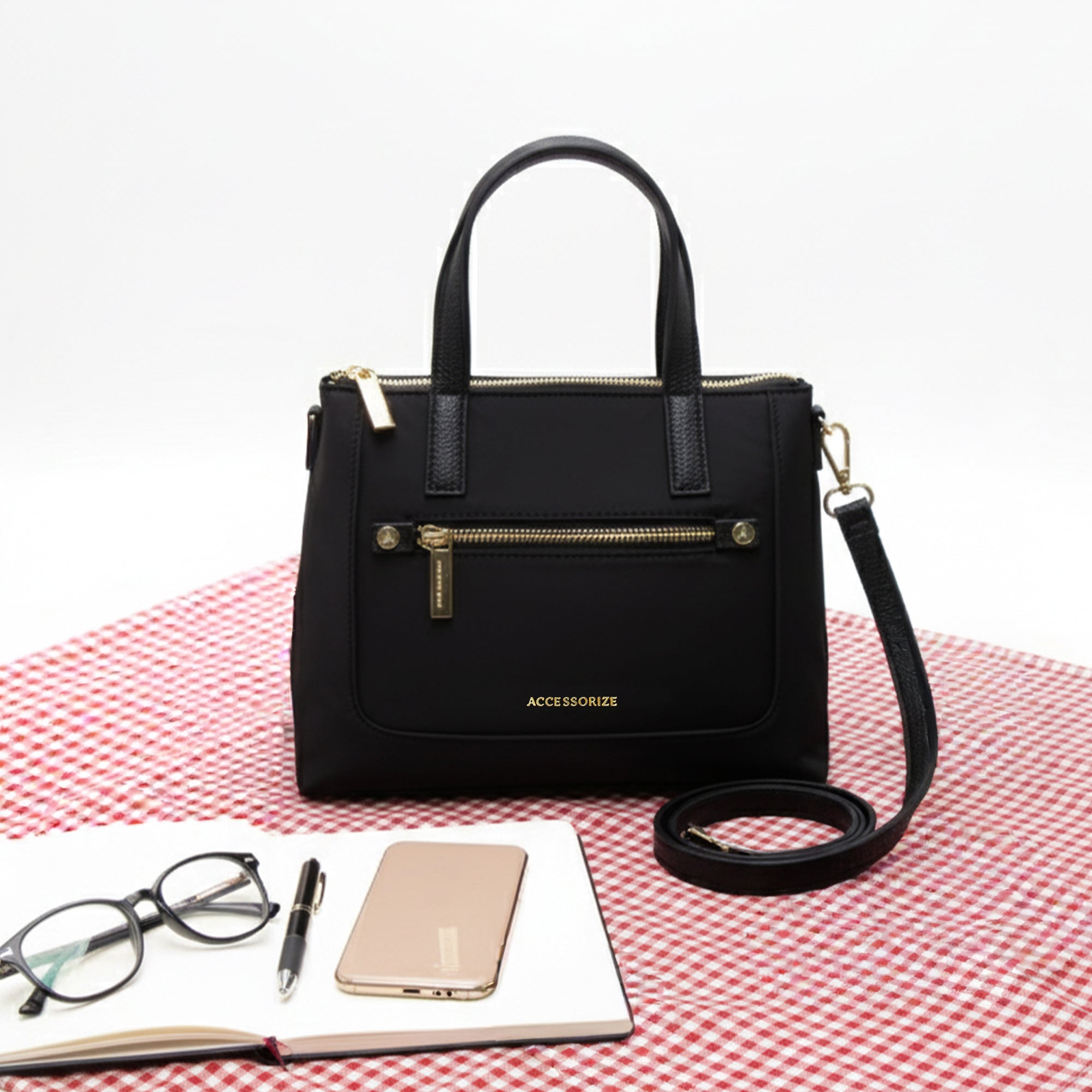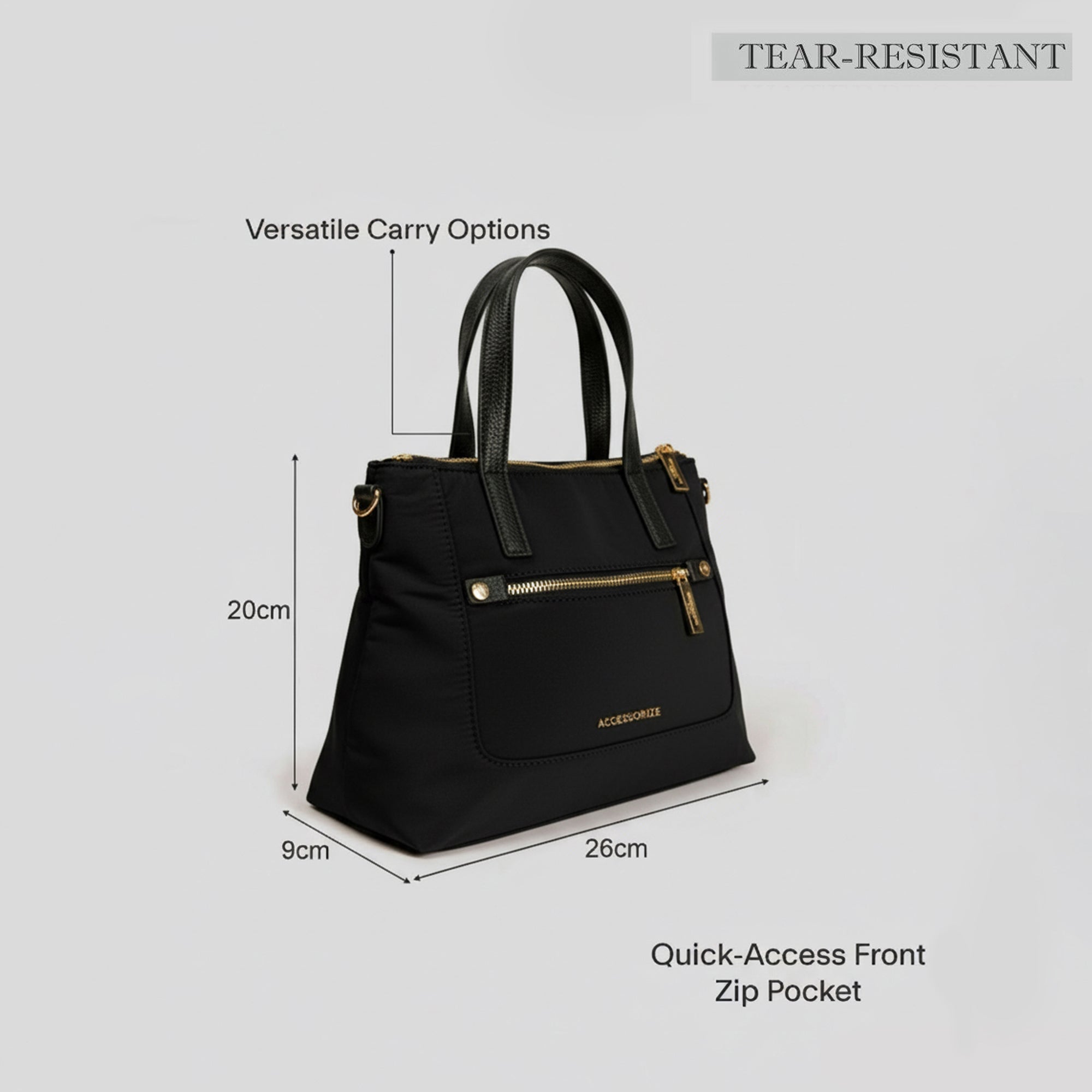 Elevate your everyday style with this chic and functional Mini Tote Bag. Crafted from durable, tear-resistant, and water-proof nylon fabric, it's designed to withstand daily use while keeping your essentials safe. Featuring classic black faux leather handles and trim, gold-tone hardware, and a versatile detachable sling strap, this bag seamlessly transitions from a sophisticated mini tote to a comfortable crossbody sling. The quick-access front zip pocket and secure main compartment offer smart organisation for your daily essentials, making it perfect for casual outings, travel, or busy errands.