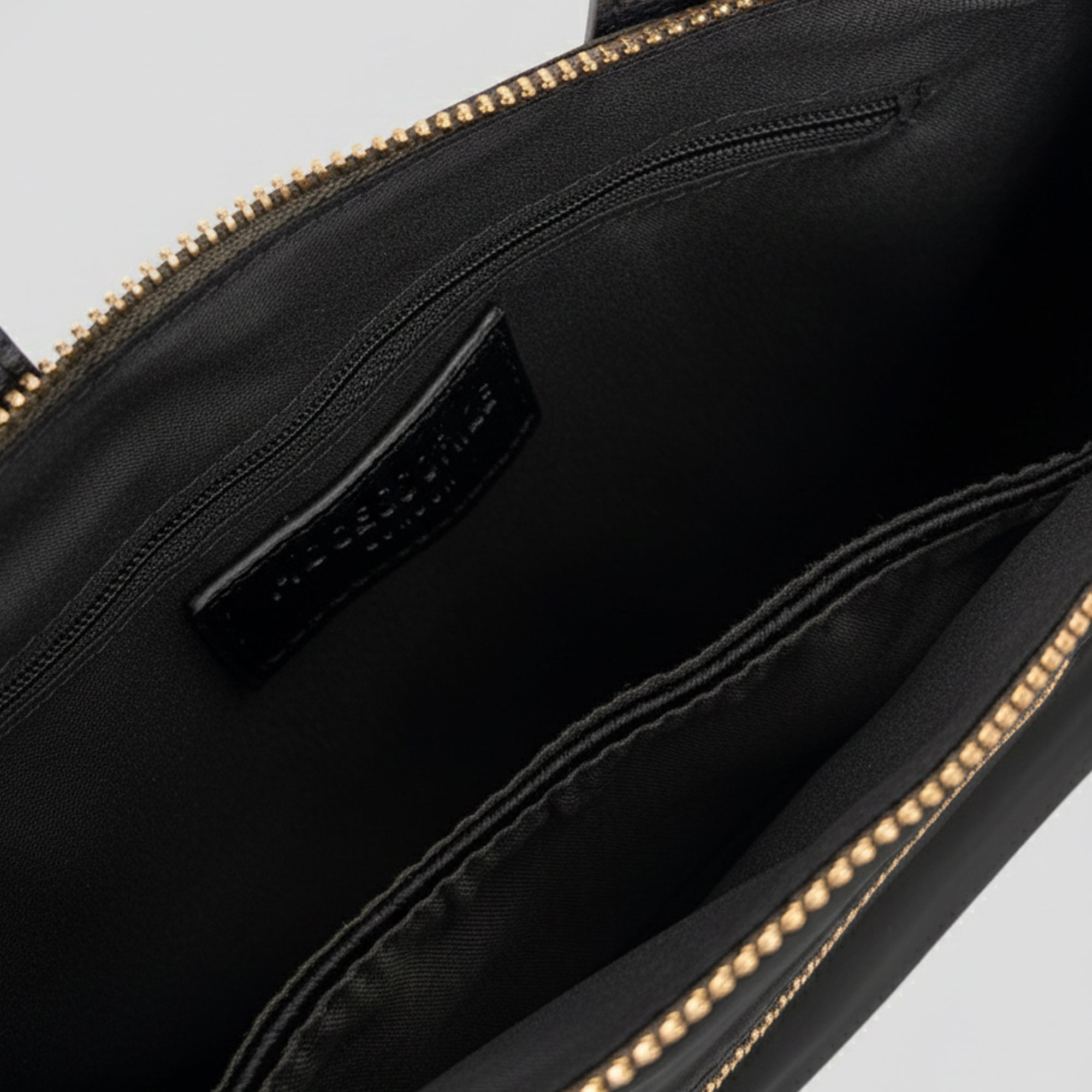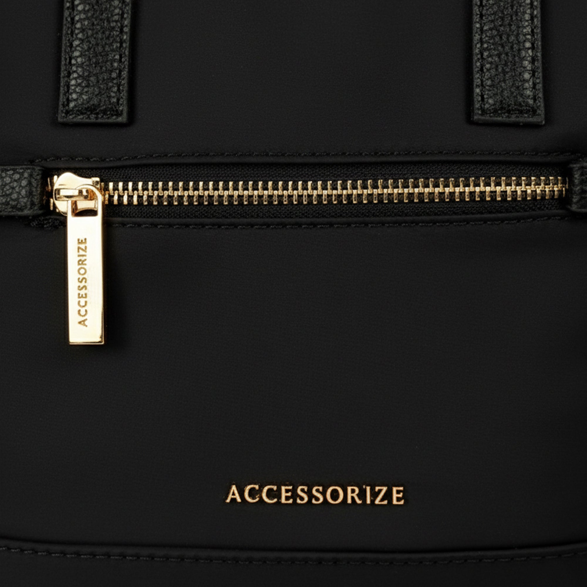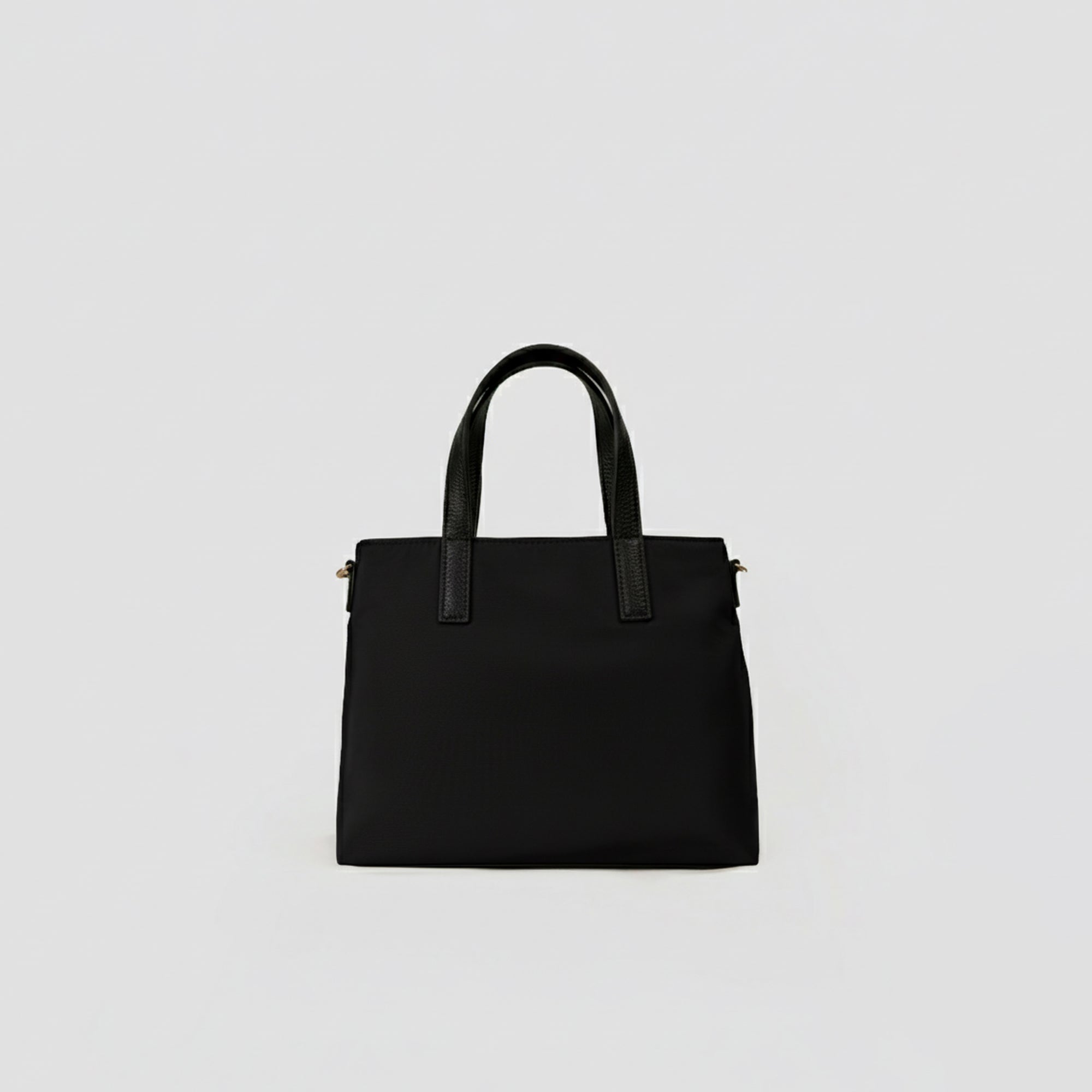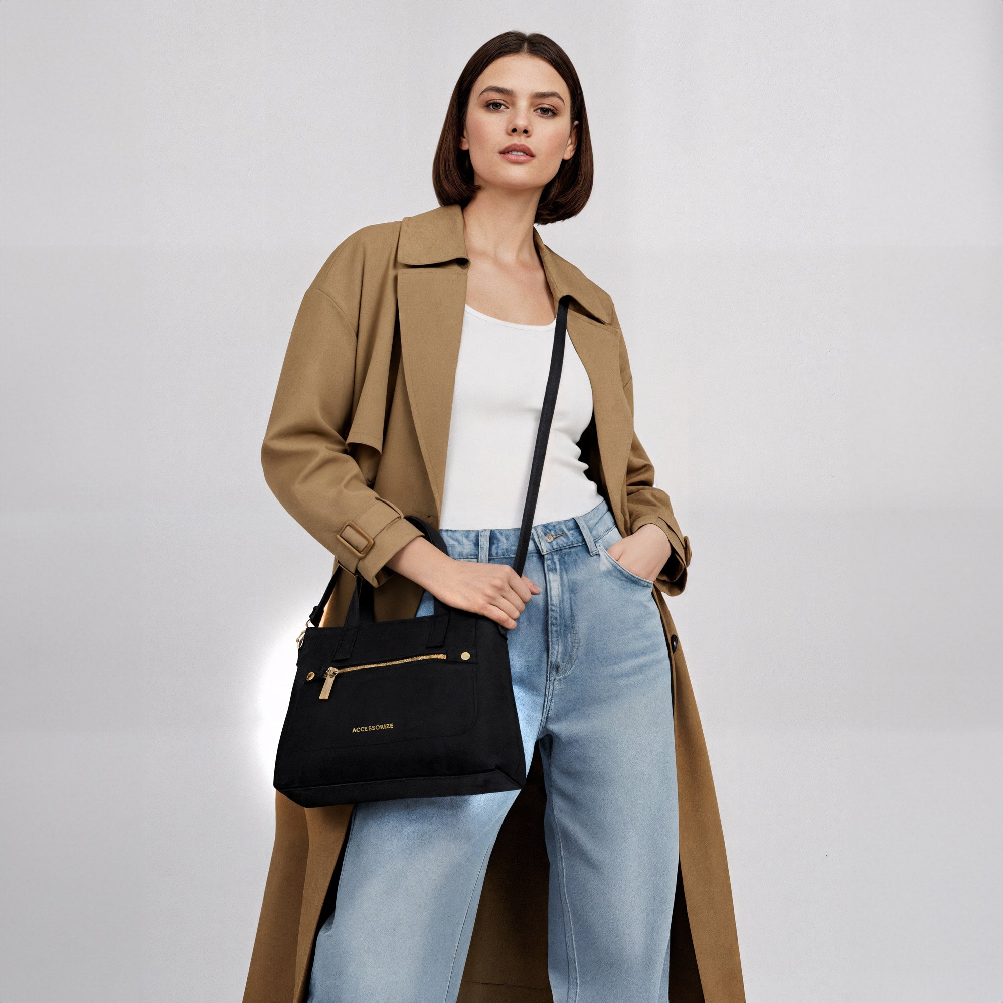 Elevate your everyday style with this chic and functional Mini Tote Bag. Crafted from durable, tear-resistant, and water-proof nylon fabric, it's designed to withstand daily use while keeping your essentials safe. Featuring classic black faux leather handles and trim, gold-tone hardware, and a versatile detachable sling strap, this bag seamlessly transitions from a sophisticated mini tote to a comfortable crossbody sling. The quick-access front zip pocket and secure main compartment offer smart organisation for your daily essentials, making it perfect for casual outings, travel, or busy errands.