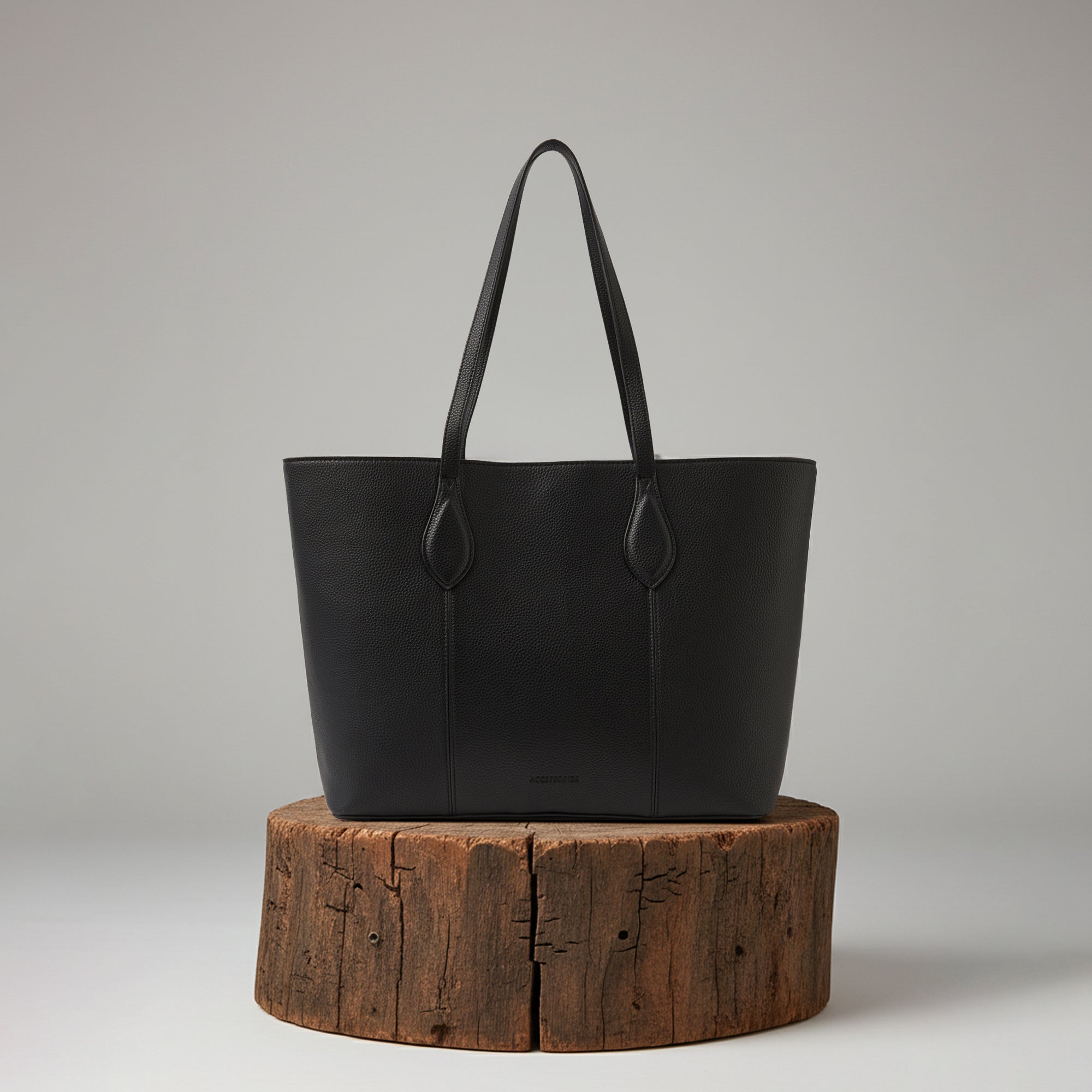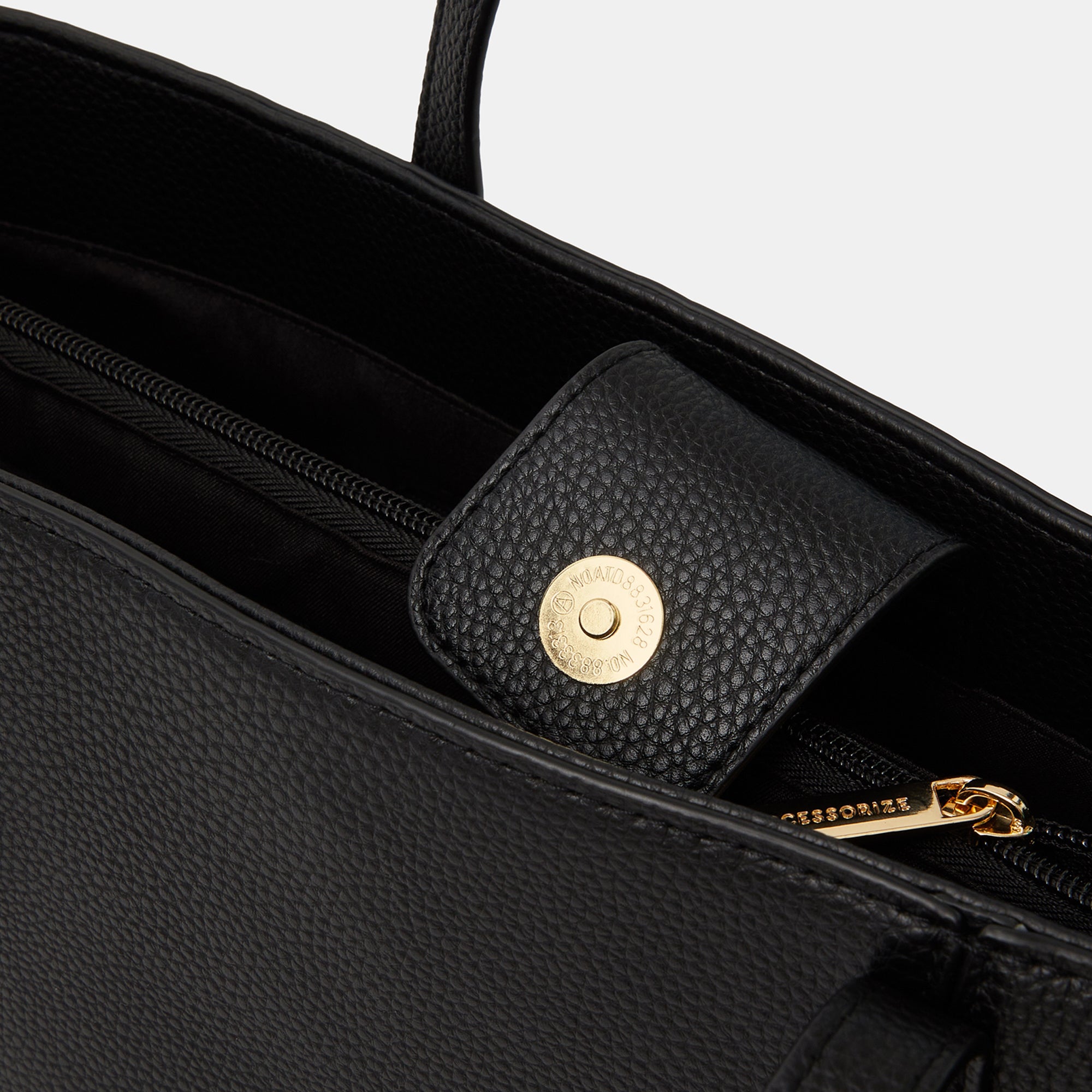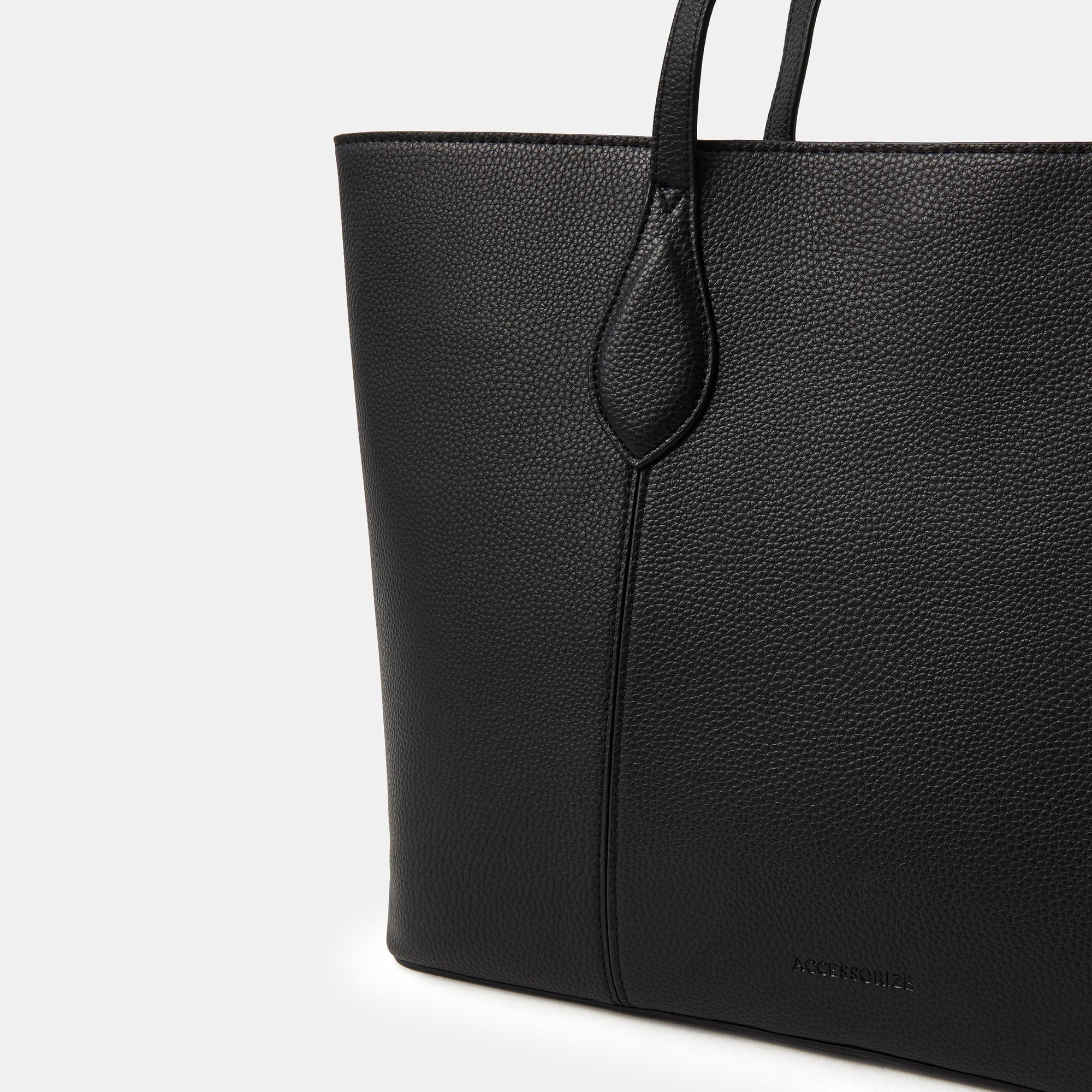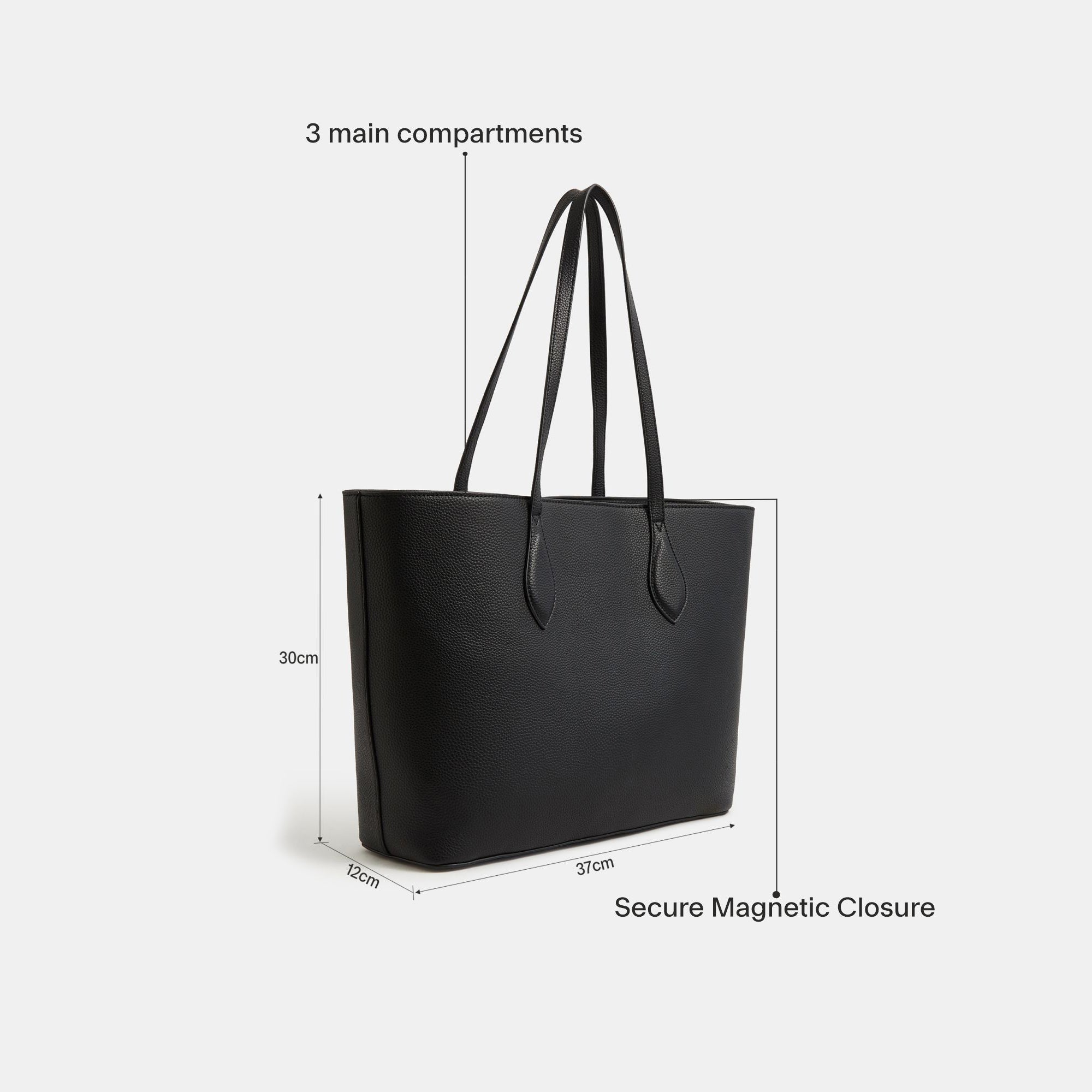 An essential for the corporate girlies. Designed in faux leather, this tote has multiple compartments inside, perfectly-sized for a laptop and other work essentials. Finished with two sturdy shoulder straps and a magnetic button tab. Black