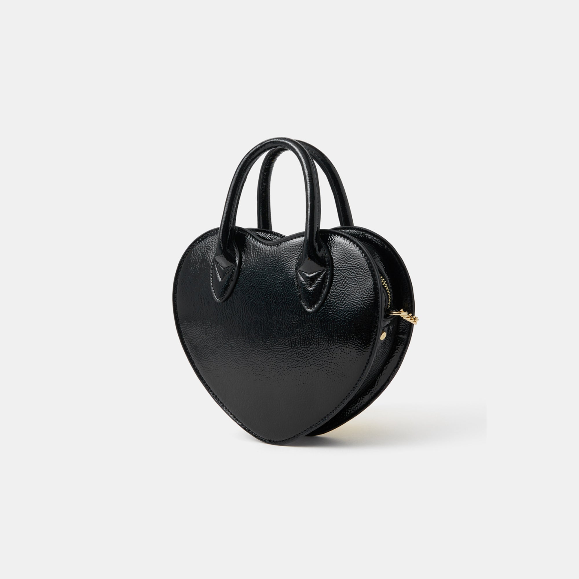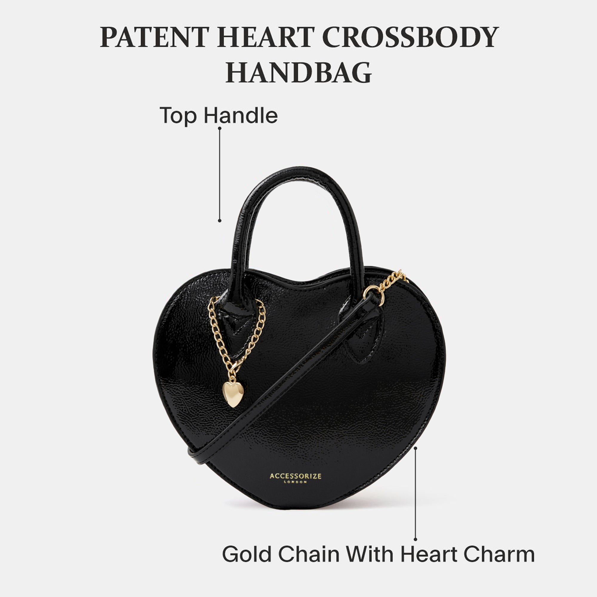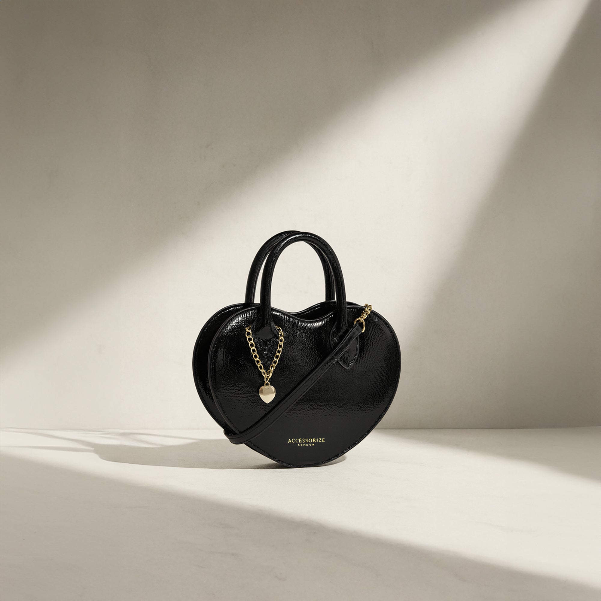 We've got a crush (on this handbag). Designed with a shiny patent finish, this bag is shaped like a love heart with two top handles and an optional strap to style like a crossbody. Features a zip fastening and gold-tone heart chain charm.