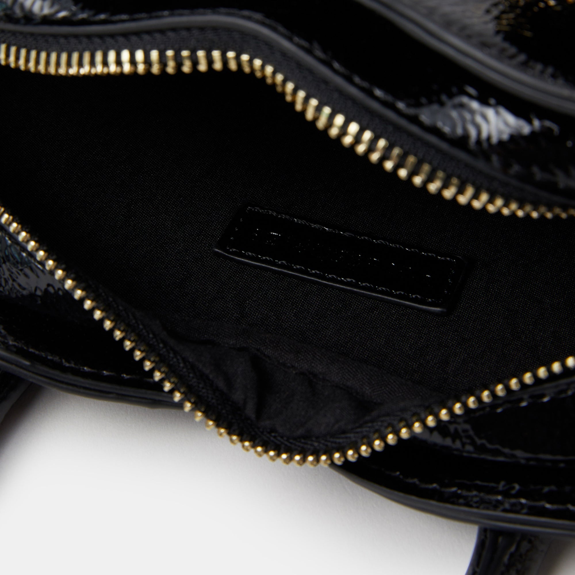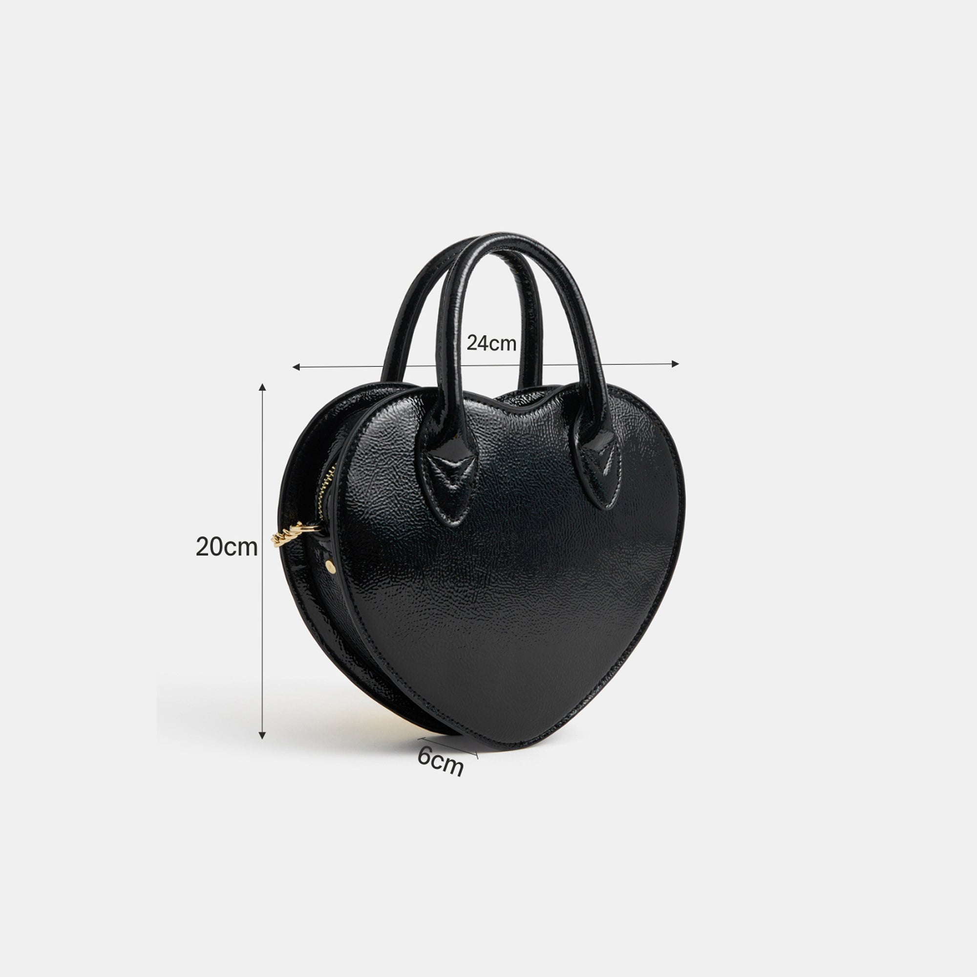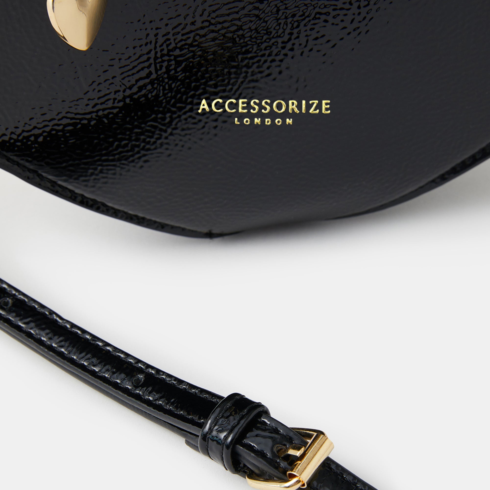 We've got a crush (on this handbag). Designed with a shiny patent finish, this bag is shaped like a love heart with two top handles and an optional strap to style like a crossbody. Features a zip fastening and gold-tone heart chain charm.