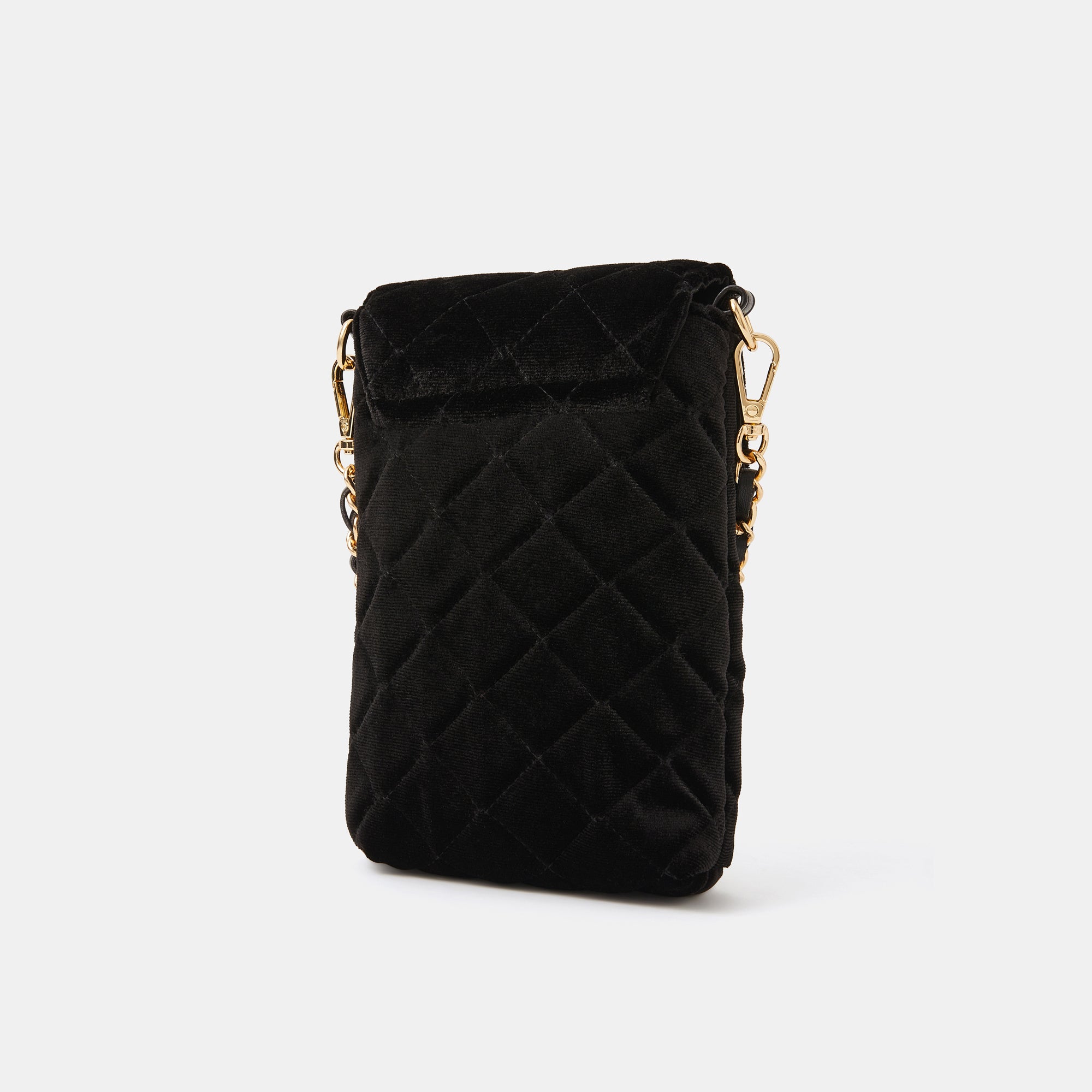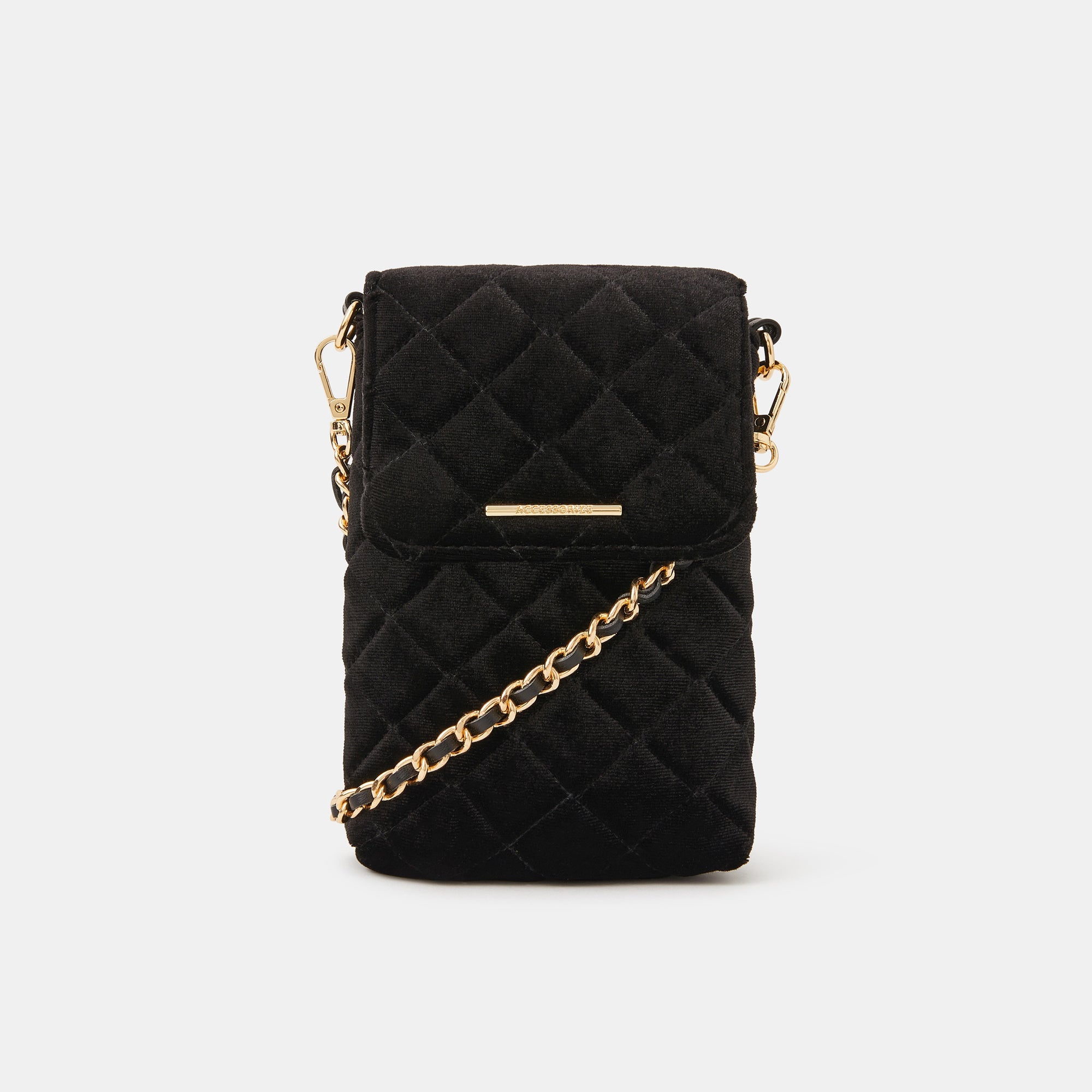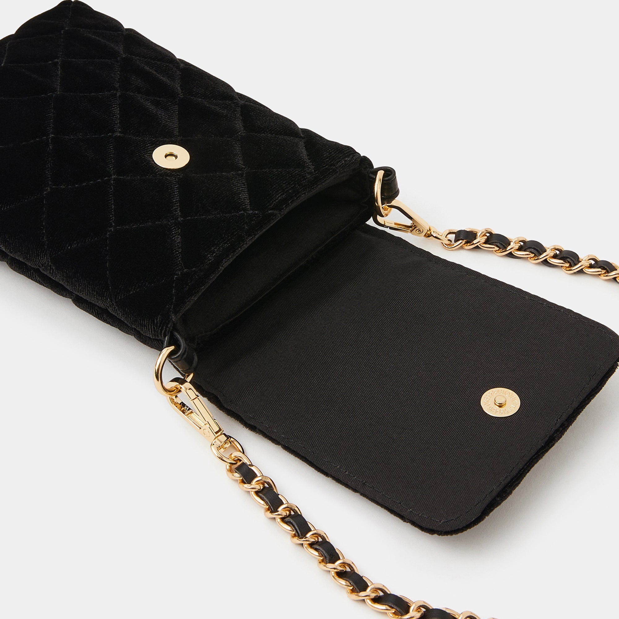 A practical and pretty place to keep your phone, keys and cards safe. This compact velvet bag fastens with a fold-over flap and sits across the body with a chain strap.