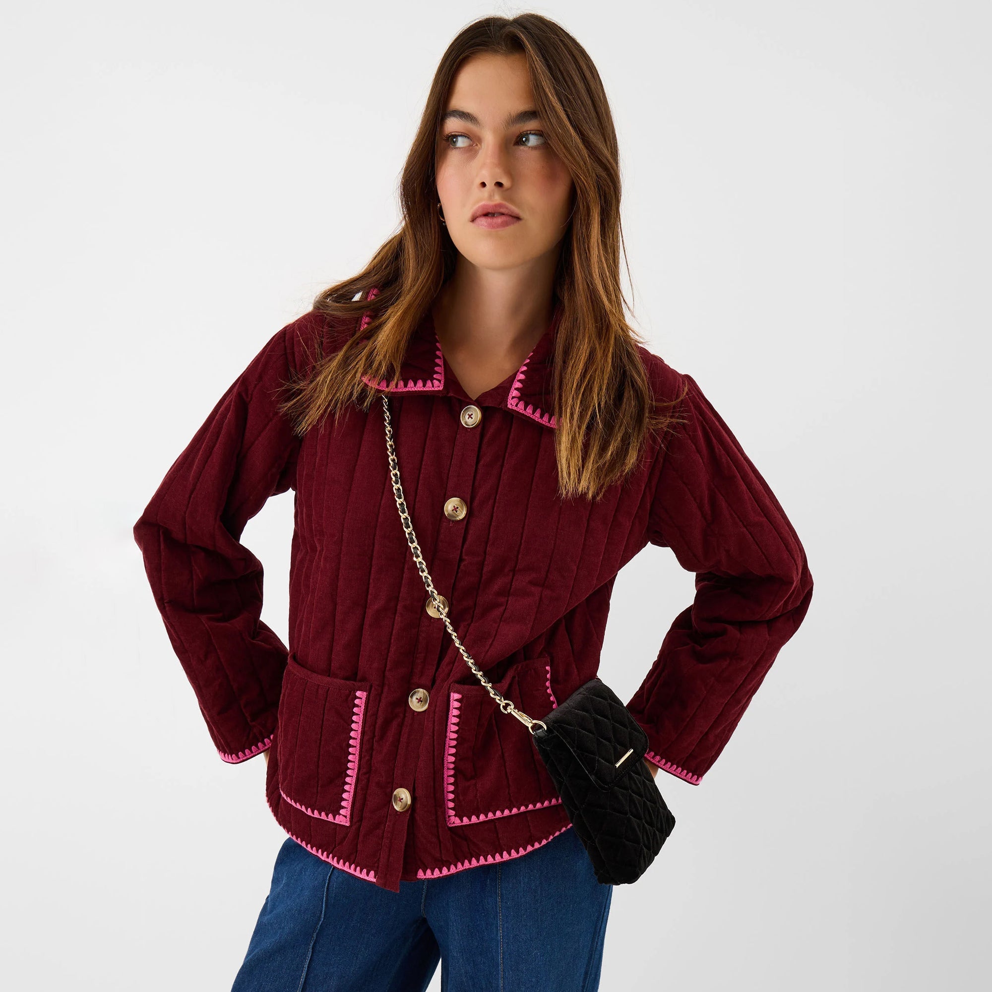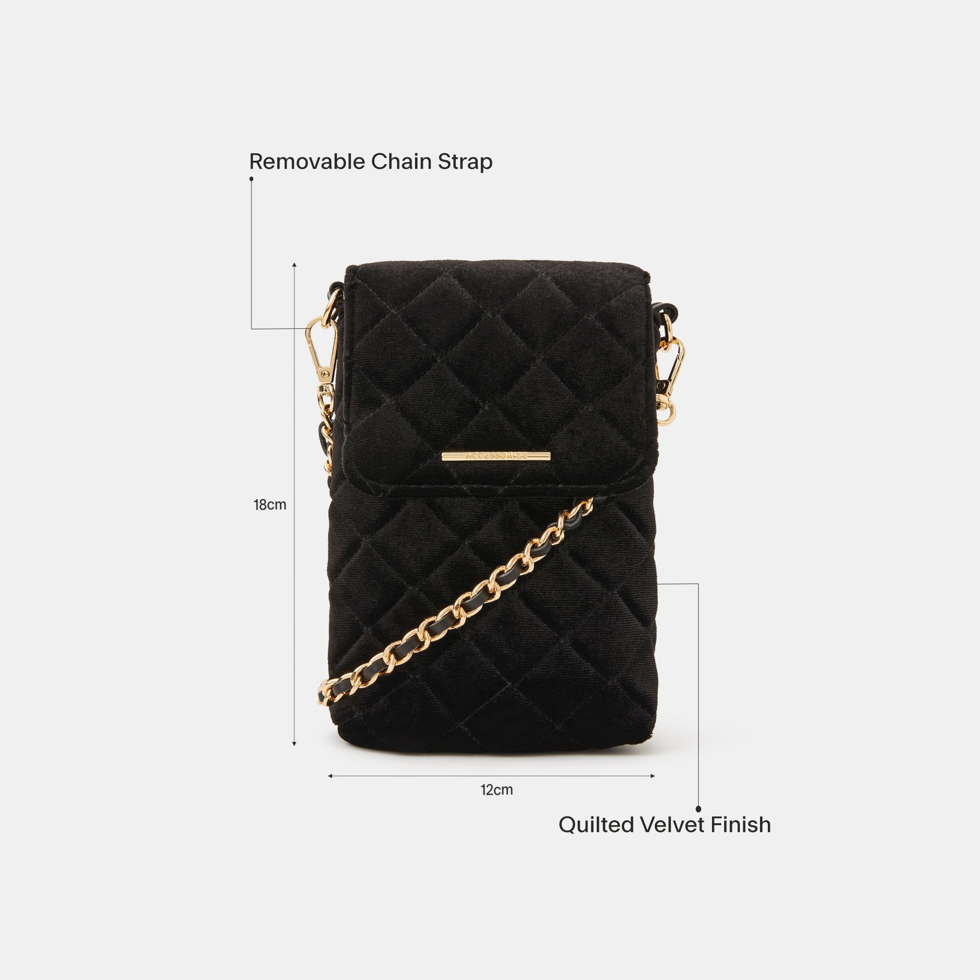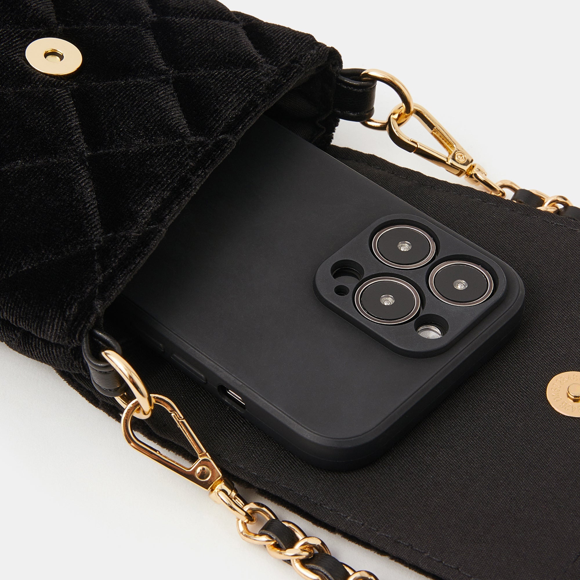 A practical and pretty place to keep your phone, keys and cards safe. This compact velvet bag fastens with a fold-over flap and sits across the body with a chain strap.