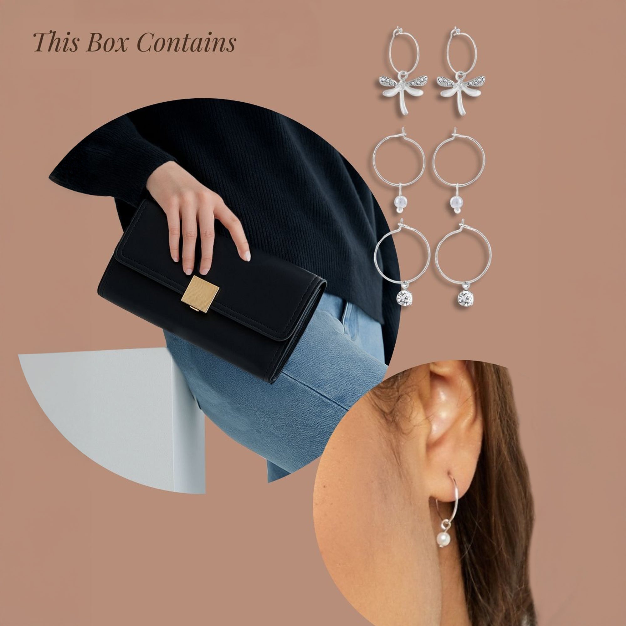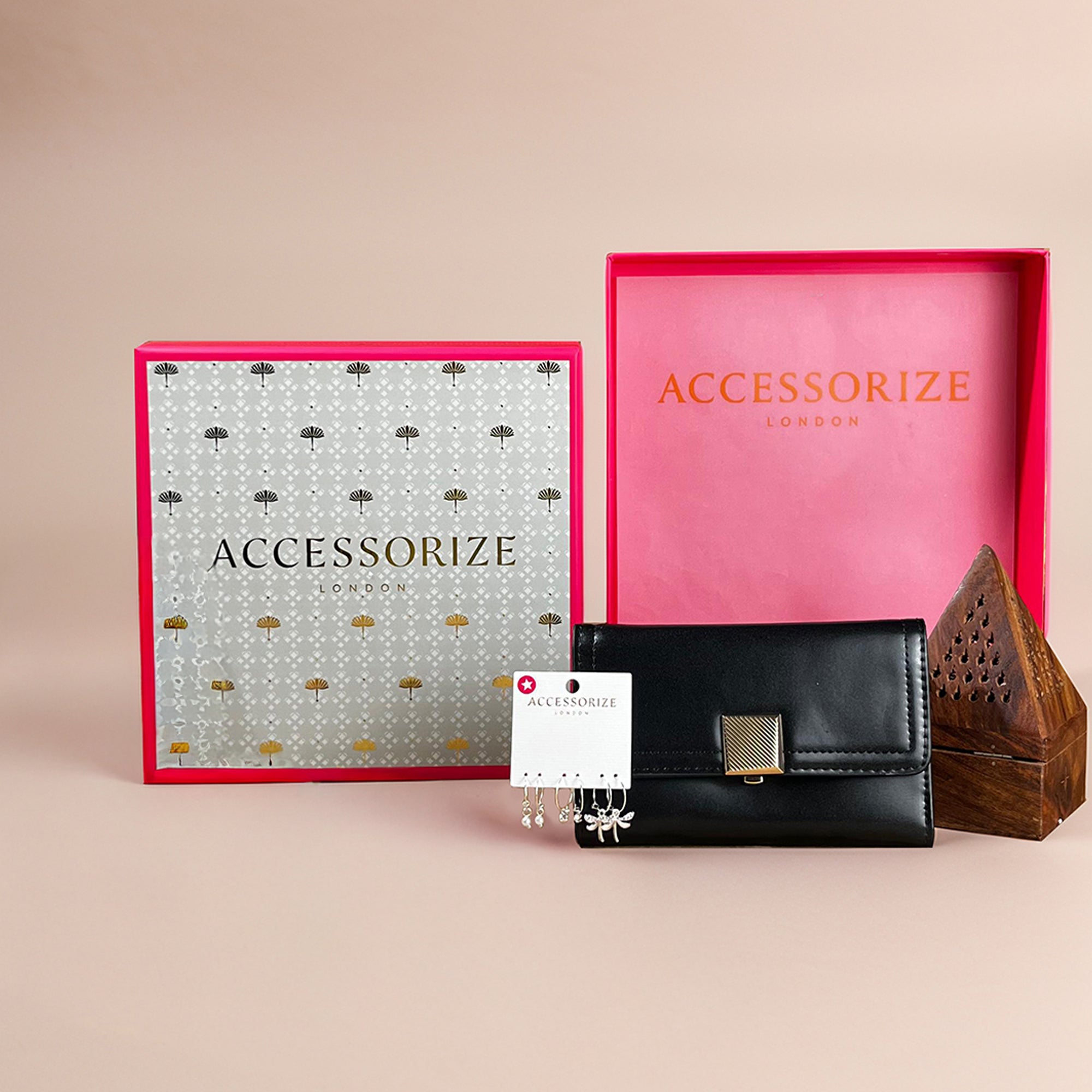 Celebrate the joy of gifting with this exclusive Accessorize London Women combo set, featuring a timeless black textured wallet paired with a chic set of 3 silver hoop earrings. Thoughtfully curated as a Diwali gift hamper box, this combo blends elegance with functionality—perfect for your sister or loved ones. The wallet offers a sleek, spacious design for everyday use, while the versatile earrings add a hint of sparkle to any look. Ideal for festive gifting, this gift hamper box makes a stylish statement she’ll cherish.