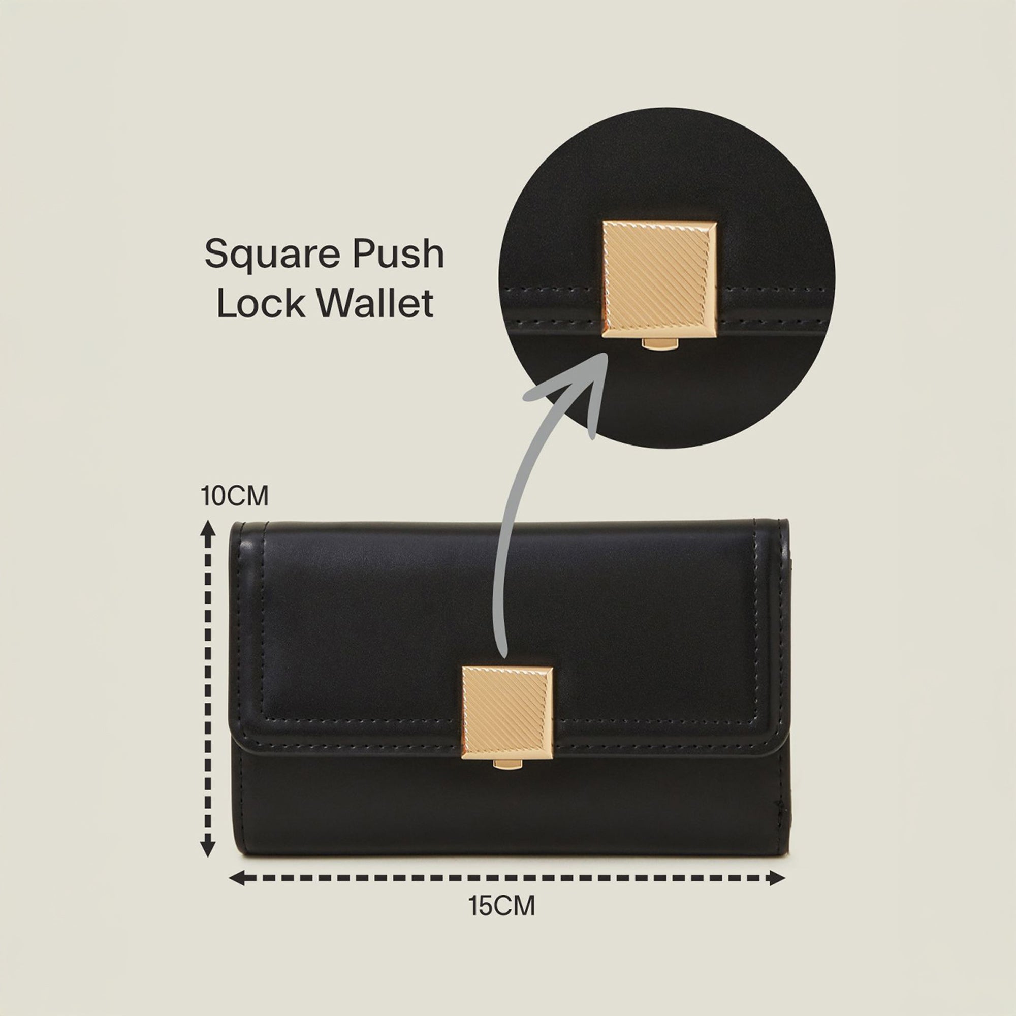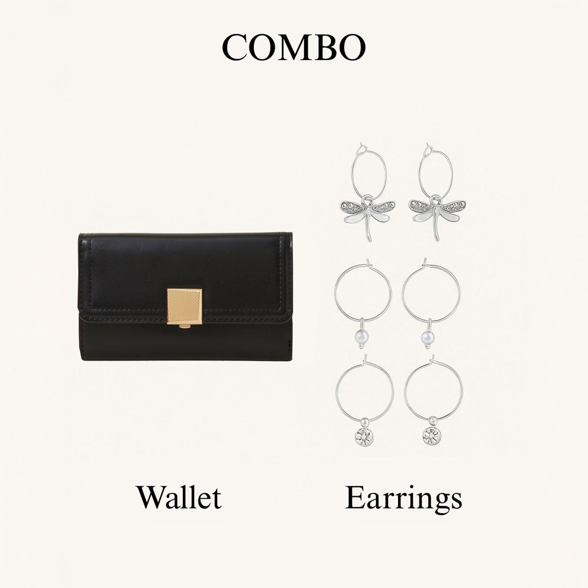 Black Textured Women Wallet & Set of 3 Silver Hoop Earrings Combo (Diwali Gift Hamper Box)