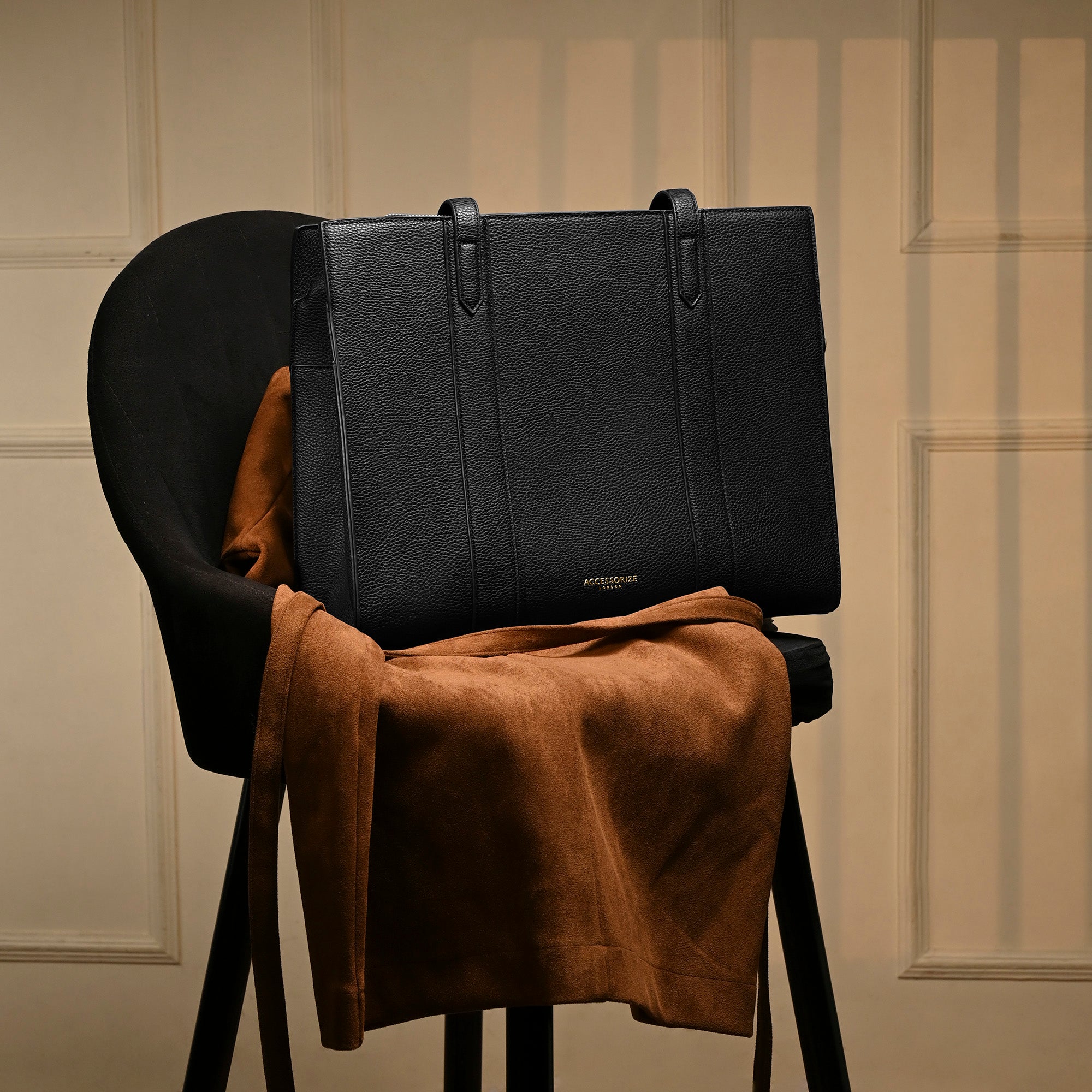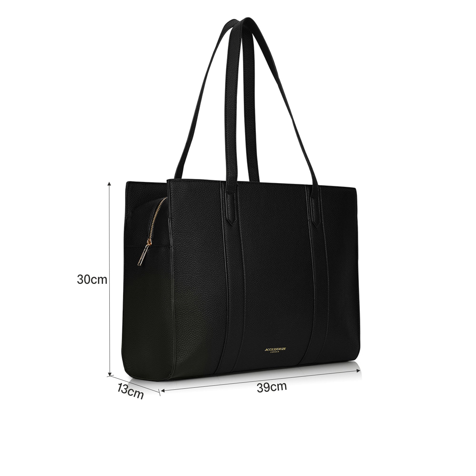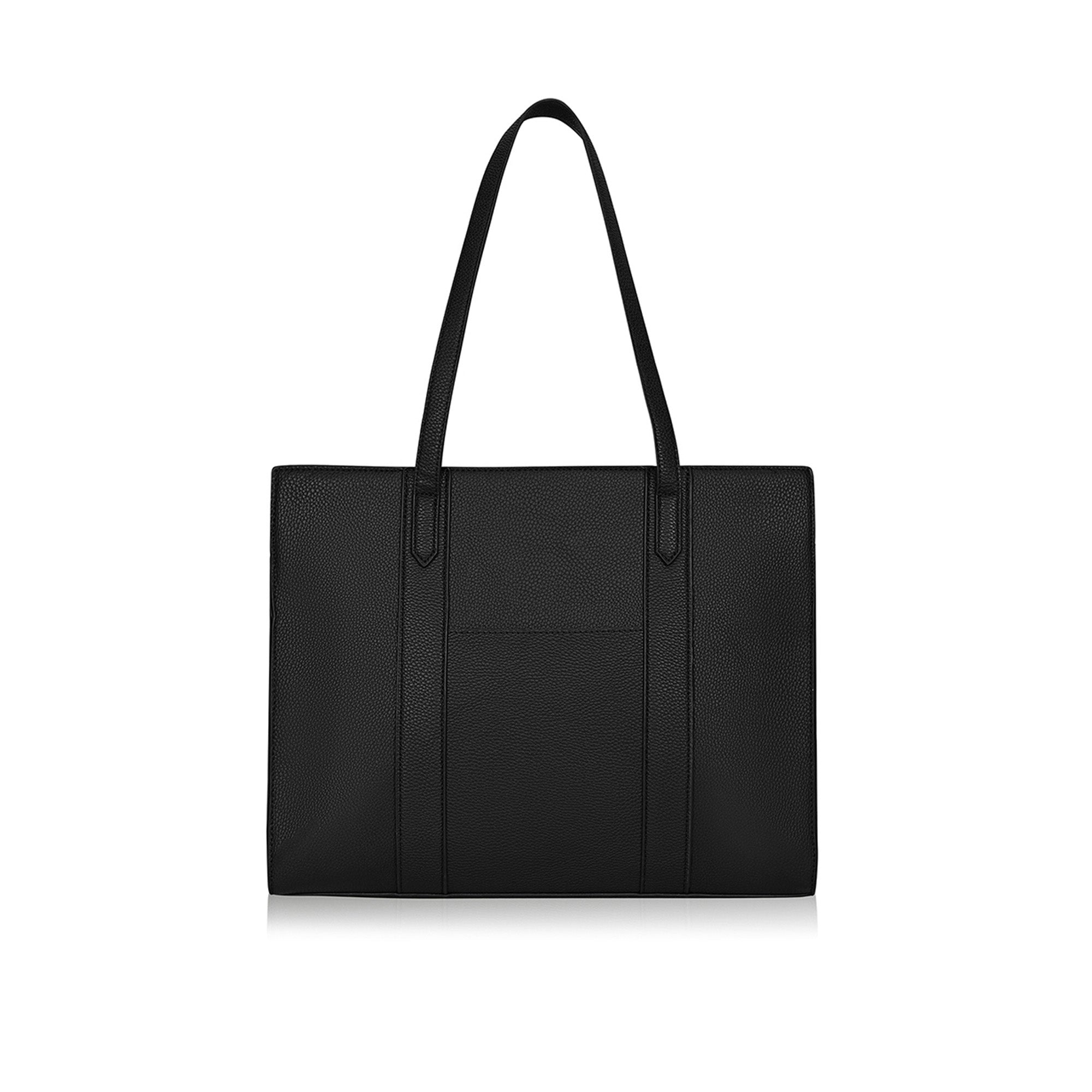 This black tote bag is a timeless and versatile accessory, crafted from textured faux leather that exudes sophistication and durability. Its structured design, reinforced with vertical stitched panels, gives it a polished and refined look, making it ideal for work, travel, or everyday use. The spacious interior features multiple compartments, including a secure zippered section, providing ample storage for essentials, while an exterior slip pocket allows quick access to frequently used items. Designed for comfort and practicality, the long shoulder straps ensure ease of carrying. The rich black hue complements both casual and formal outfits, and the gold-tone hardware adds a touch of elegance. Pair this tote with tailored workwear for a chic office look or style it with denim and a neutral-toned top for an effortlessly stylish weekend ensemble.