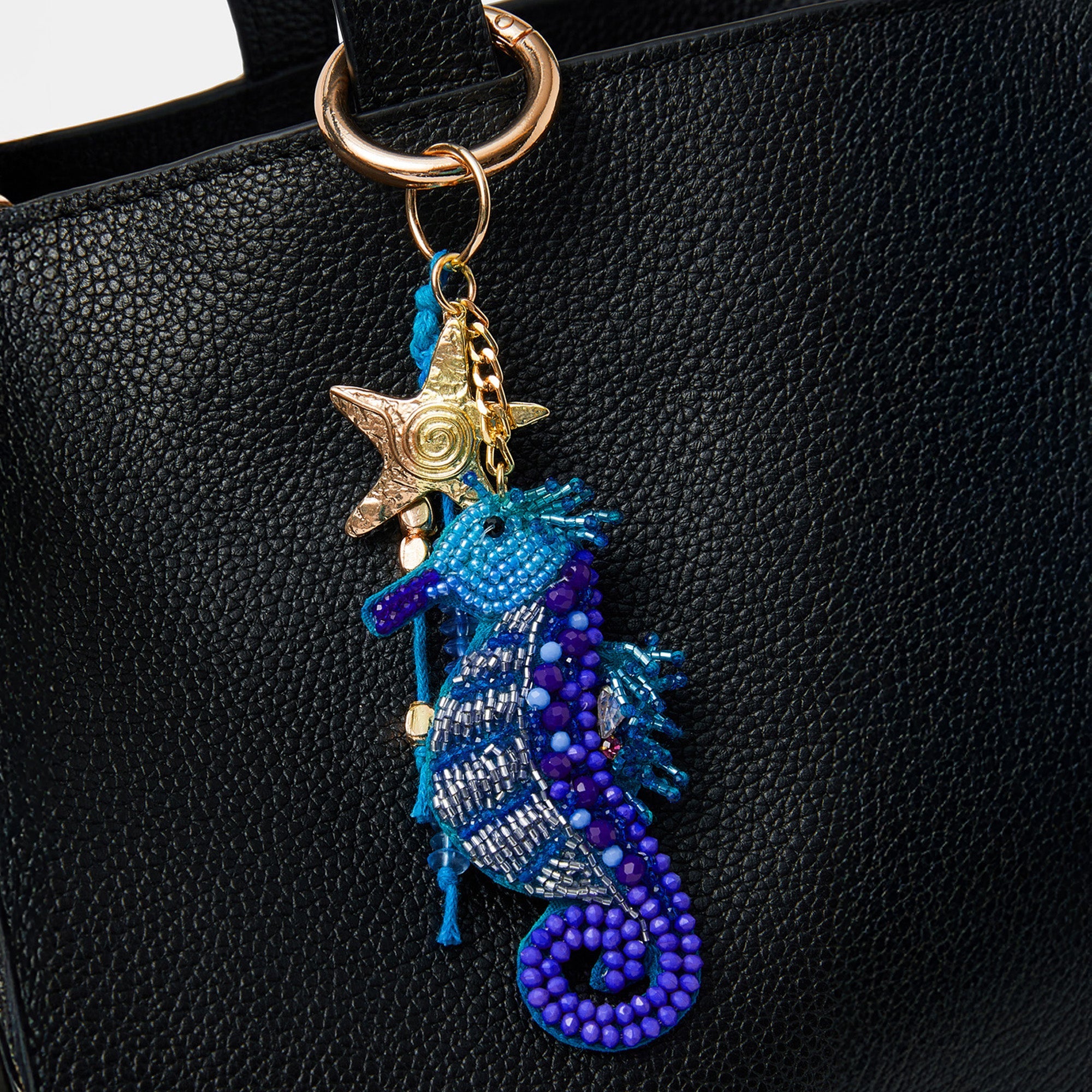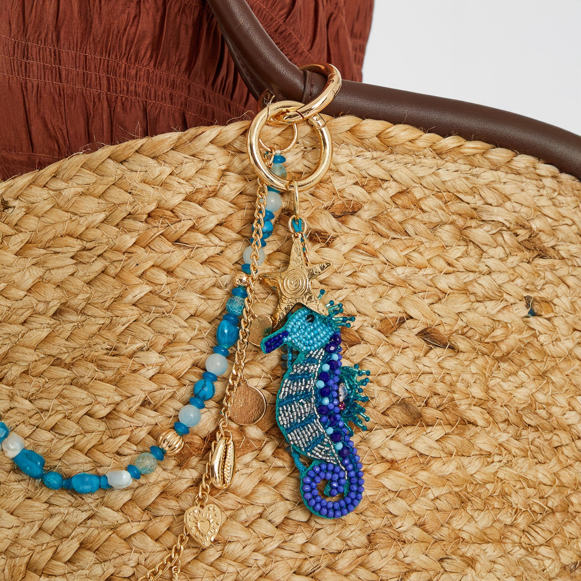 A cute accessory to attach to your beach bag, this charm features a blue beaded seahorse with a golden starfish and beads dangling from blue cords. Attach with the round clip fastening.