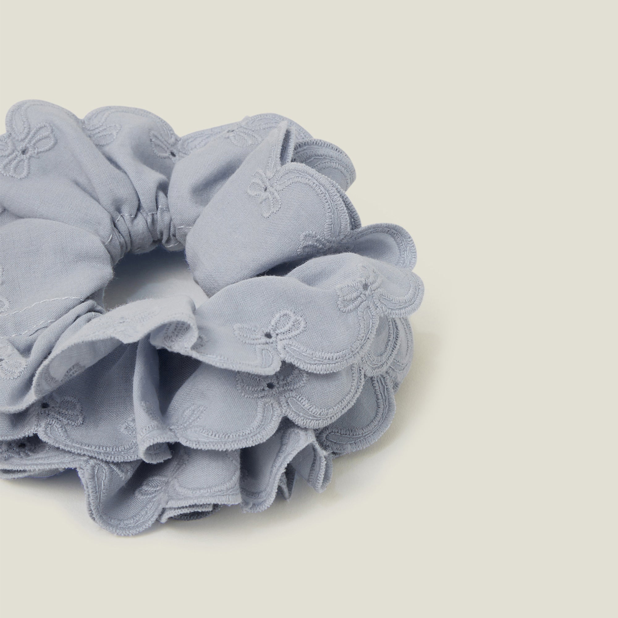 Frills, frills and more frills, please! Designed with layers of scalloped fabric in dusty blue, this hair scrunchie is decorated with bow broderie detailing.
