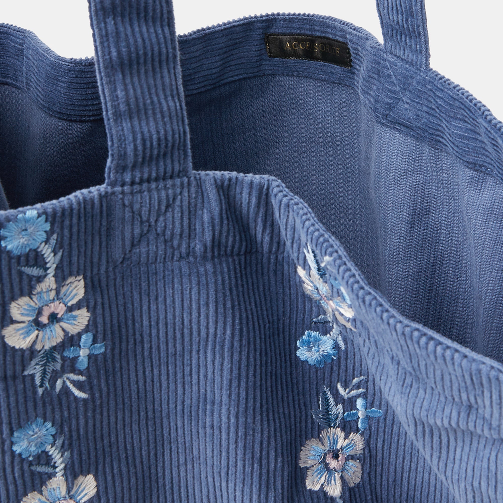 The perfect pick for those who love pretty details, this Blue Floral Embroidered Cord Shopper Bag is both stylish and functional. Crafted from soft blue corduroy fabric, it is beautifully adorned with delicate rows of floral embroidery that add a touch of charm. Designed with two sturdy shoulder straps and an open-top style, this shopper offers easy access and spacious storage for your daily essentials. Ideal for casual outings, work, shopping, or travel, it blends everyday practicality with feminine elegance.
