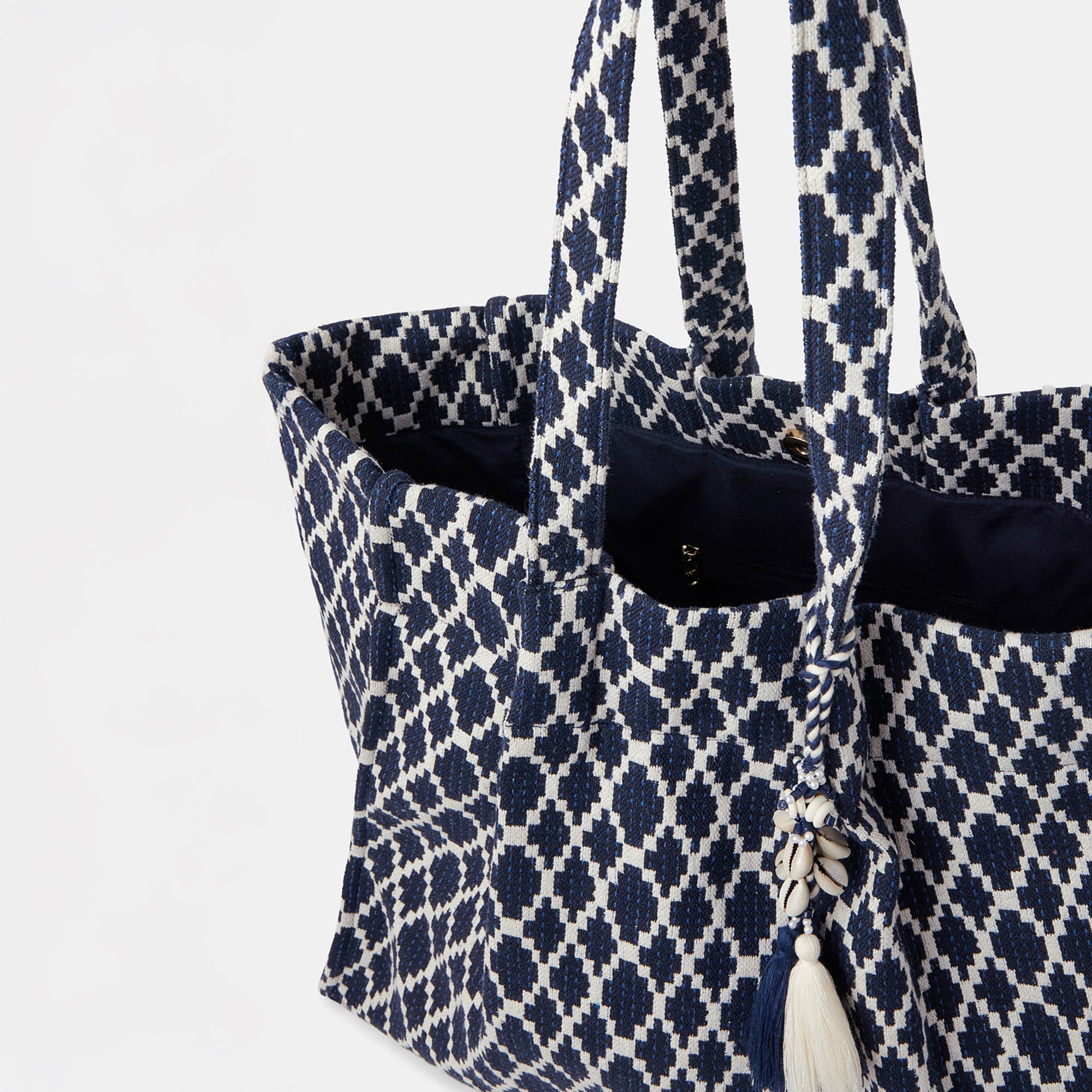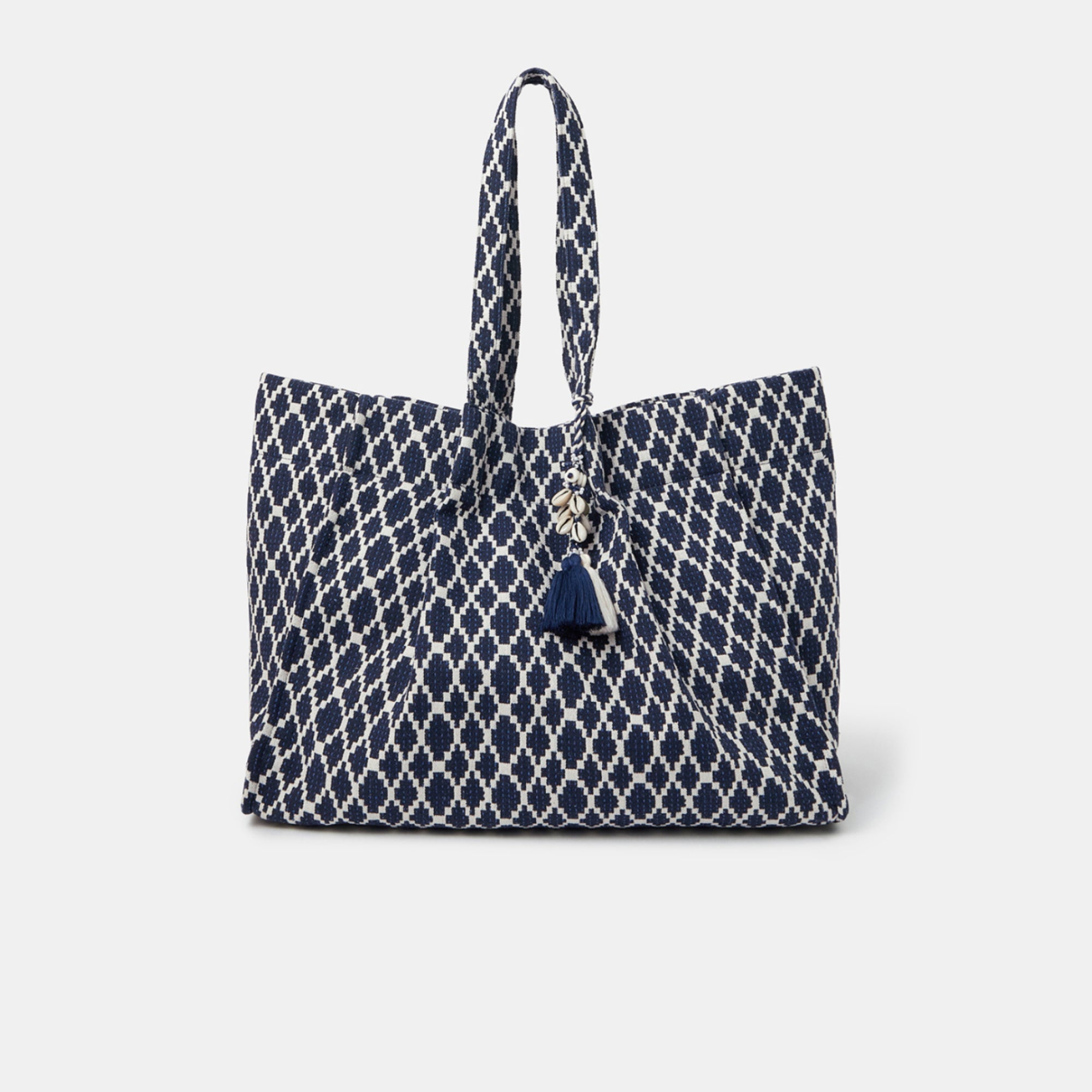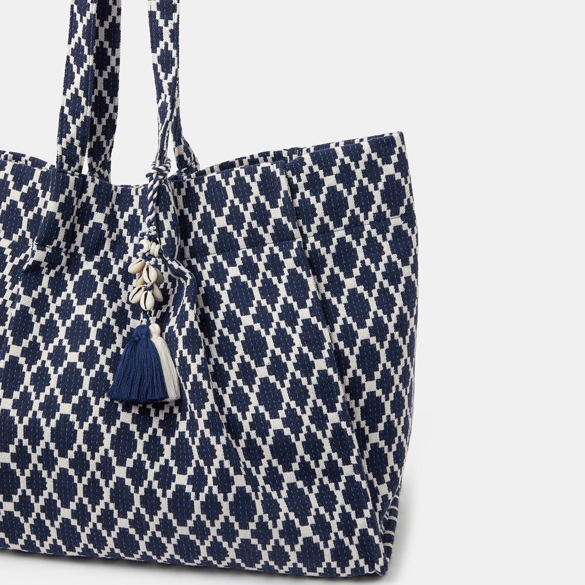 A bold choice for carrying all your summer holiday essentials, this tote bag is woven with geometric patterns in a colour to match the deep ocean waters. Features a magnetic button fastening and seashell tassel charms dangling from the shoulder straps.