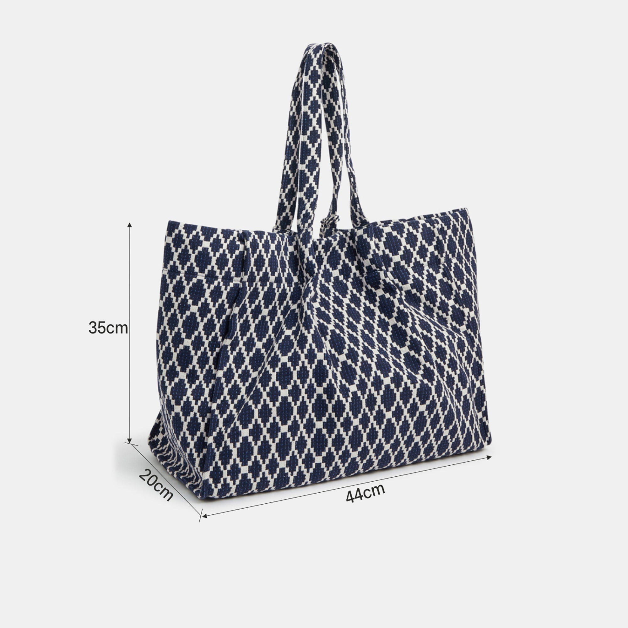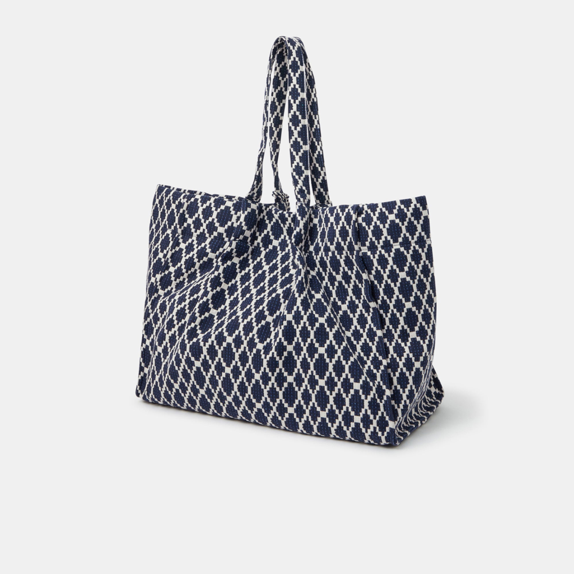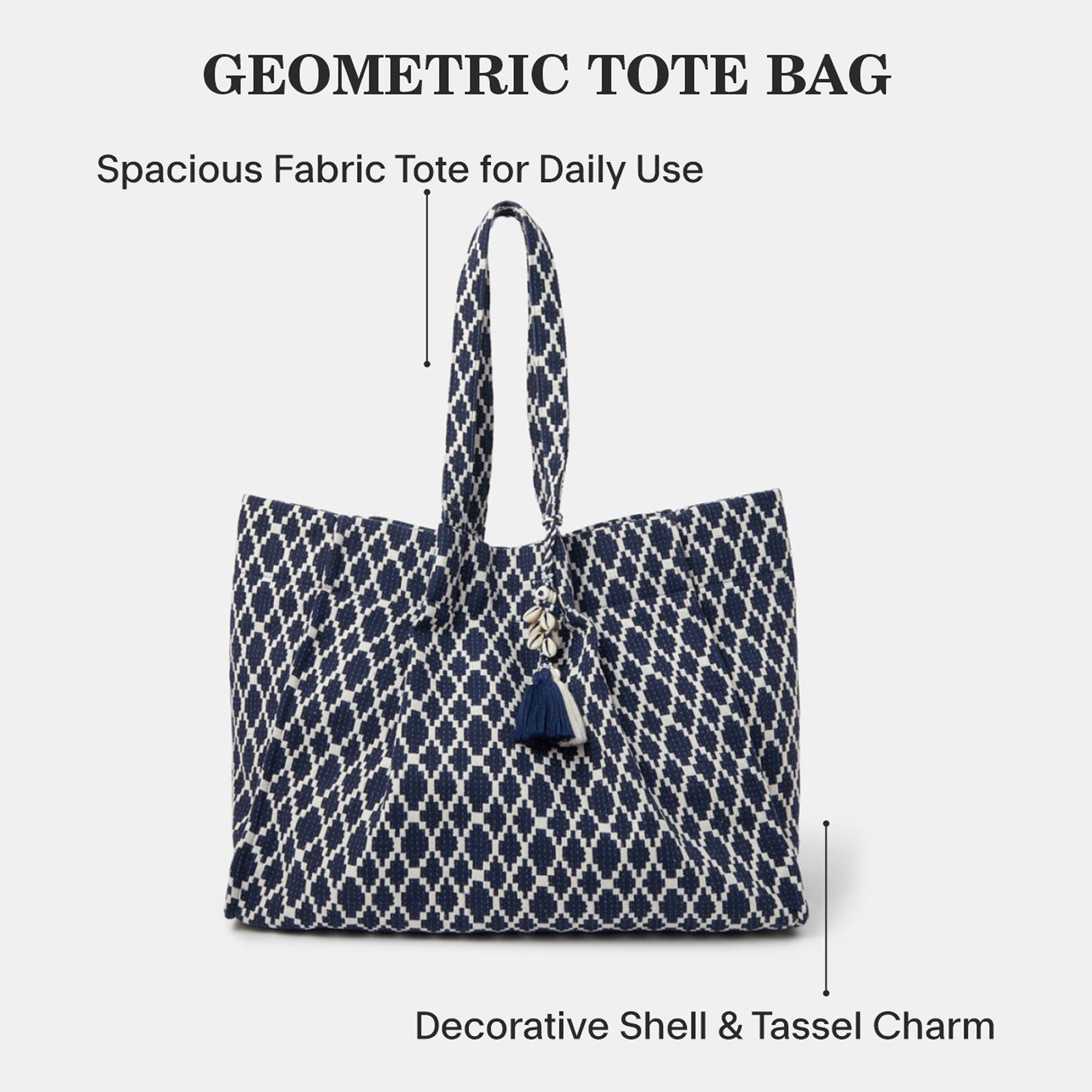 A bold choice for carrying all your summer holiday essentials, this tote bag is woven with geometric patterns in a colour to match the deep ocean waters. Features a magnetic button fastening and seashell tassel charms dangling from the shoulder straps.