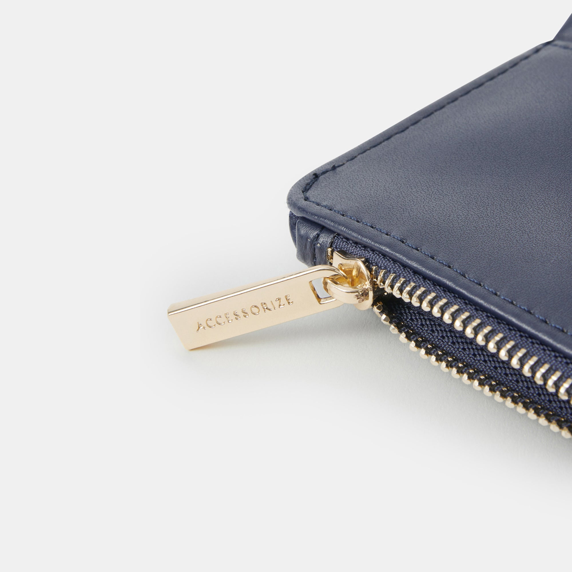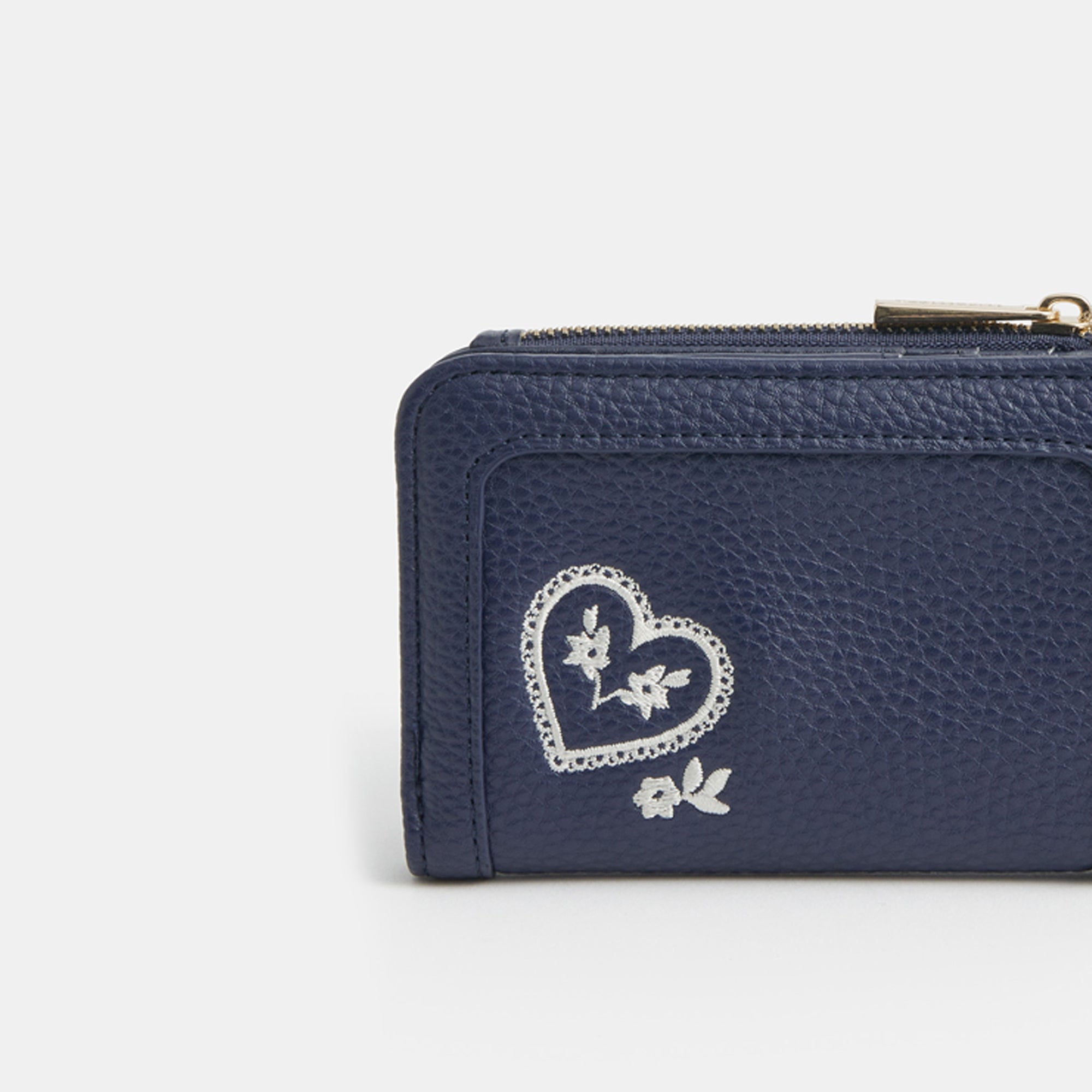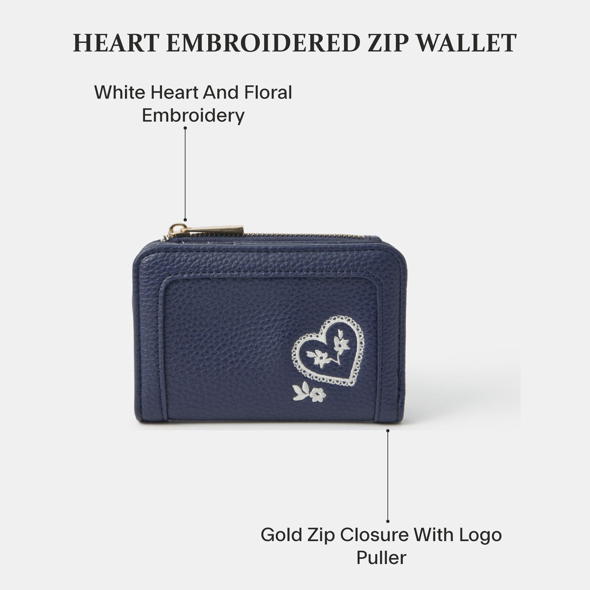 Add a touch of charm to your everyday essentials with this Paisley Heart Embroidered Purse. Designed in soft faux leather, it features delicate heart embroidery on a compact silhouette. With a secure zip closure and internal slots for cards, notes, and coins, it keeps your essentials neatly organised. The navy tone makes it versatile to pair with all your handbags and daily looks.