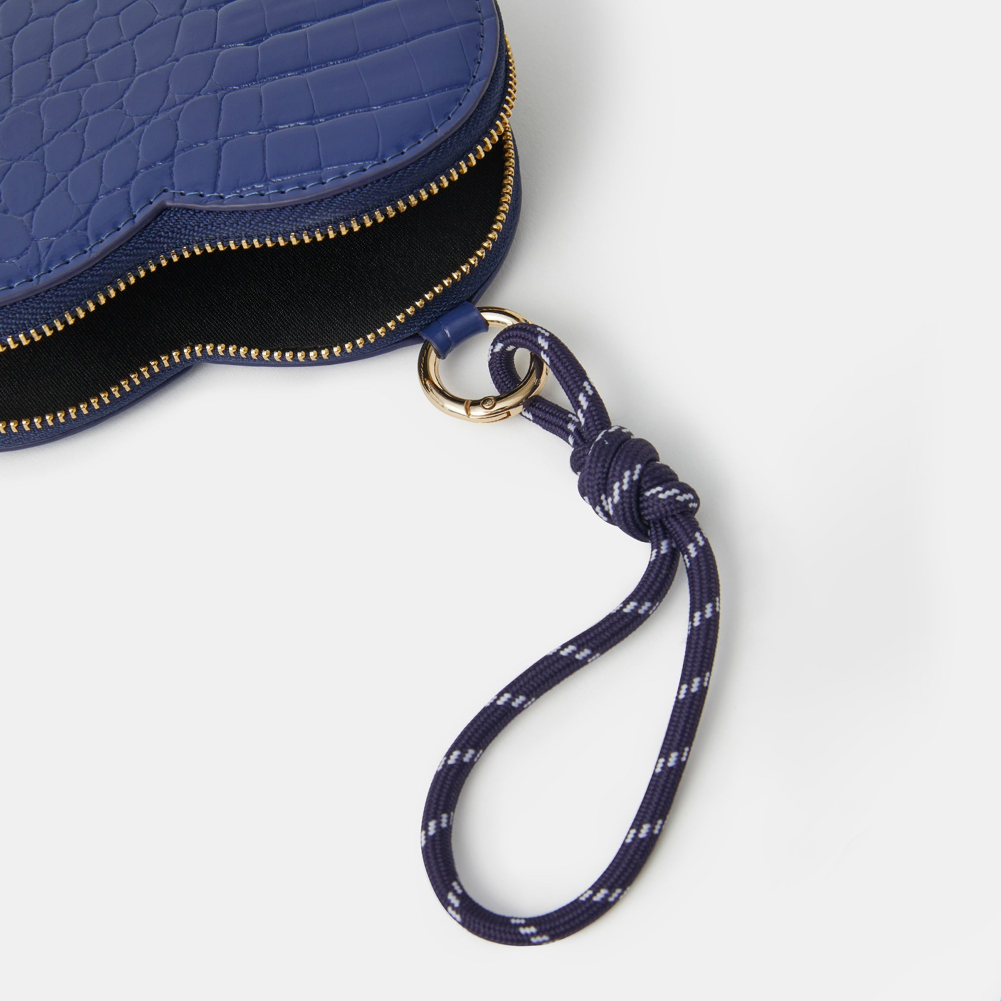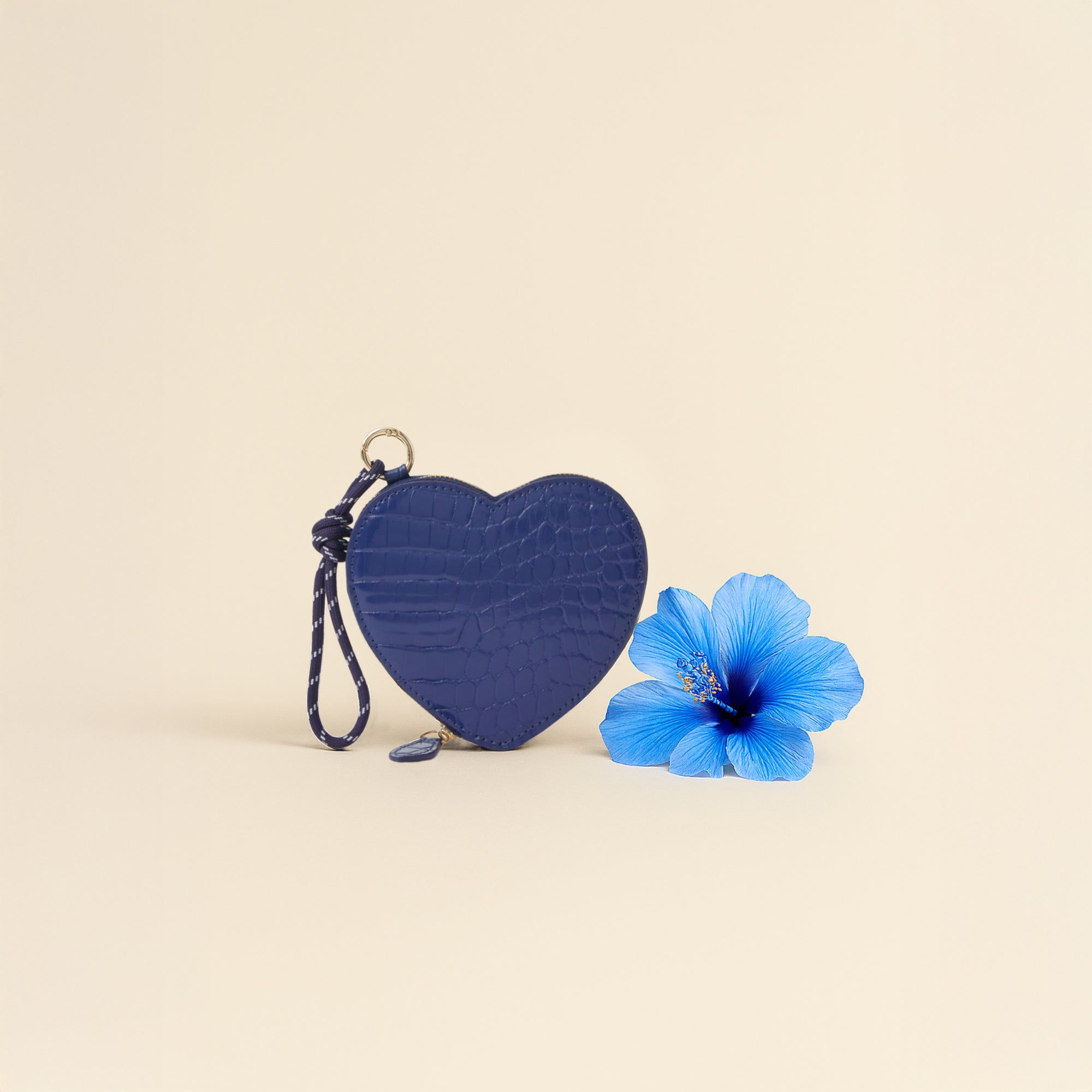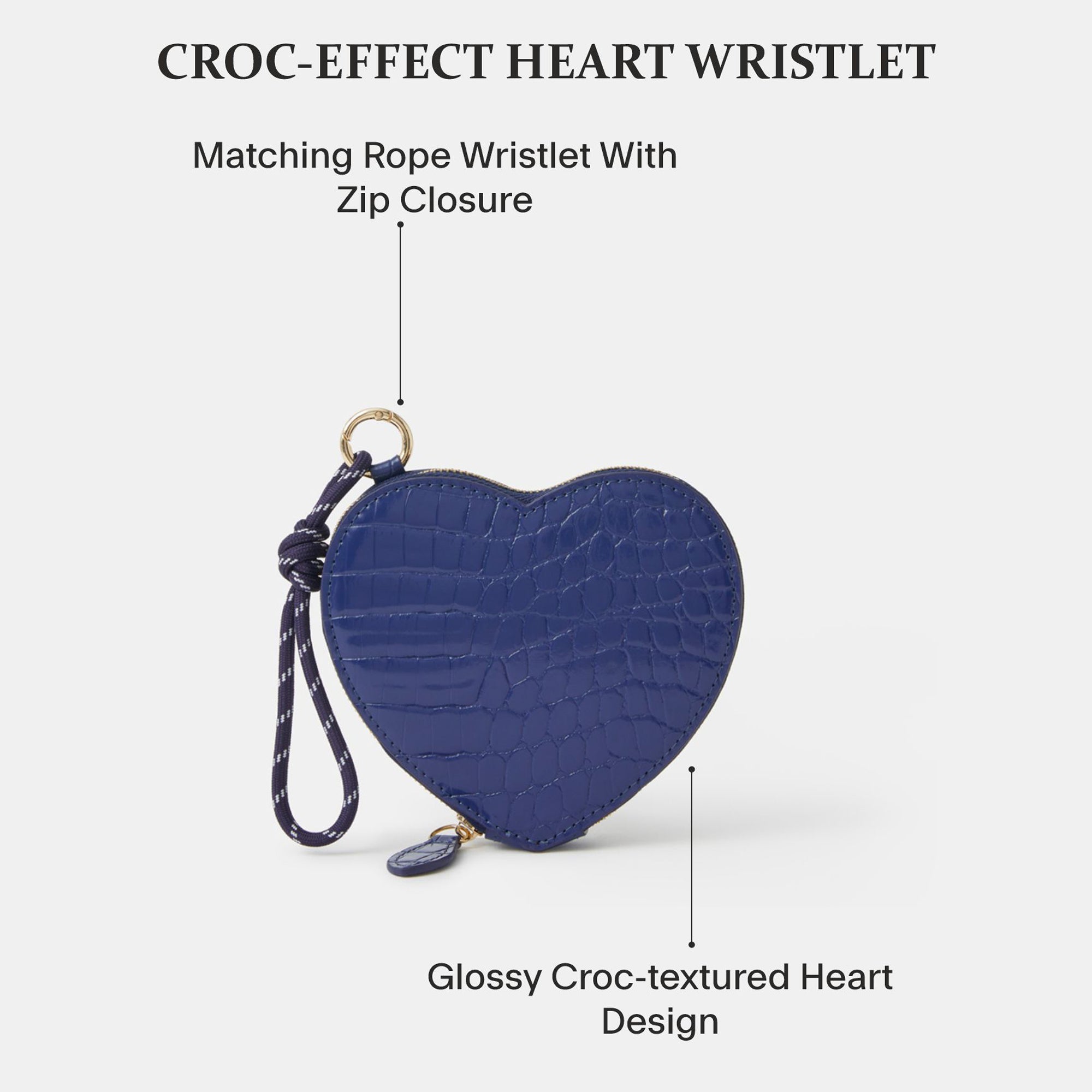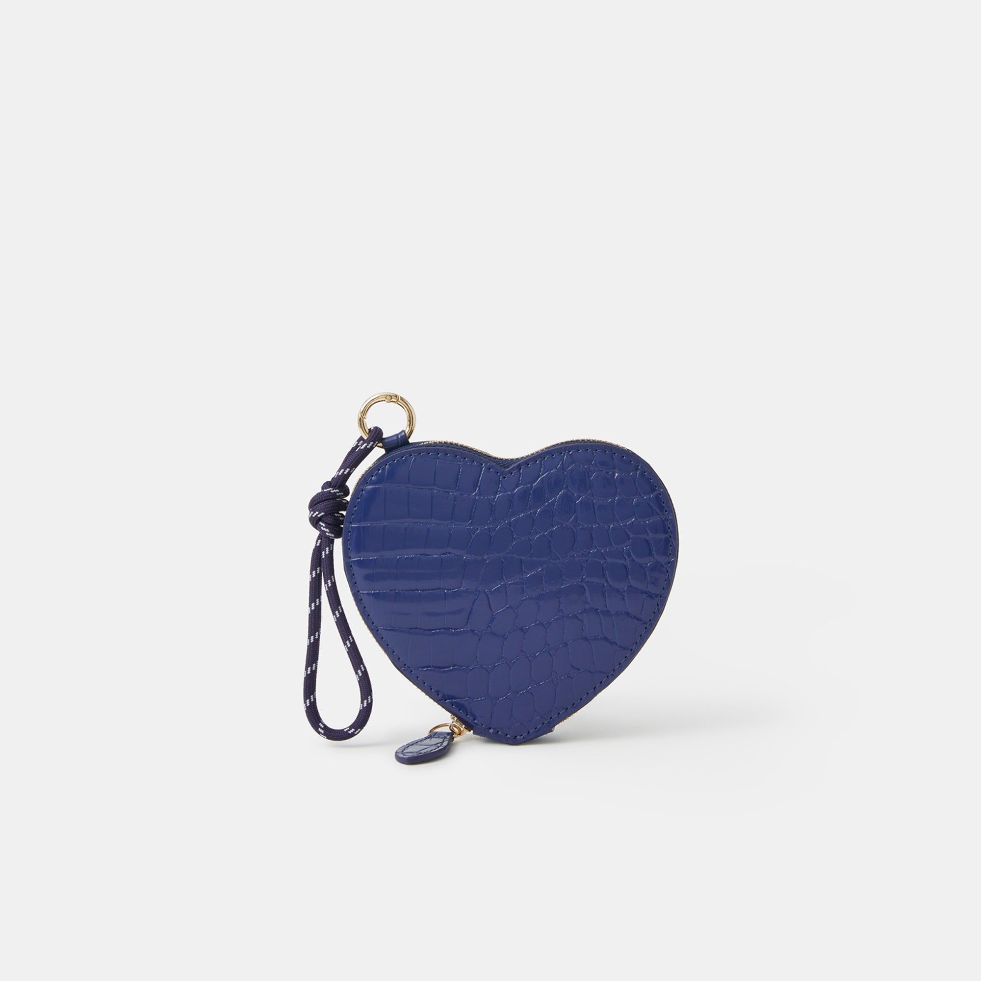 We've got a crush (on this cute purse). Shaped like a heart with a shiny patent finish, this purse features a main zip compartment and cord clip attachment to style it like a bag charm, too! Blue
