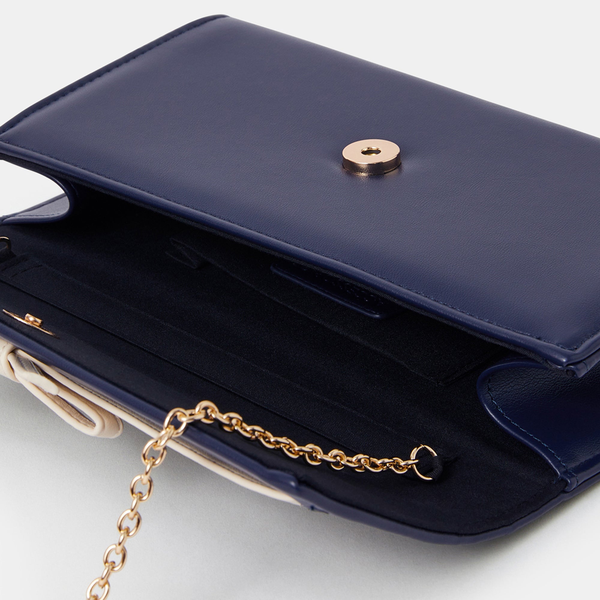 The perfect companion for those late dinner dates and special occasions. The beautifully buttery faux leather and fine gold metal strap work together to create a high-class accessory that'll go with just-about-anything! Style it over the shoulder or tuck the strap in for a handheld option.