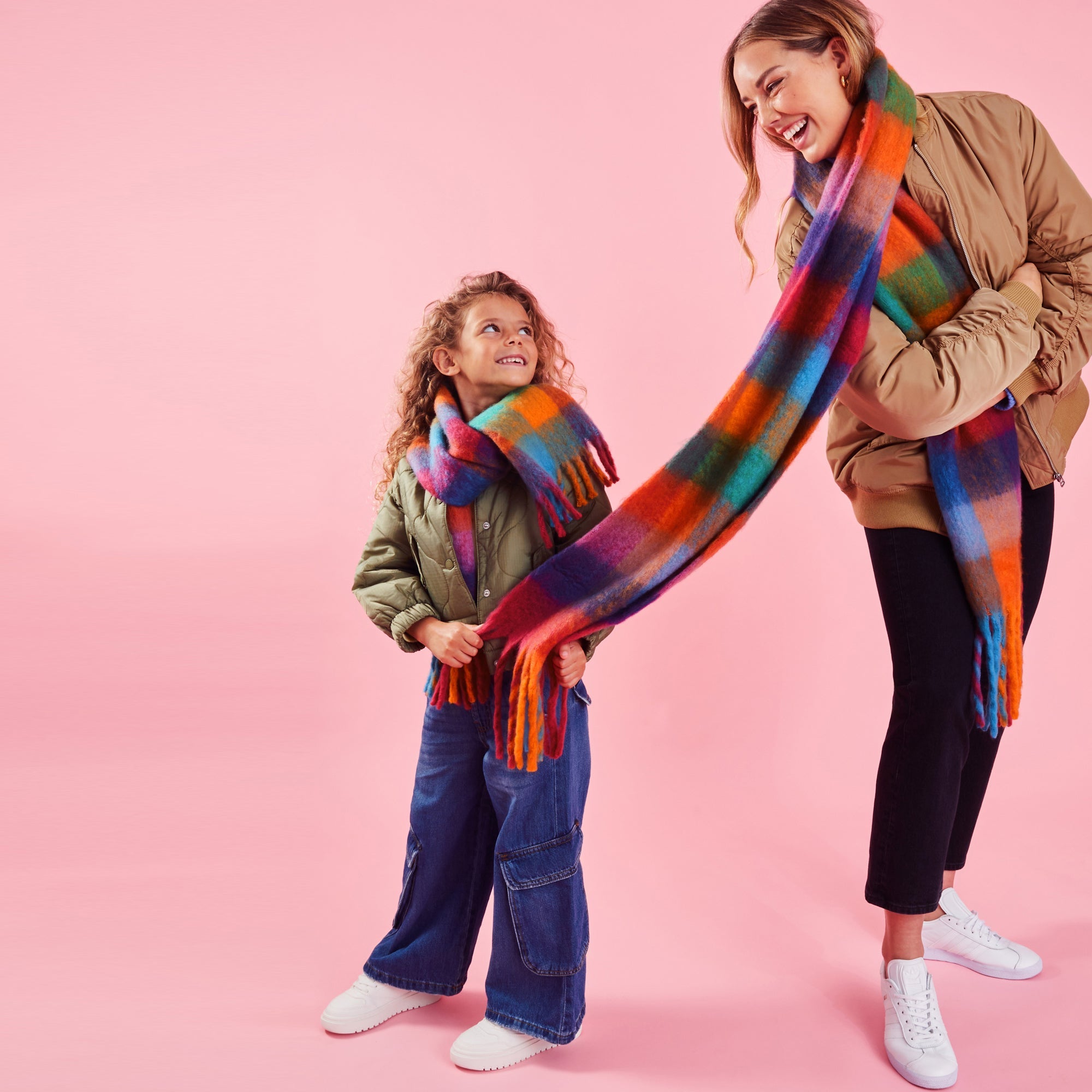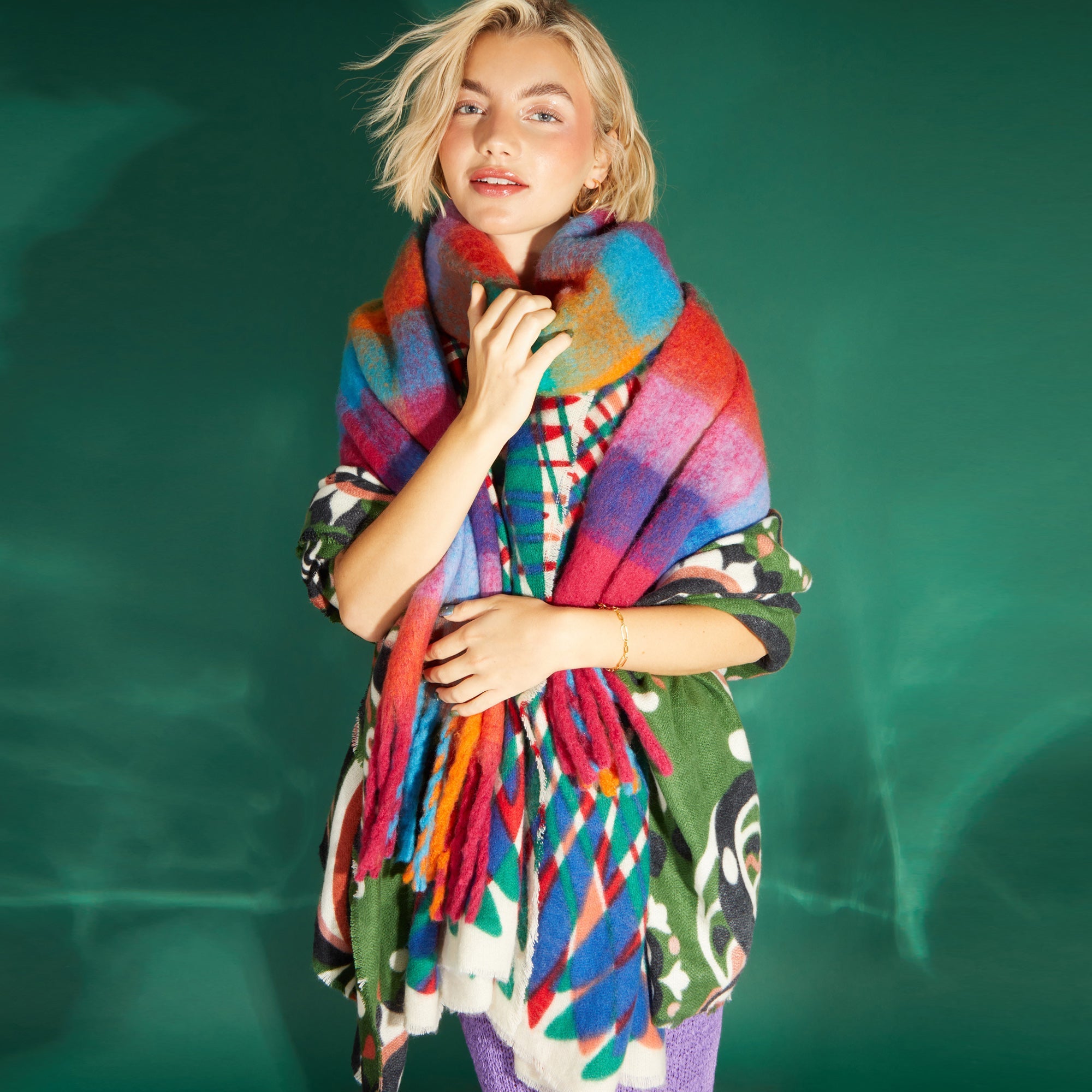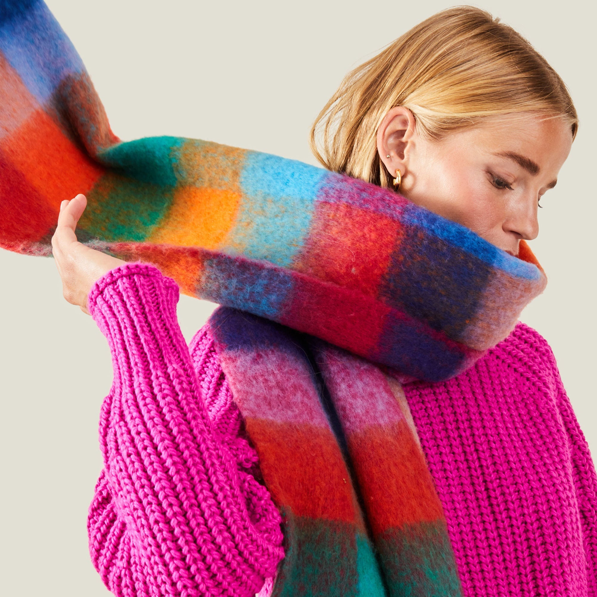 Gloomy days need bright colours, so opt for this scarf for a vibrant finish and cosy fit. Finished with a check print and tassel edges.