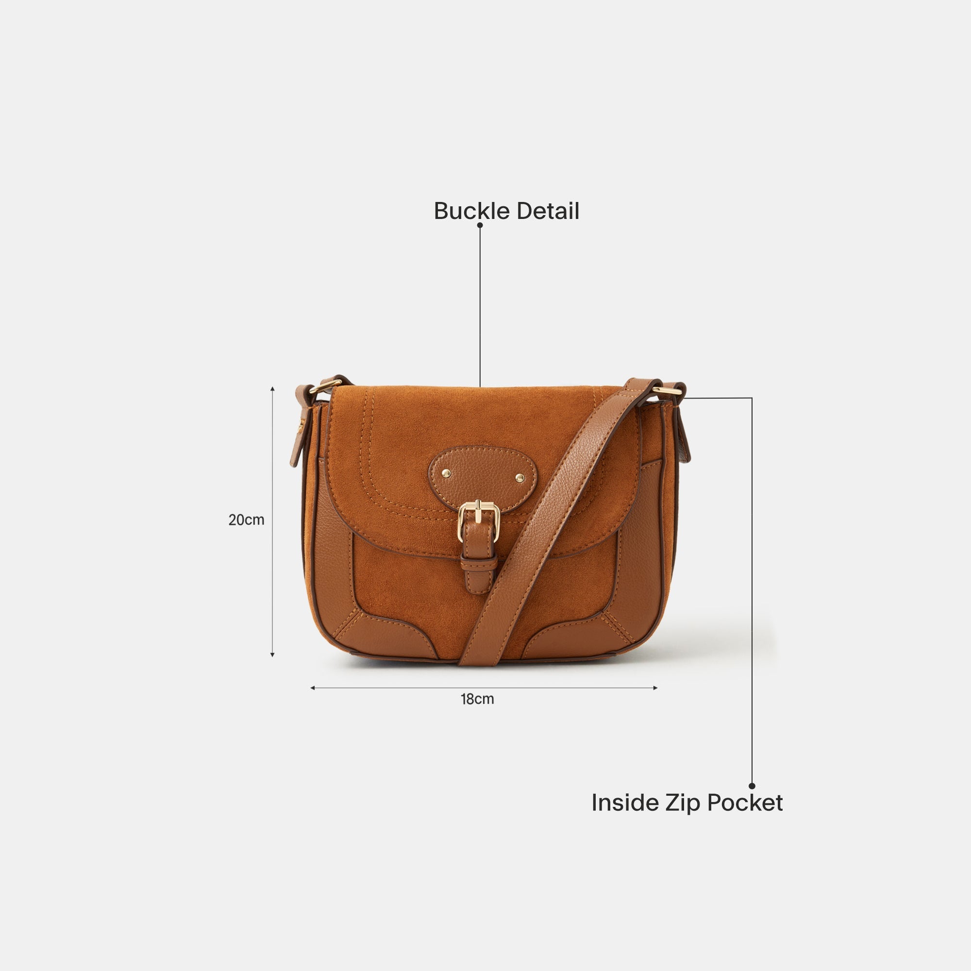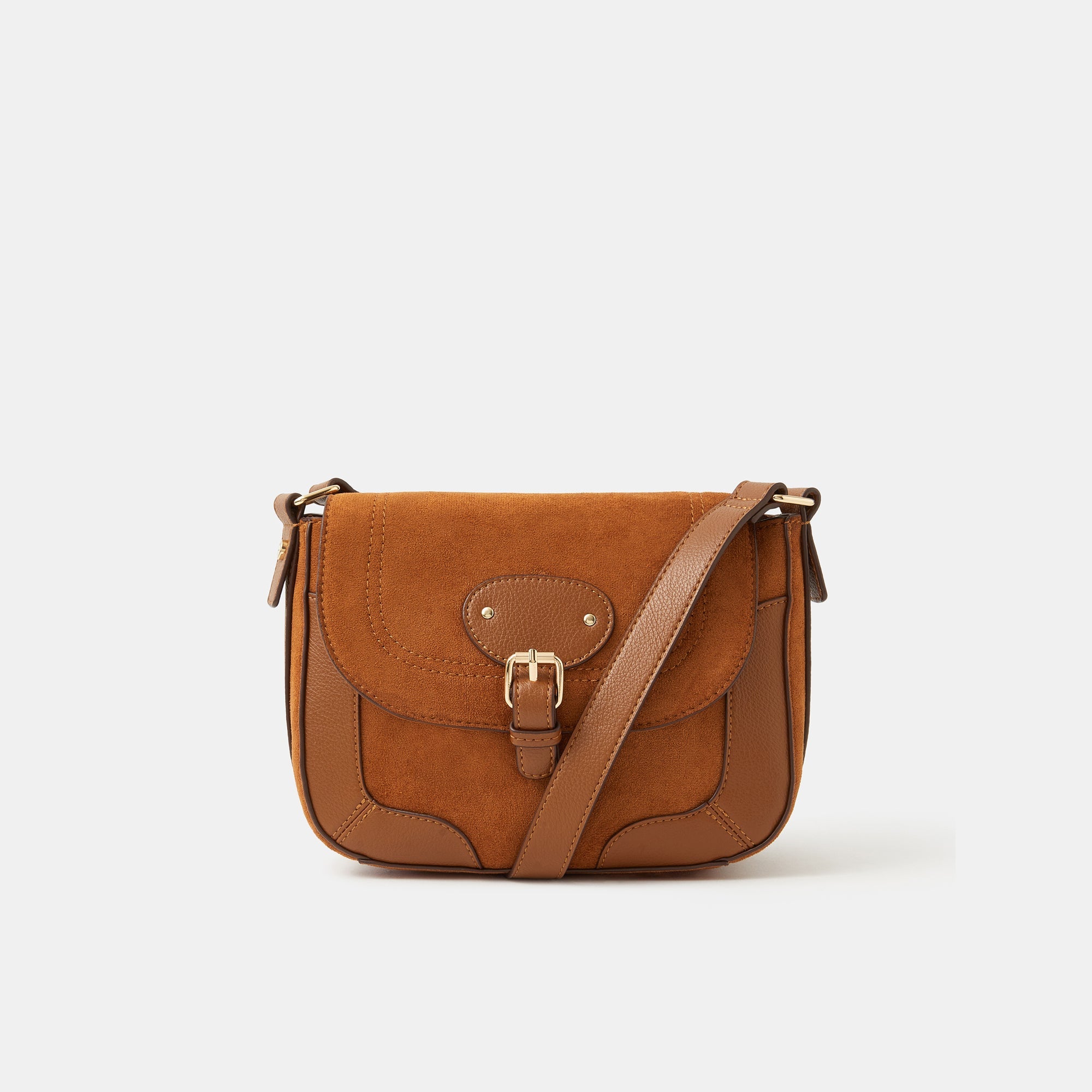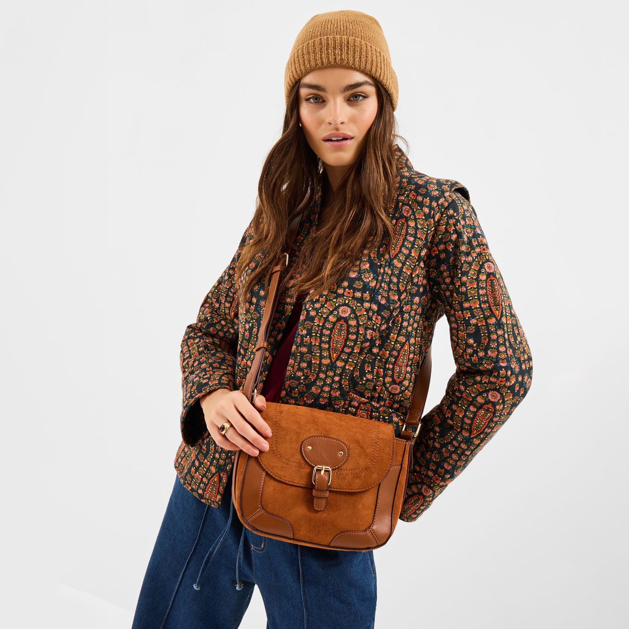 A timeless pick you can rely on season after season, this saddle bag offers a soft suedette finish with a faux leather buckle detail. Fastening with a magnetic button closure, it features a small zip pocket inside with an adjustable crossbody strap. Brown