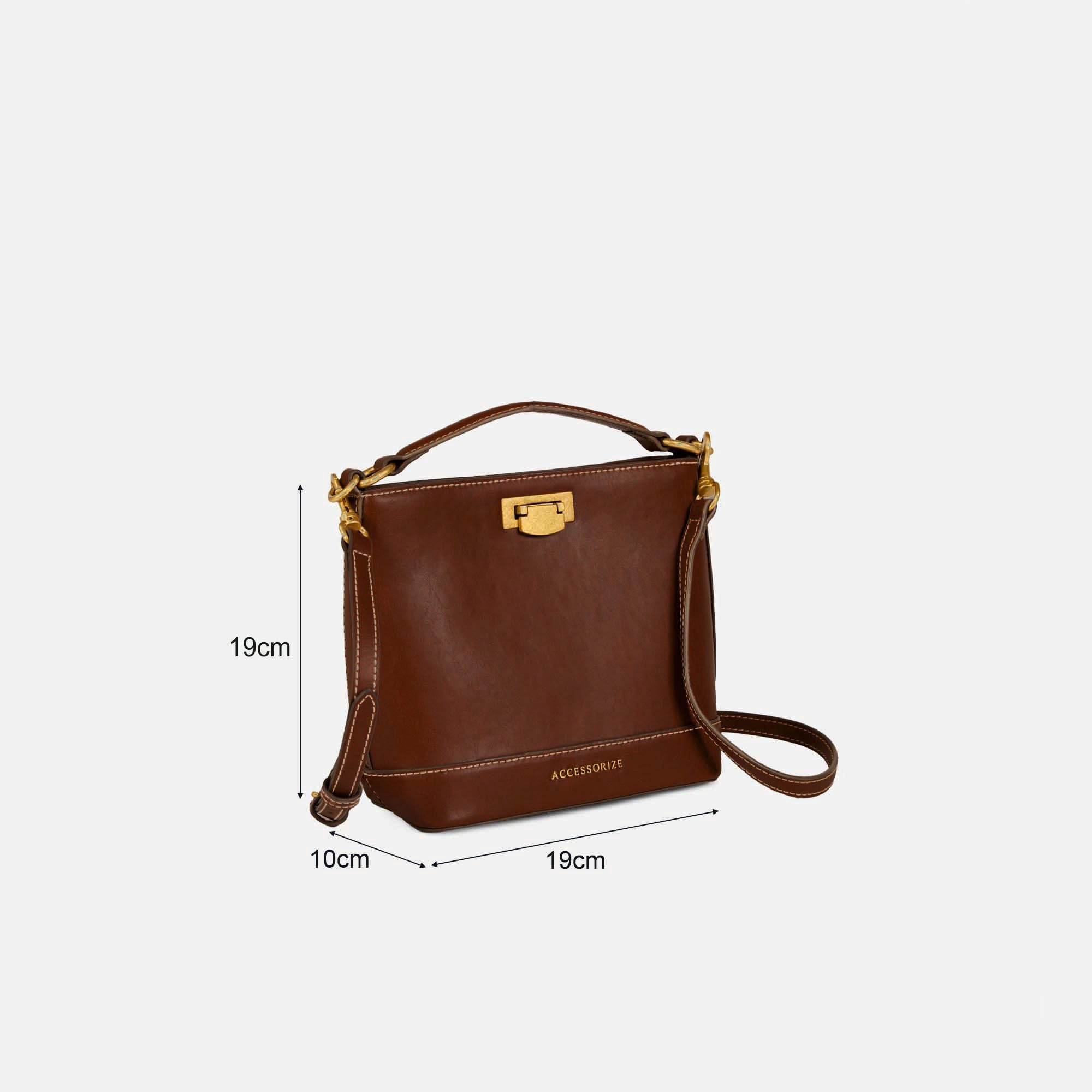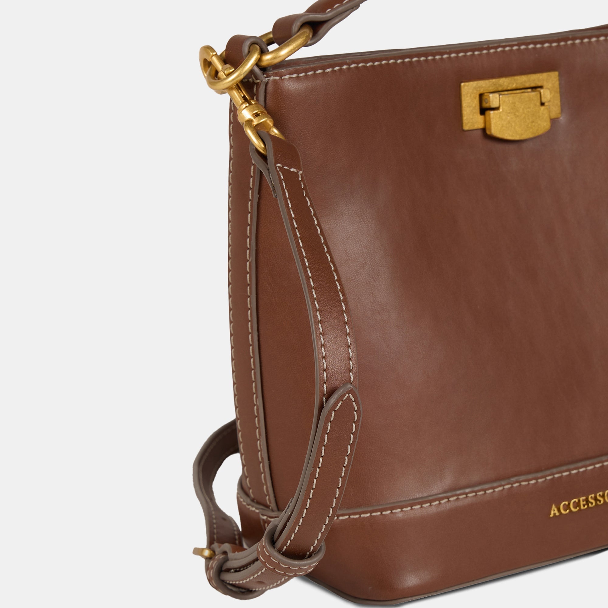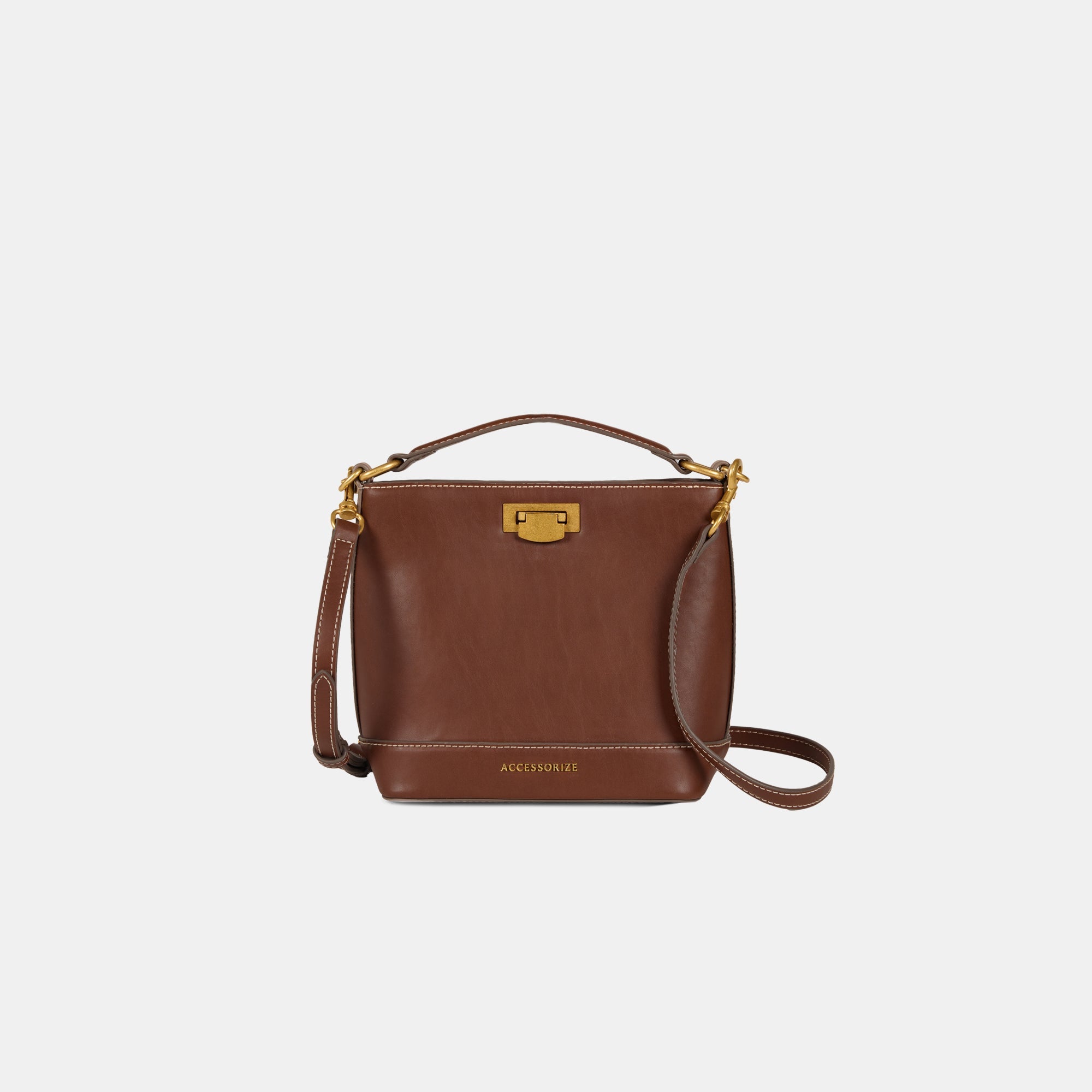 A chic tan structured sling bag with top handle, gold-tone hardware, and versatile cross-body strap — perfect to add timeless elegance to your everyday looks.