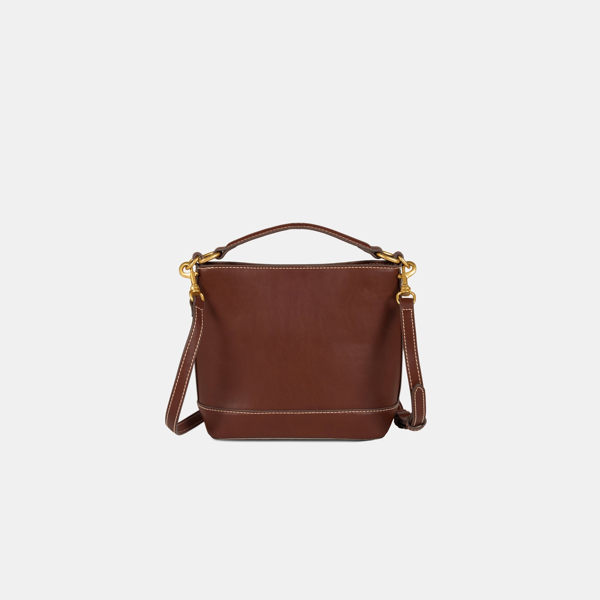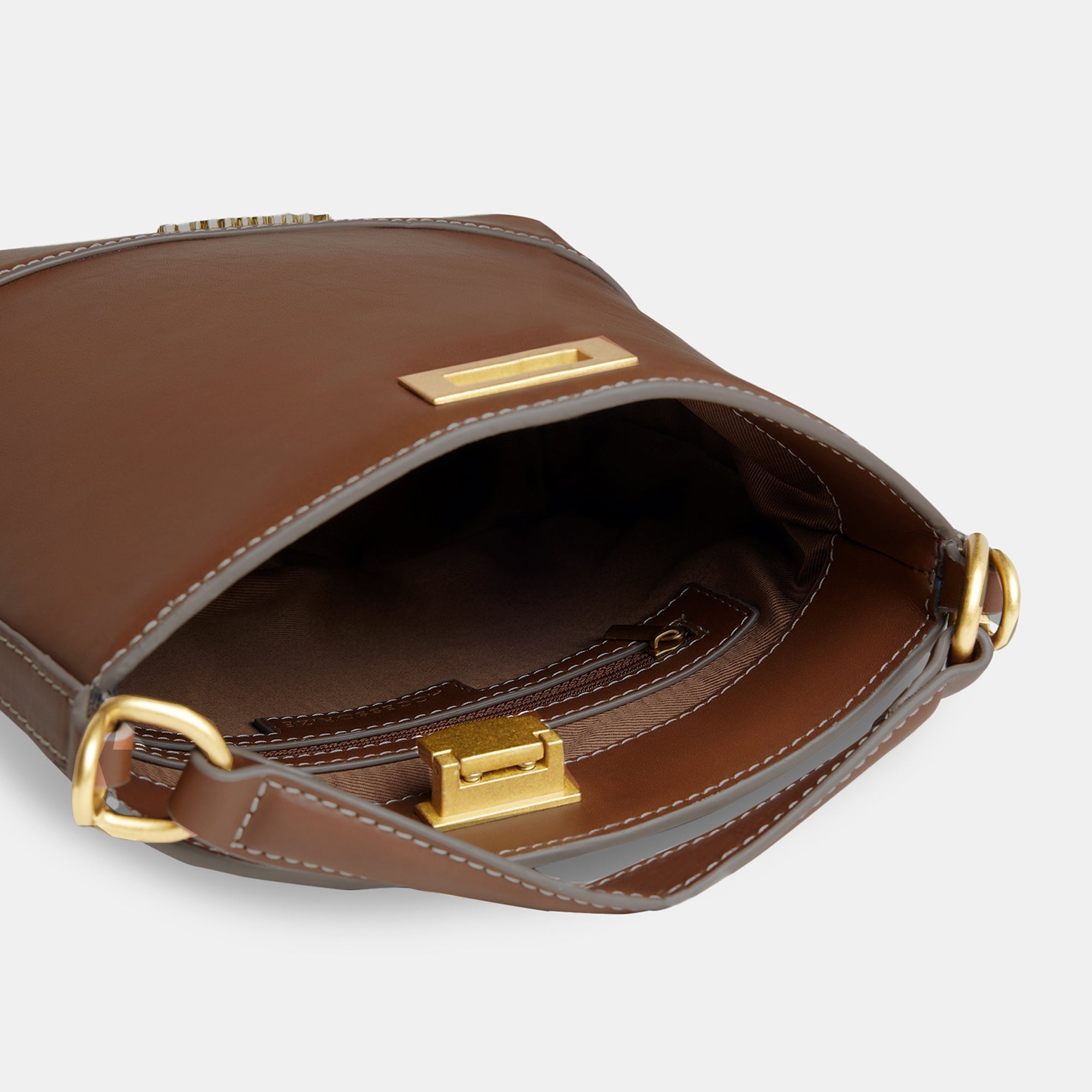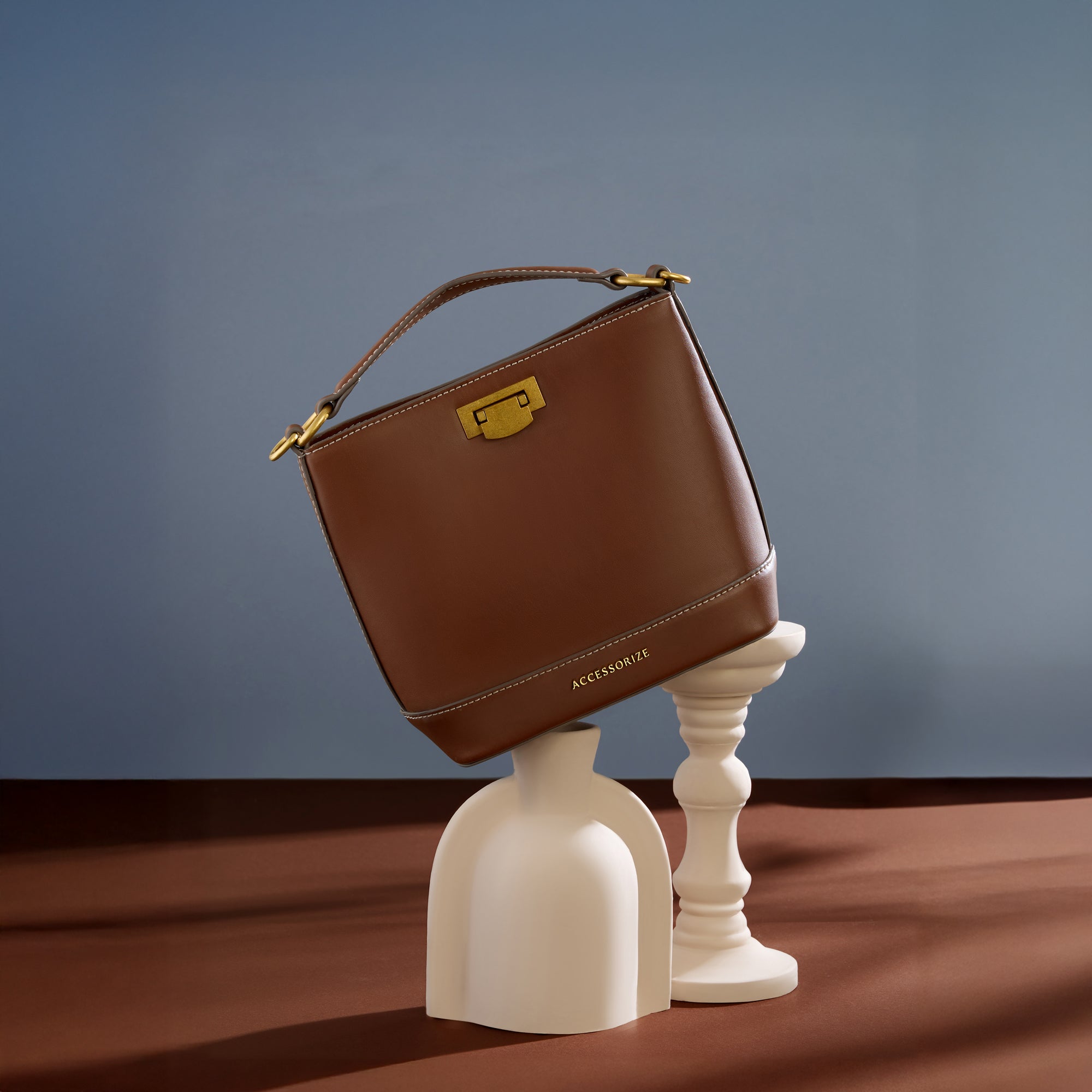 A chic tan structured sling bag with top handle, gold-tone hardware, and versatile cross-body strap — perfect to add timeless elegance to your everyday looks.