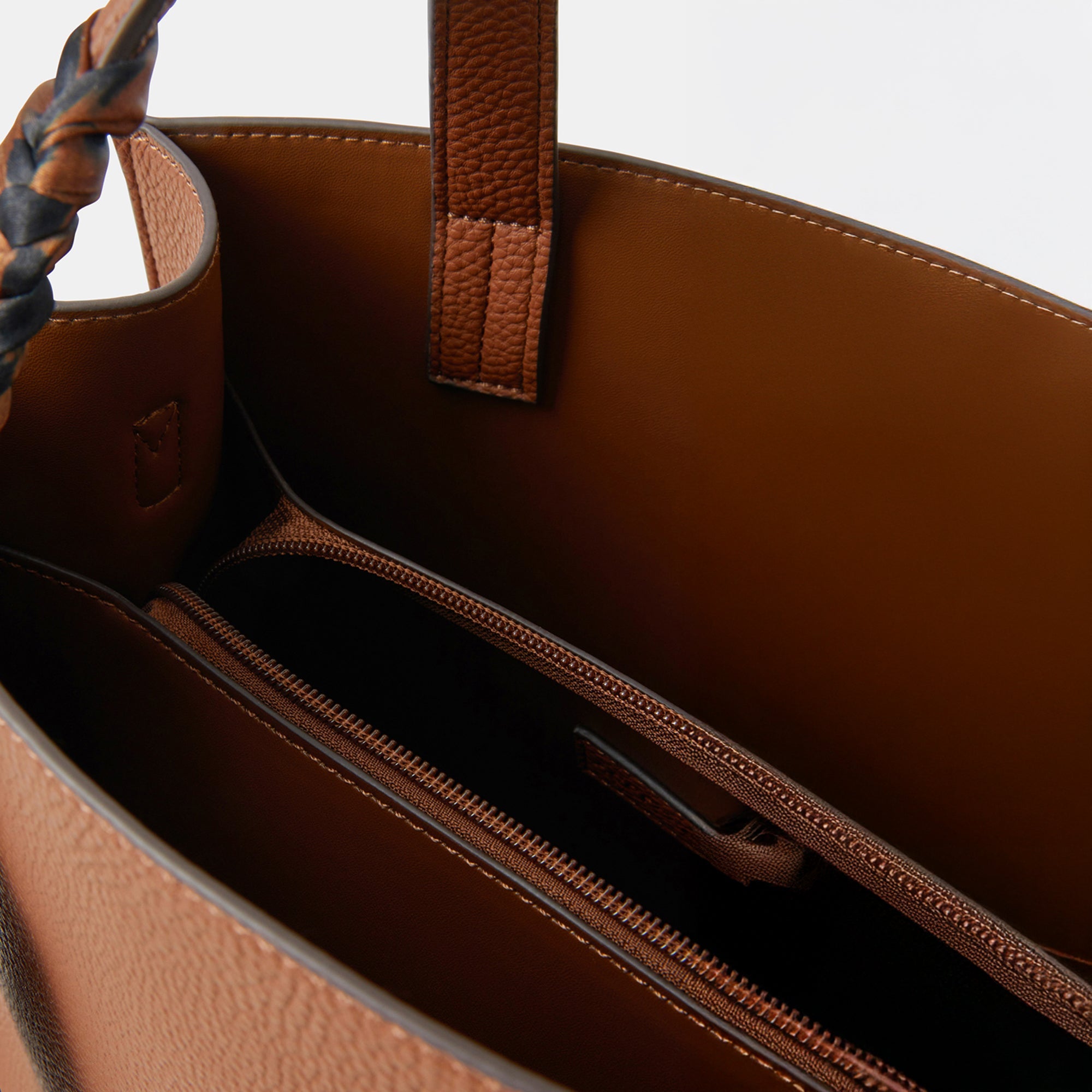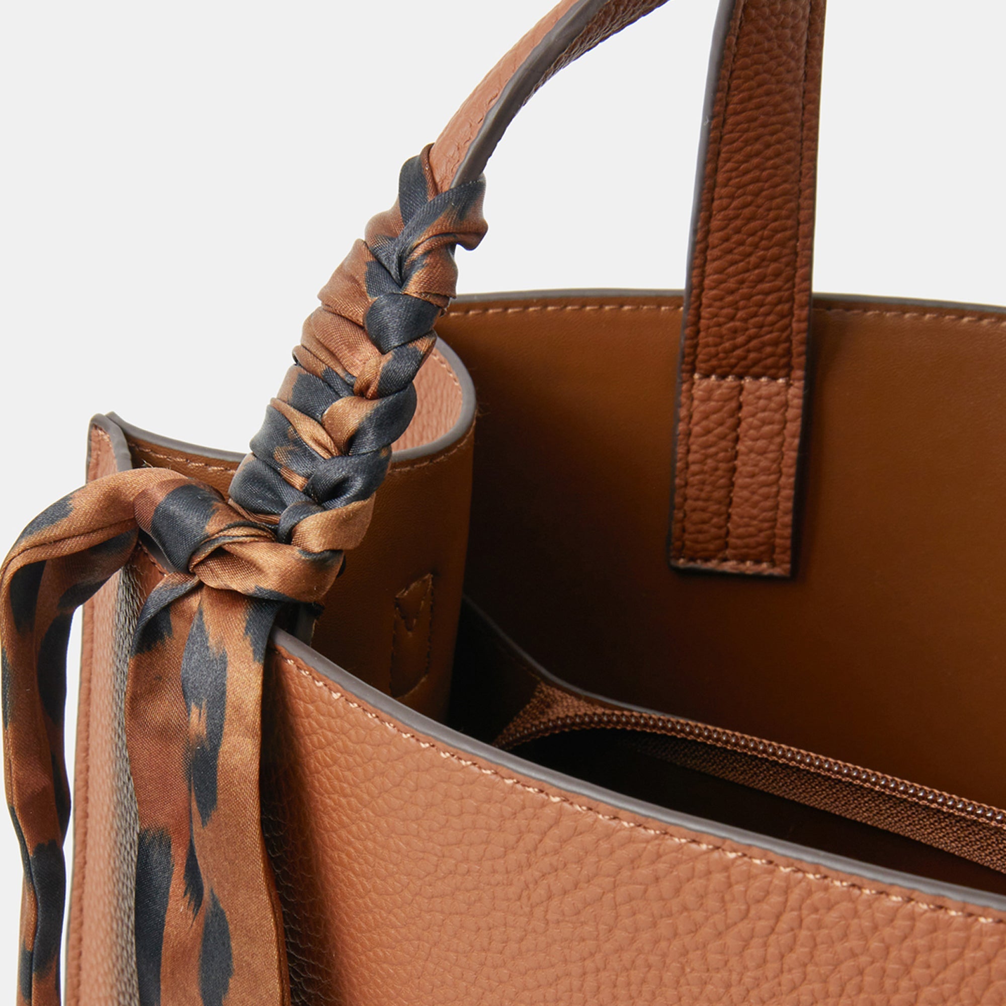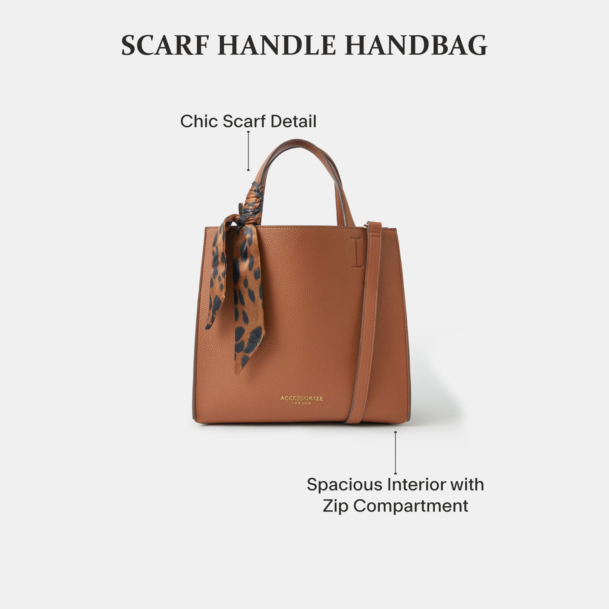 Super chic and totally on trend. Made from faux leather, this handbag features multiple inner compartments, an optional crossbody strap and leopard printed satin scarf wrapped around the top handle.