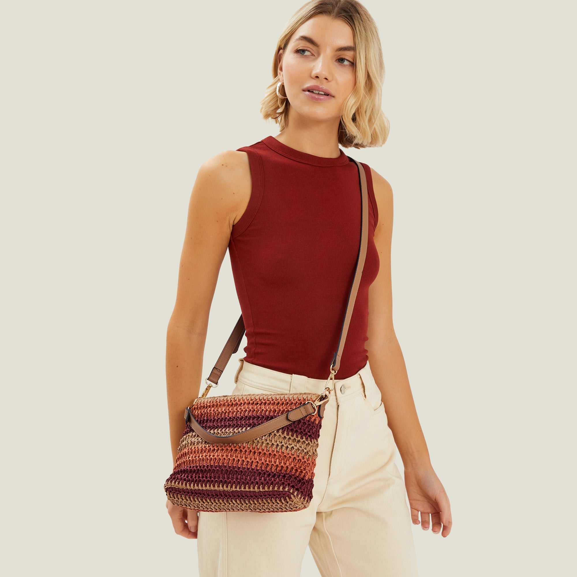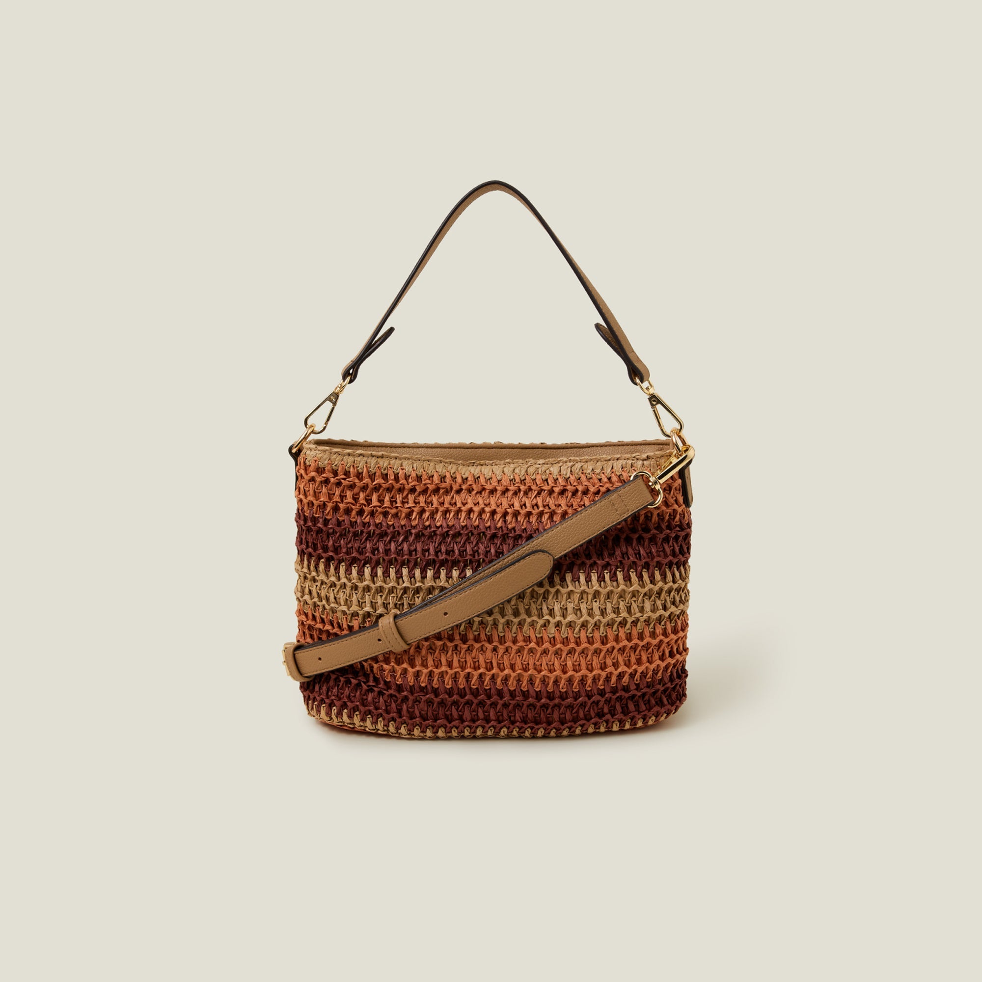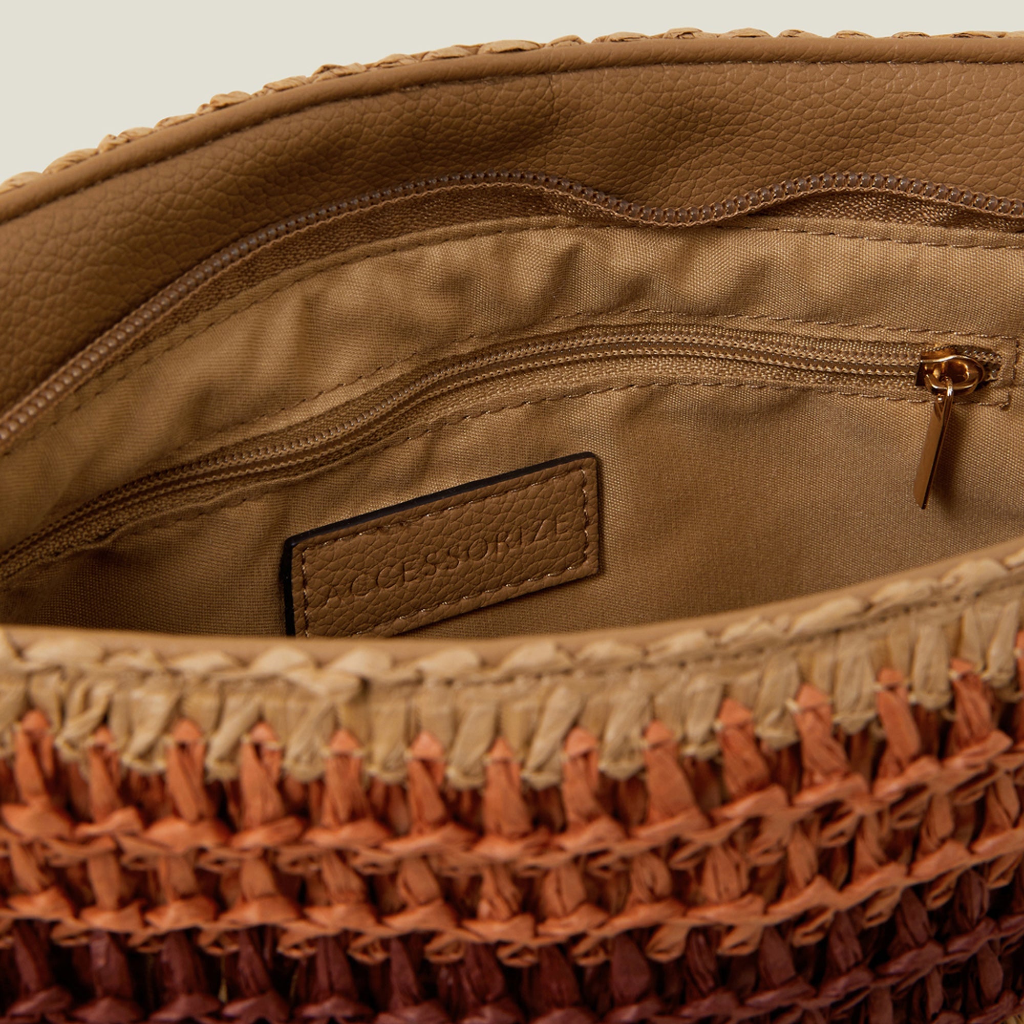 Woven with sunset tones perfect for the golden hour sun, this raffia bag is a true suitcase staple. Featuring a roomy main compartment, it secures with a zip fastening to the top with a top handle and detachable cross-body strap