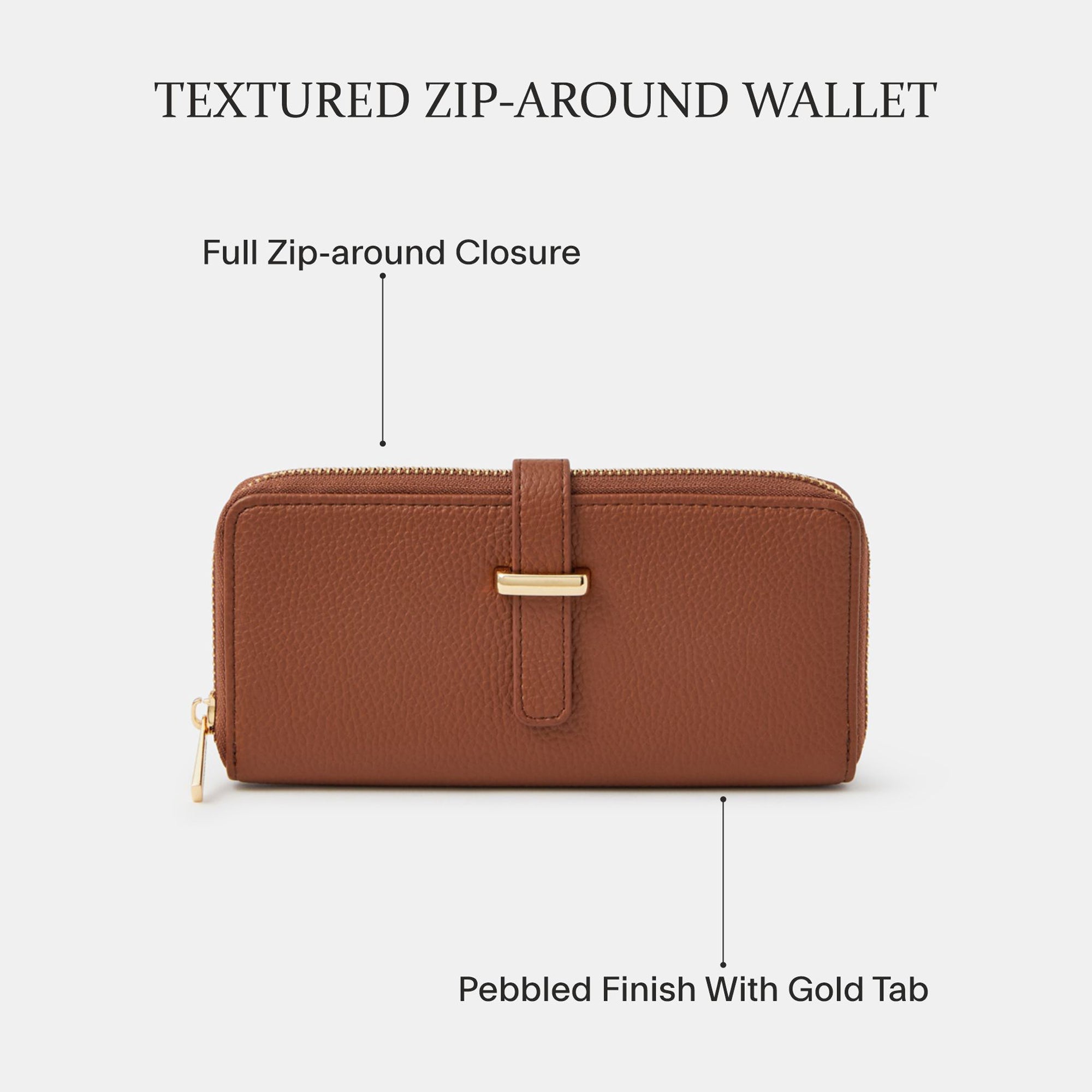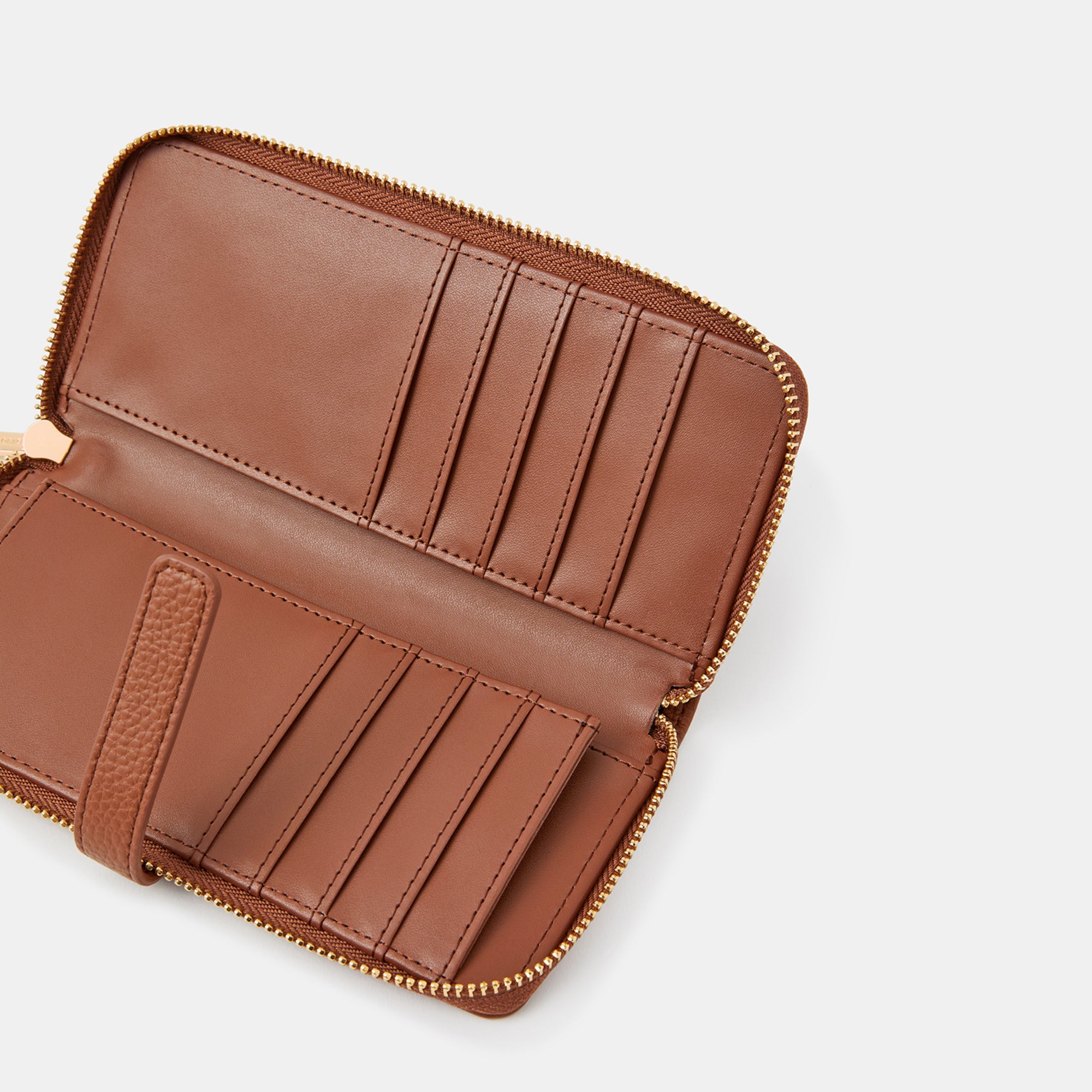 Hey big spender (we've found the purse for you)! Made of faux leather, this rectangular purse opens up to reveal four card slots on each side with slip pockets for storing receipts and bank notes. Closes securely with a tab over the zip fastening. Tan