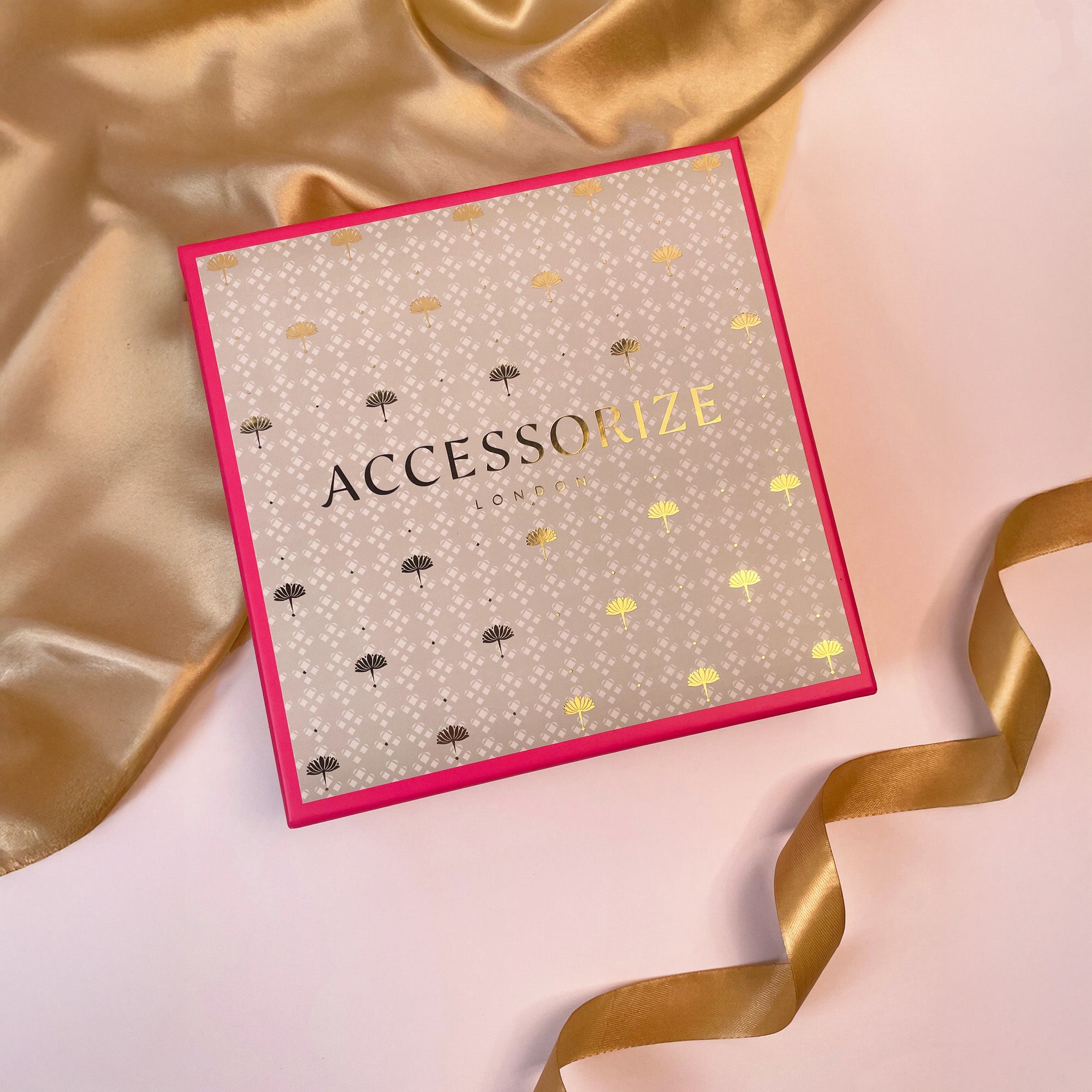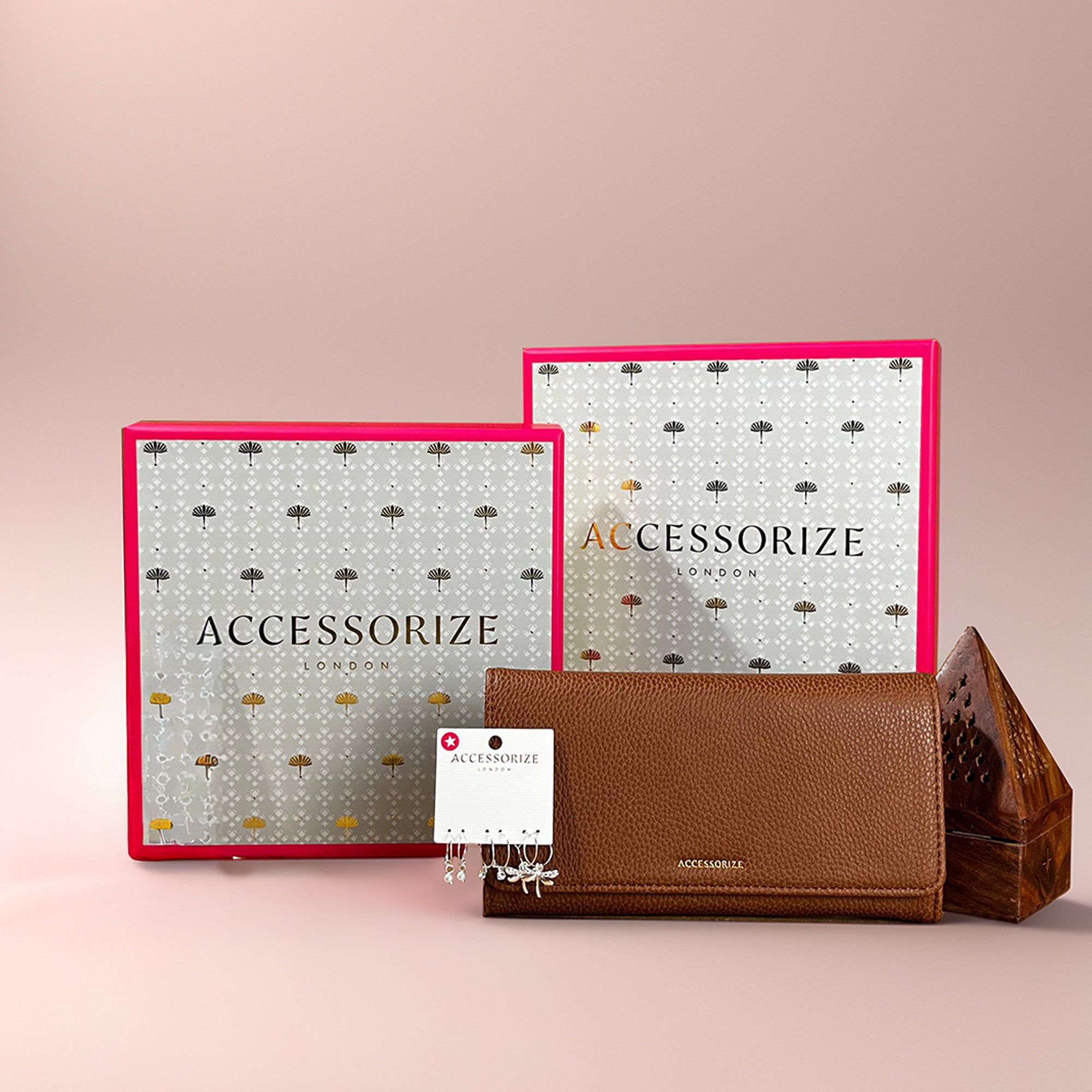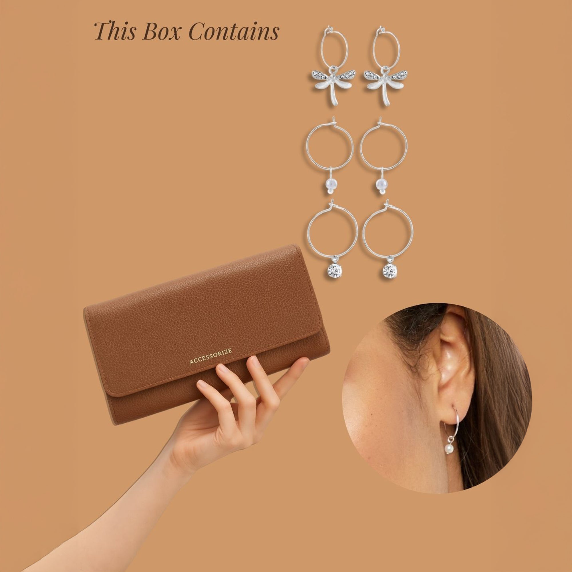 Celebrate the joy of gifting with this exclusive Accessorize London Women combo set, featuring a timeless brown textured wallet paired with a chic set of 3 silver hoop earrings. Thoughtfully curated as a Diwali gift hamper box, this combo blends elegance with functionality—perfect for your sister or loved ones. The wallet offers a sleek, spacious design for everyday use, while the versatile earrings add a hint of sparkle to any look. Ideal for festive gifting, this gift hamper box makes a stylish statement she’ll cherish.