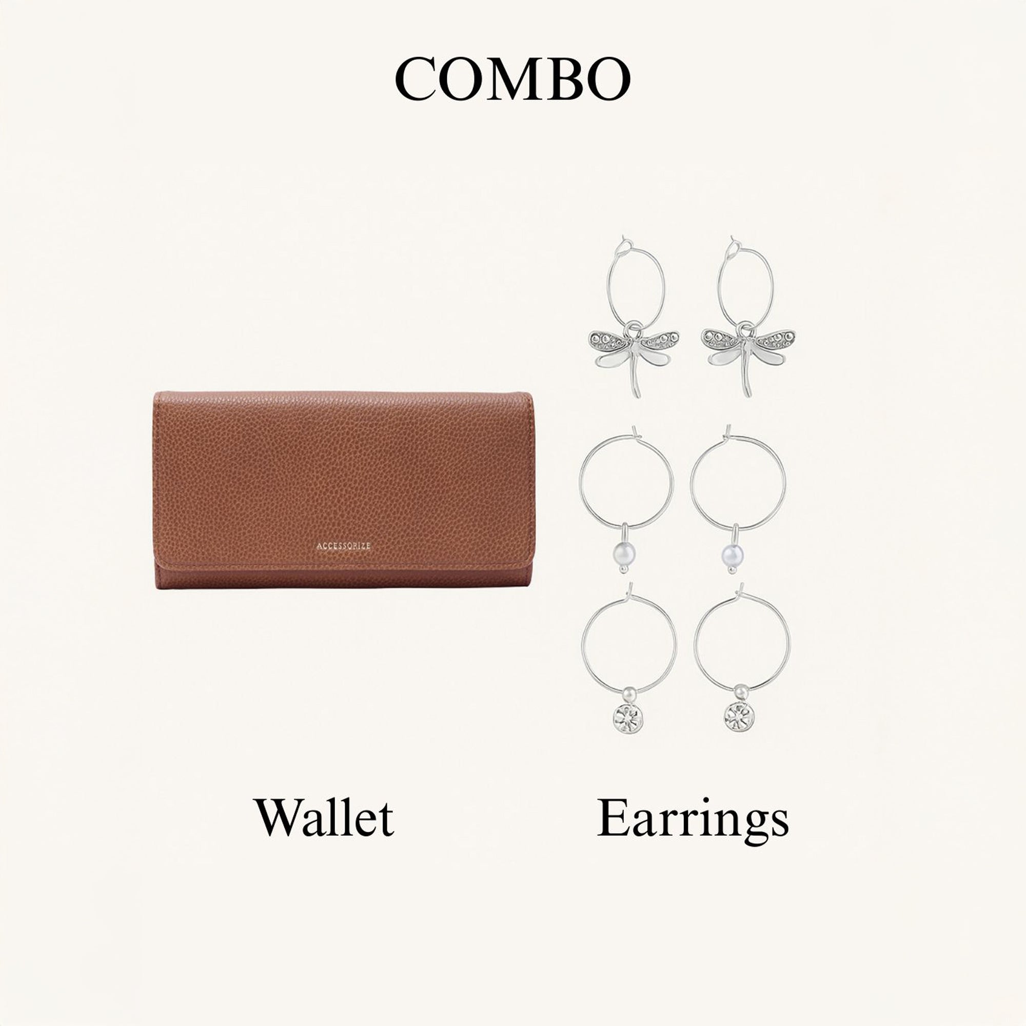 Brown Textured Wallet & Set of 3 Silver Hoop Earrings Combo (Diwali Gift Hamper Box)