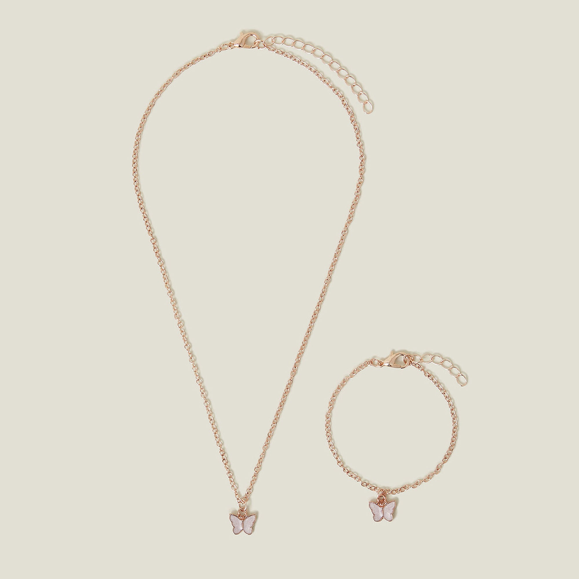 Featuring beautiful butterflies in flight, this jewellery set is comprised of a gold-tone necklace and matching bracelet. Fastens with a lobster clasp and extender.