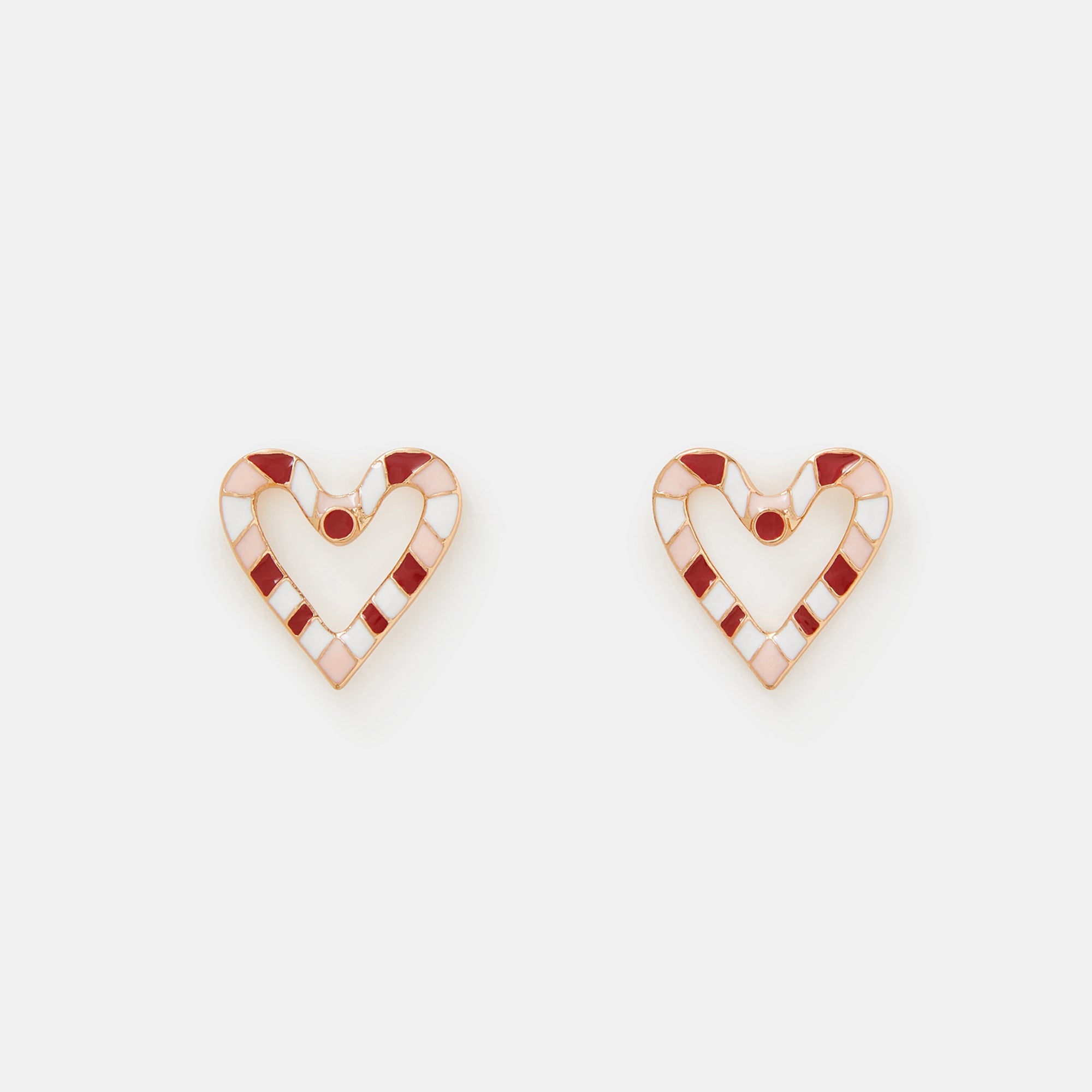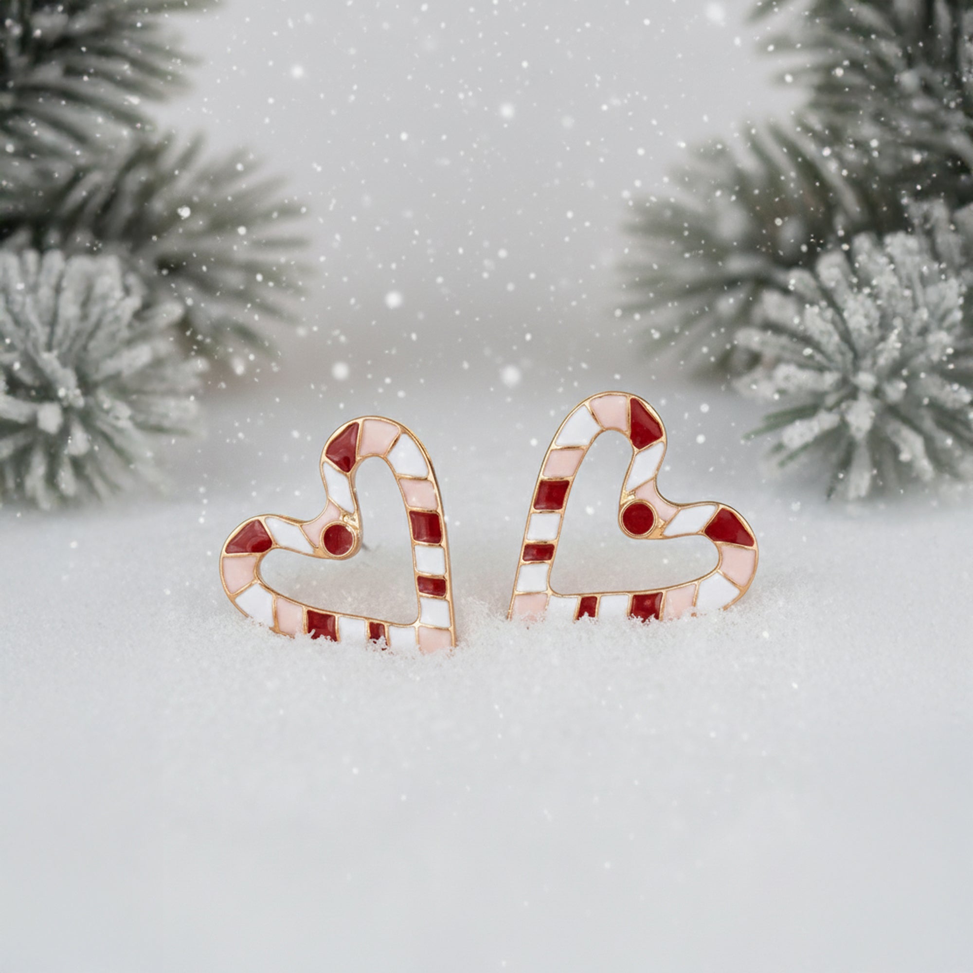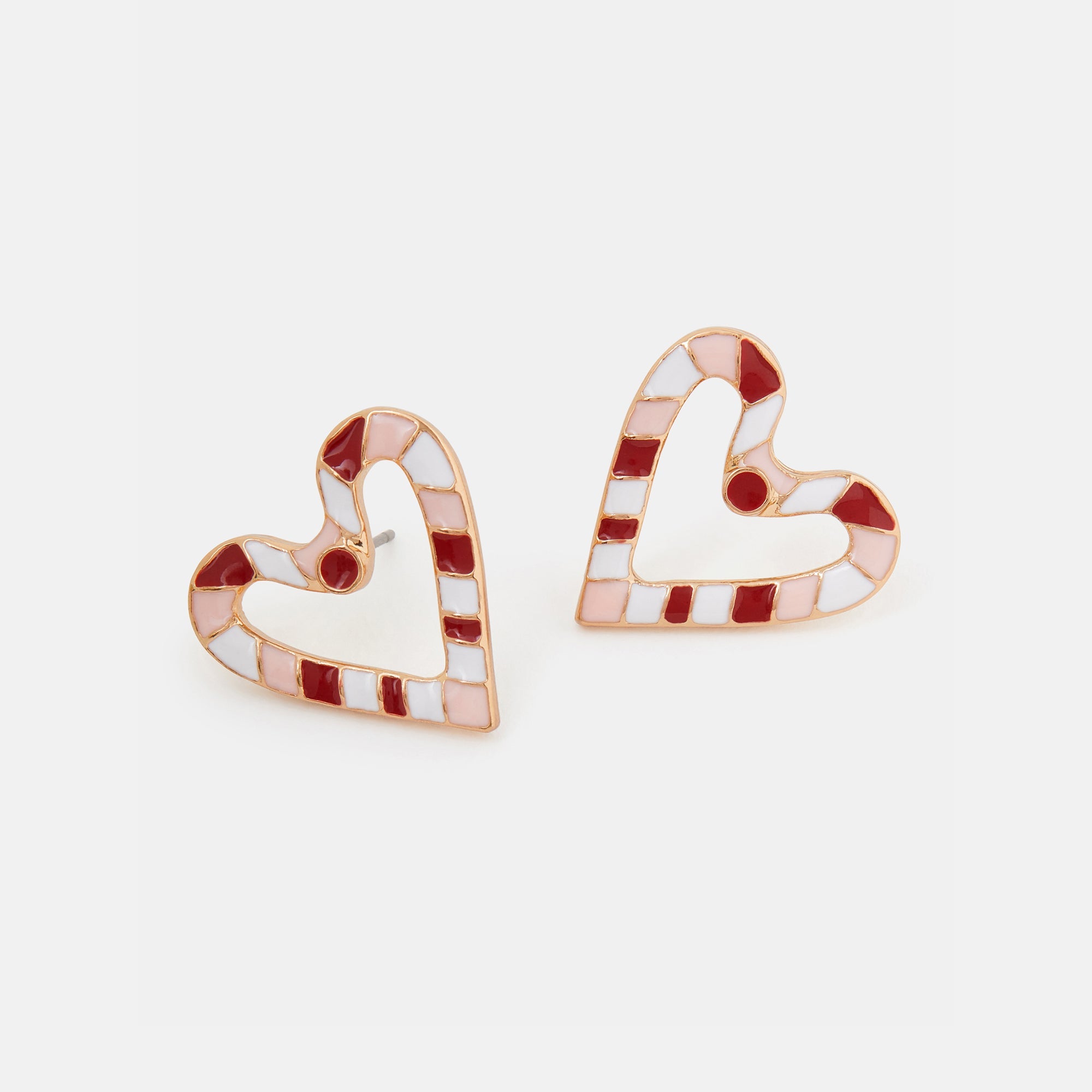 Destination: Candy Cane Lane! Showcasing a candy cane heart with pink and red enamel finishes, these statement studs are a sweet addition to your December ear-stack.