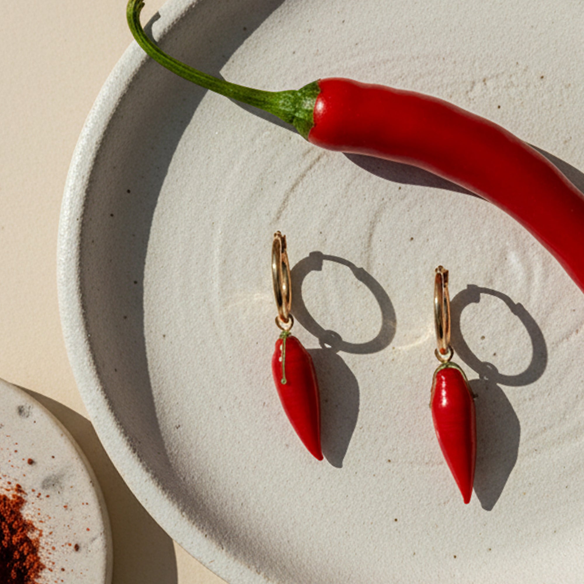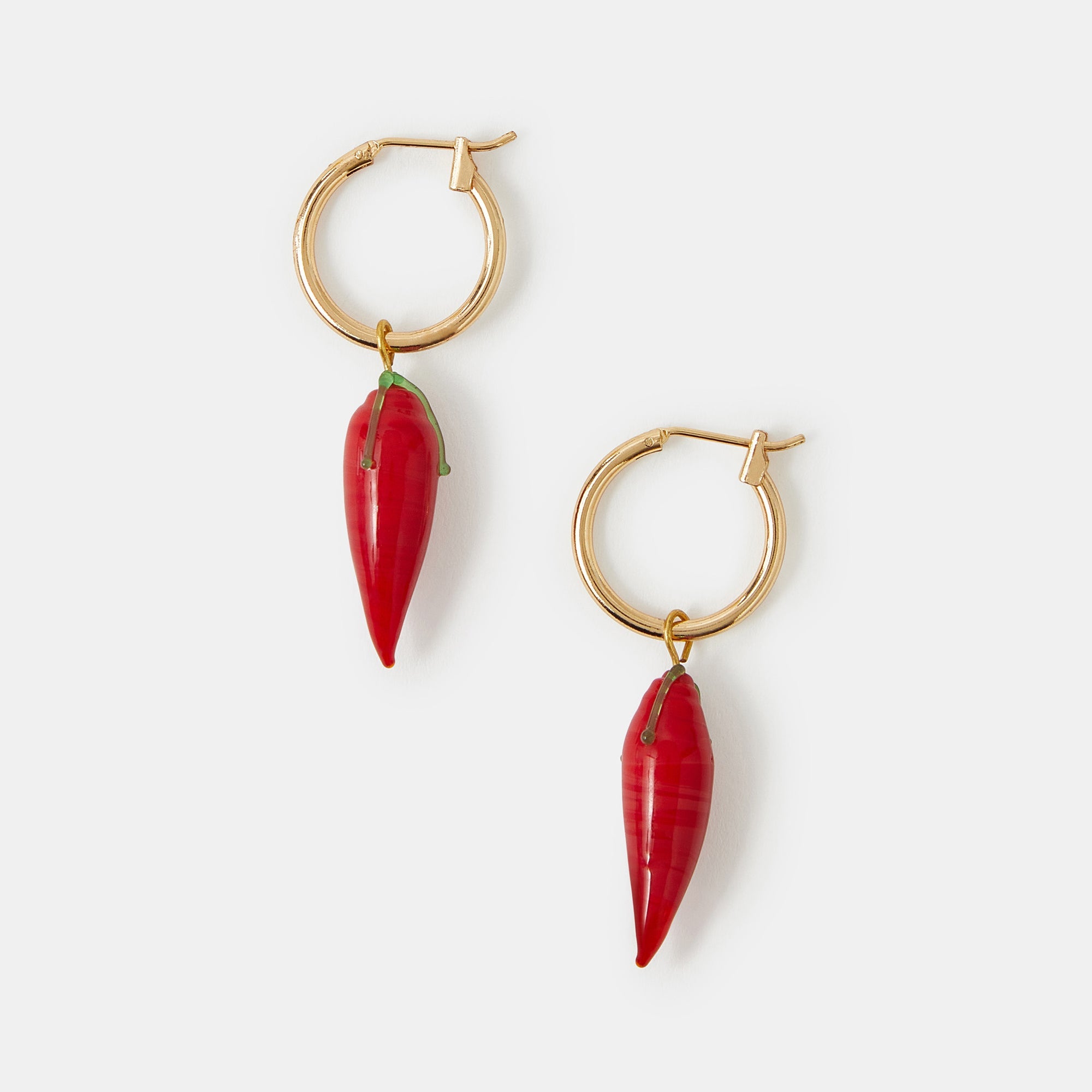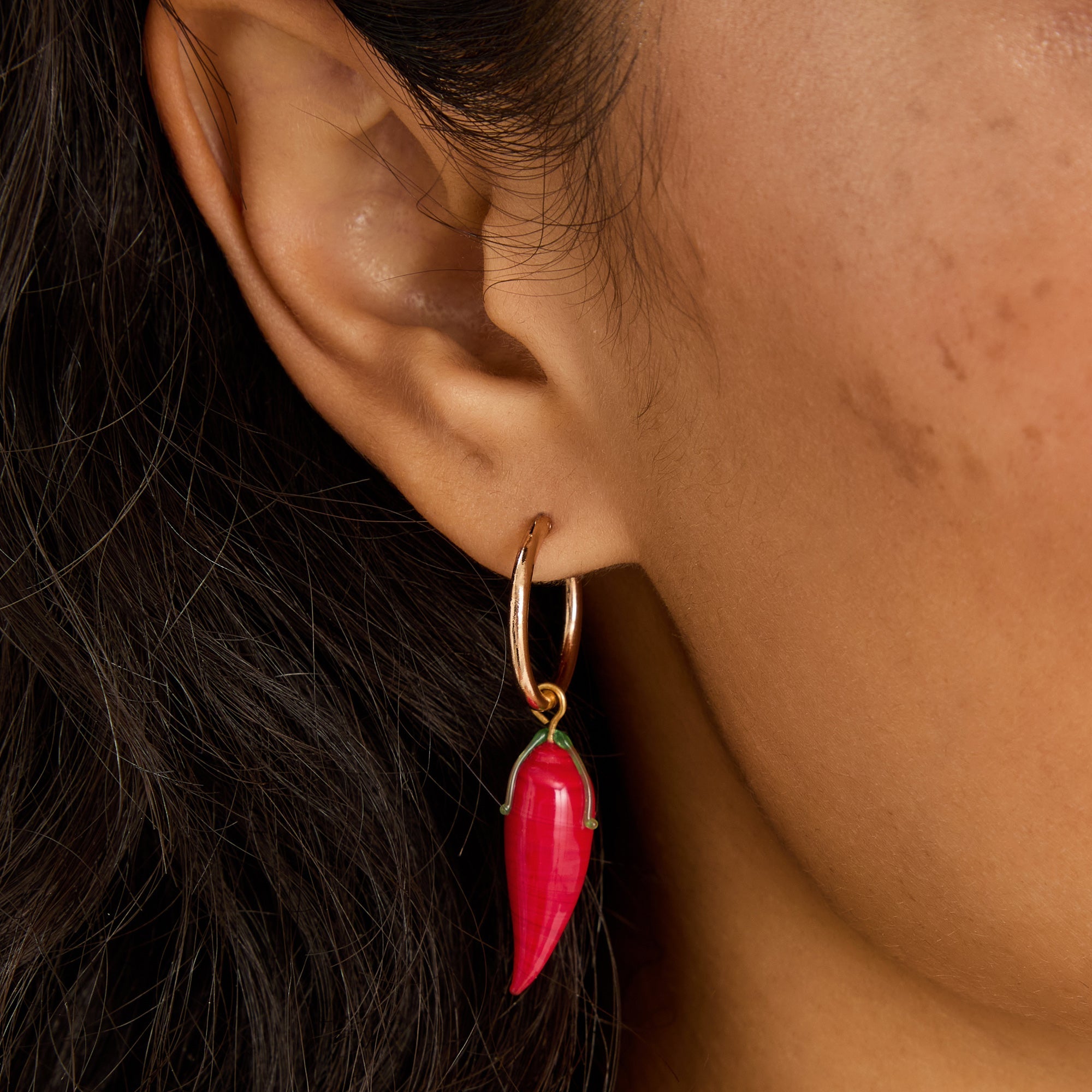 Spice up your ear-stack with this fiery pair. Designed with cute chilli charms dangling from the mini hoop profile. The lever back lock offers both security and ease of wear