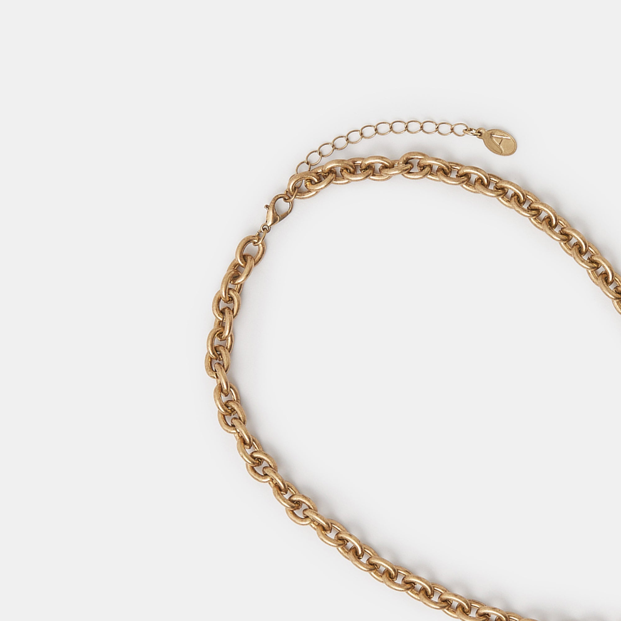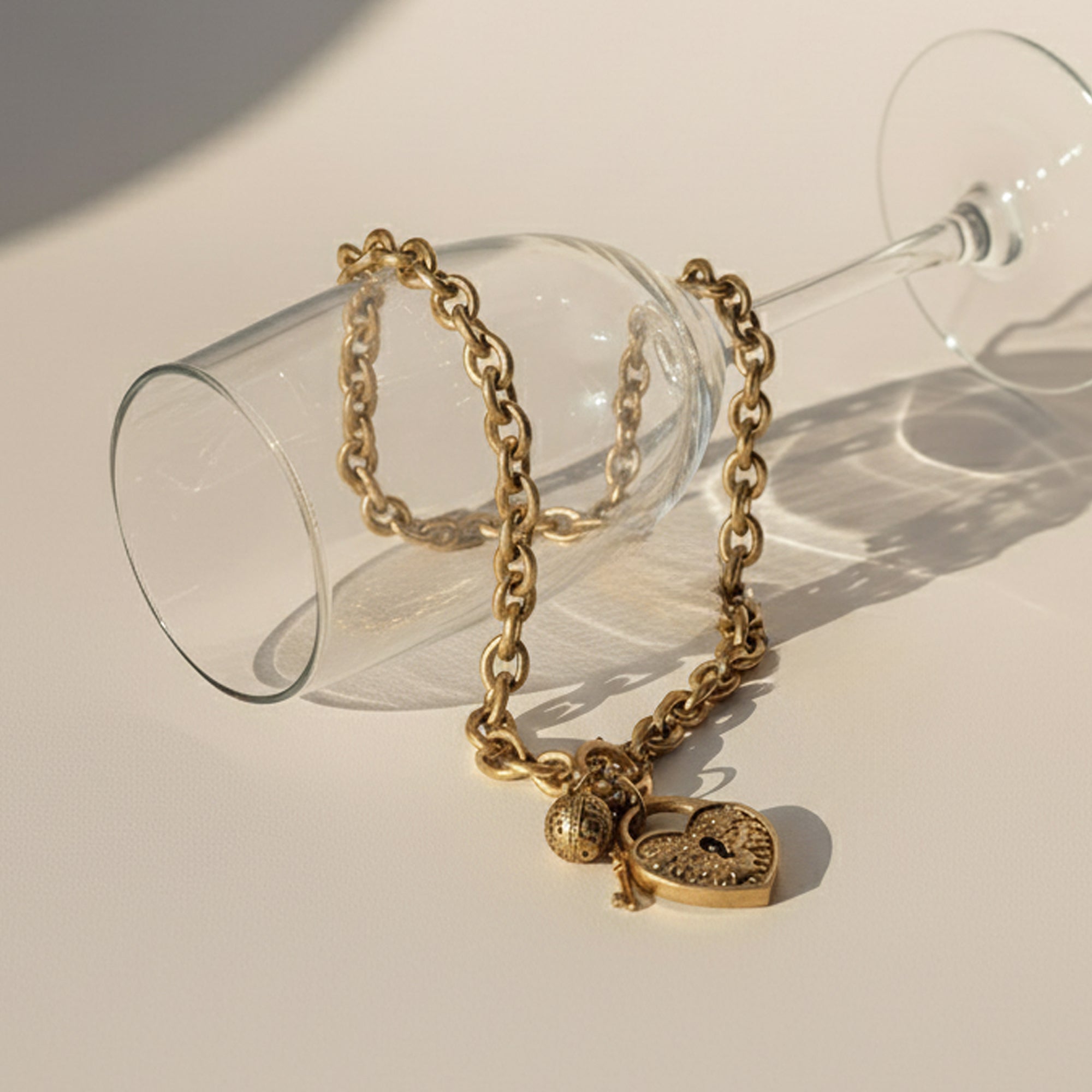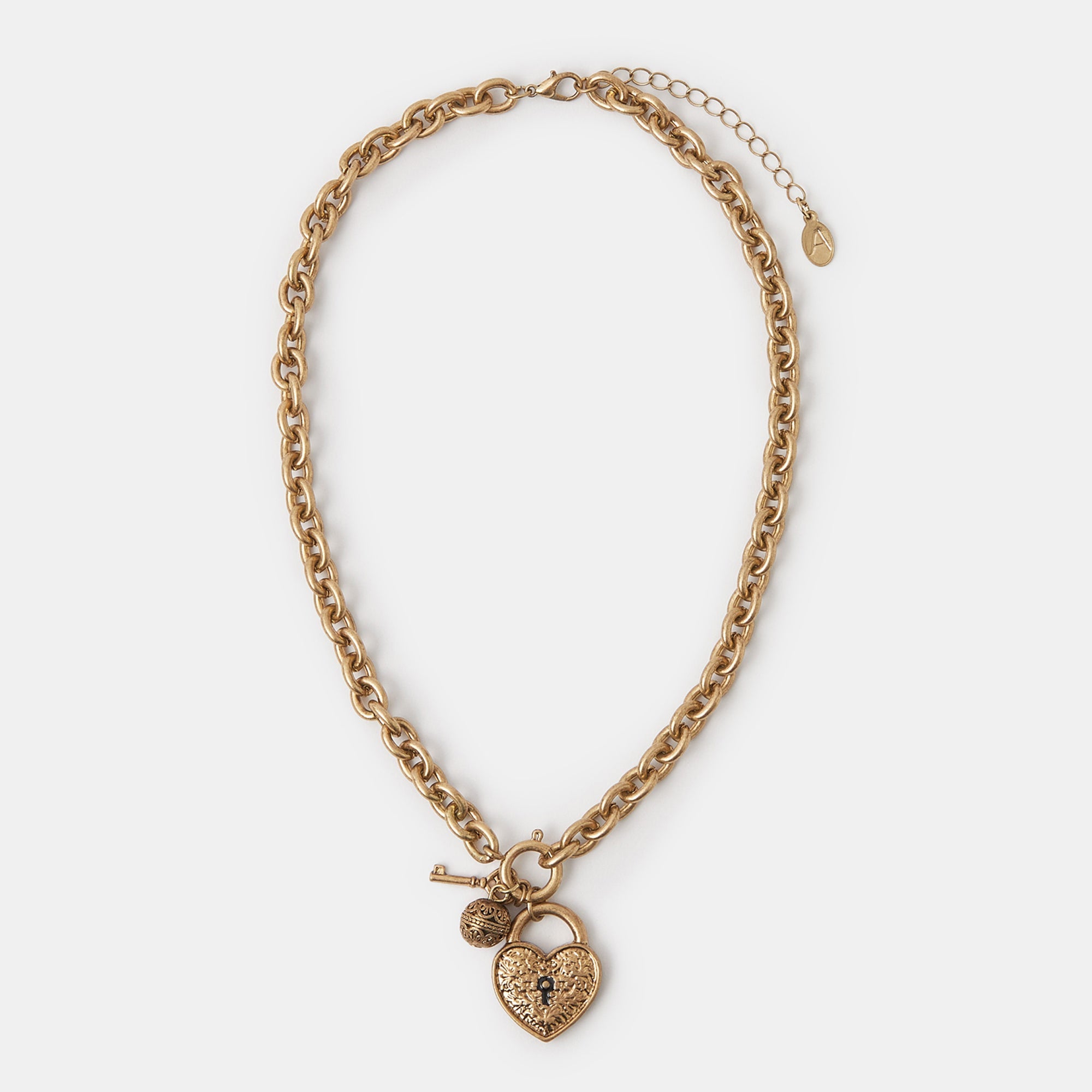 Designed in a brassy gold finish, this chunky chain necklace features a heart-shaped padlock, key and decorative ball charm at the centre.