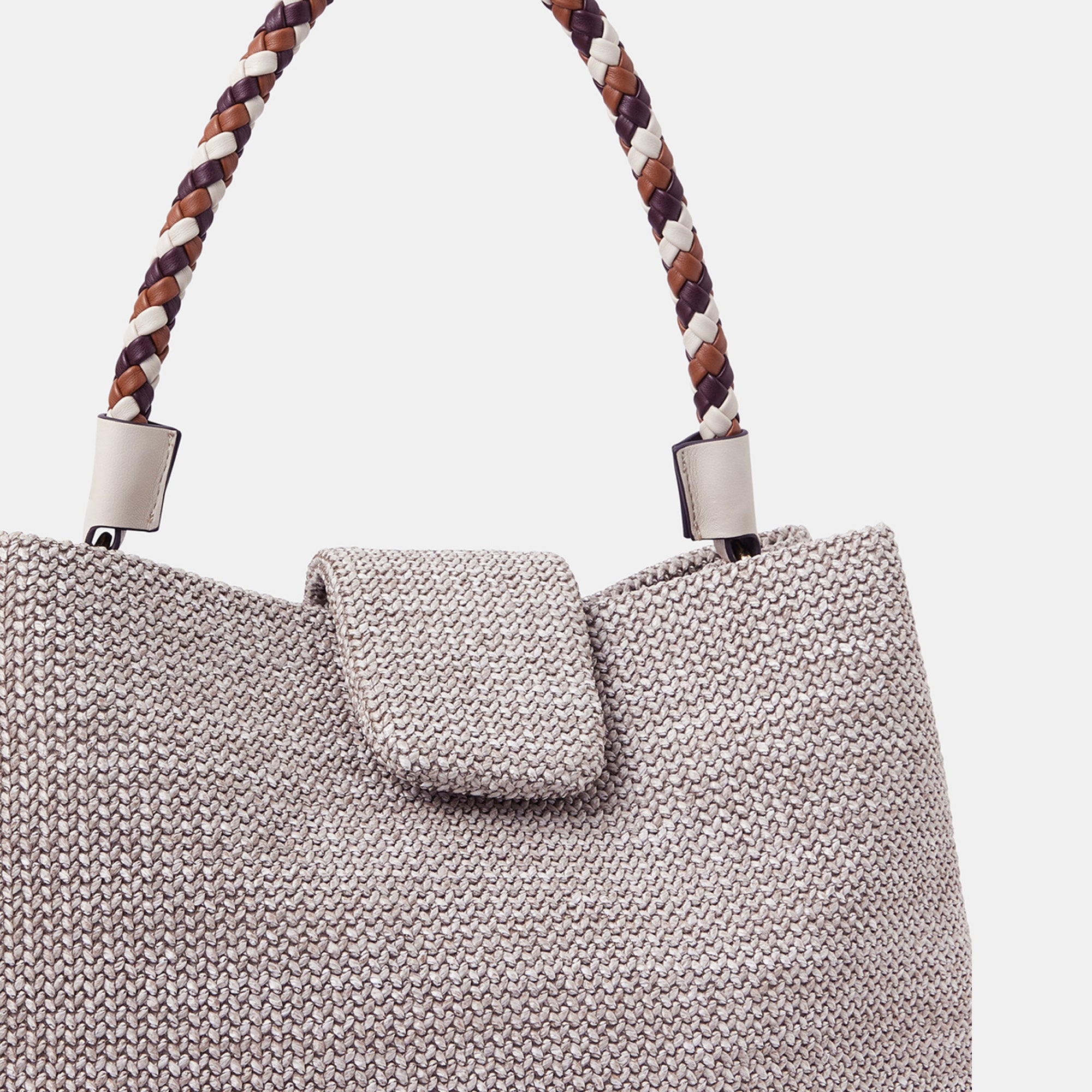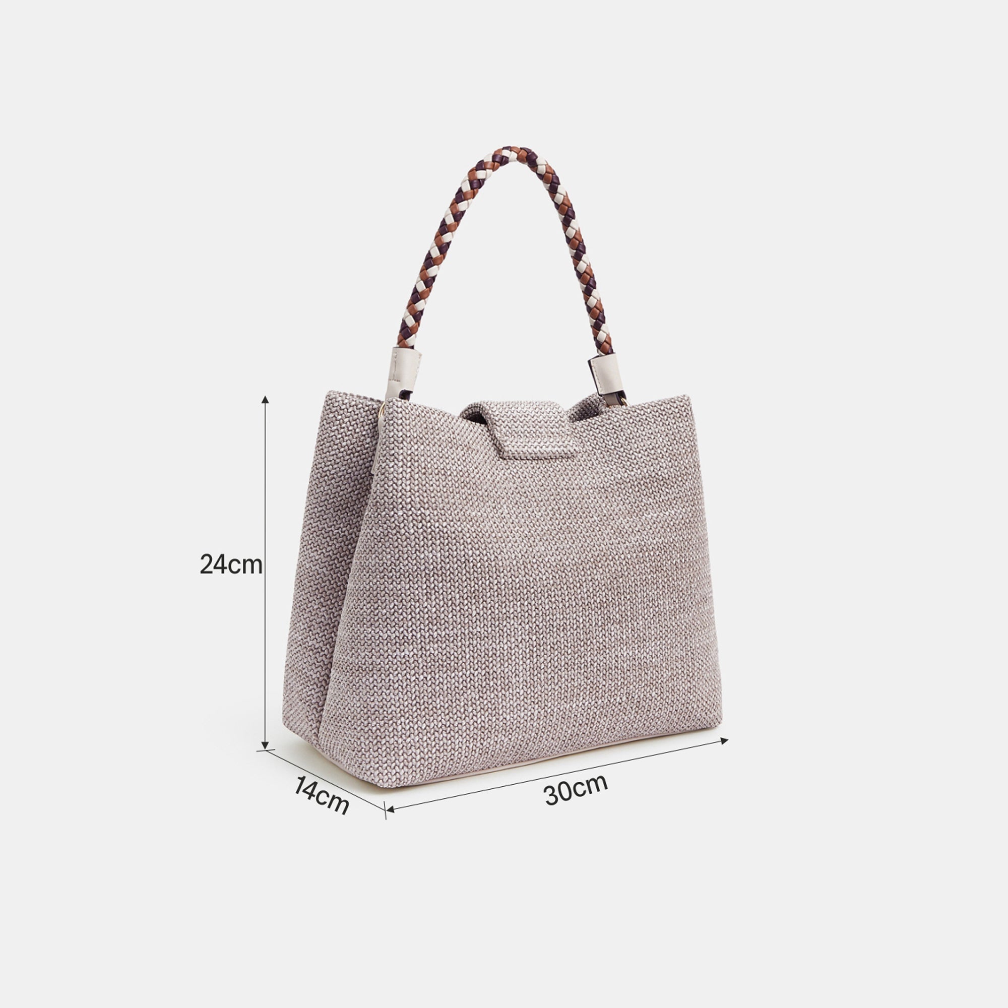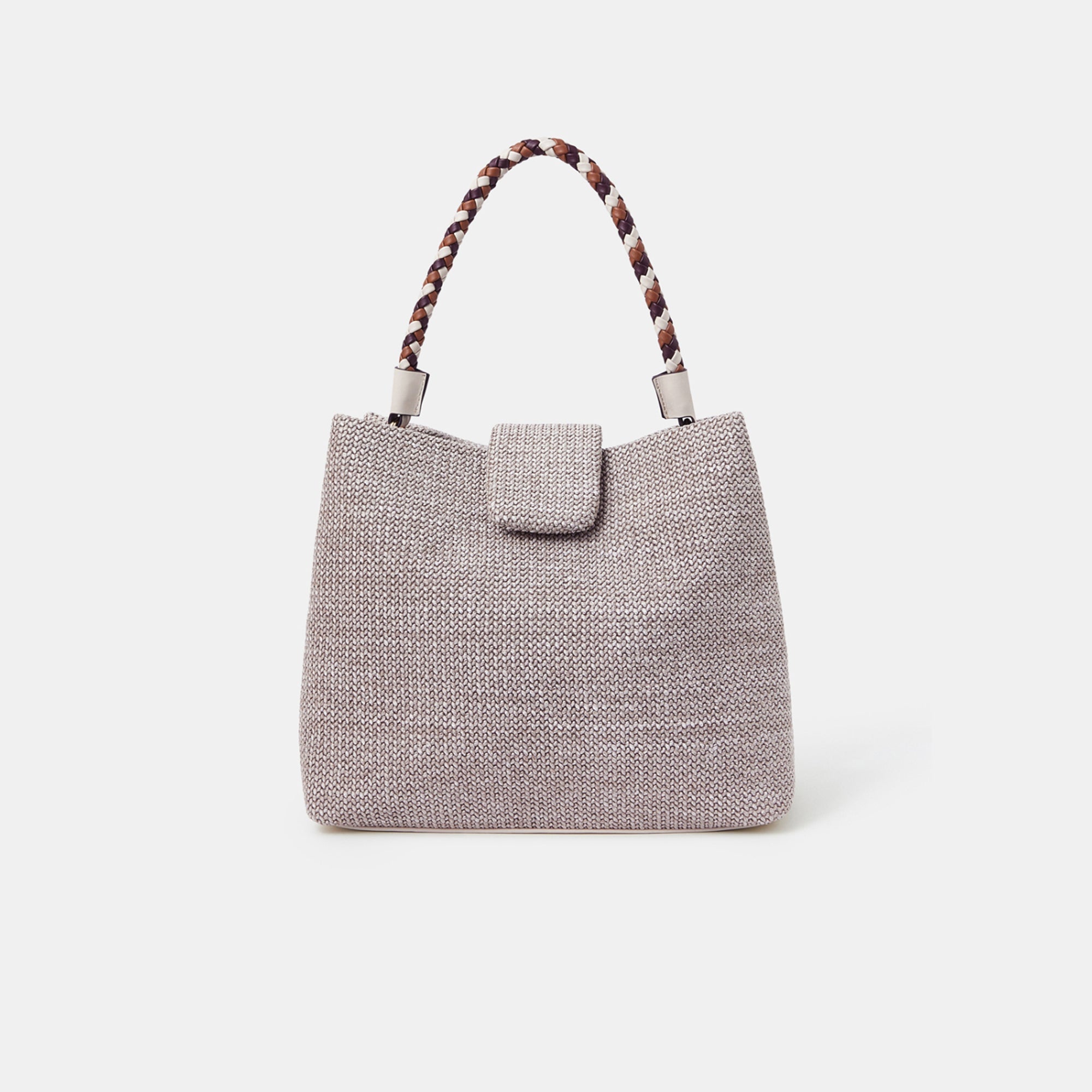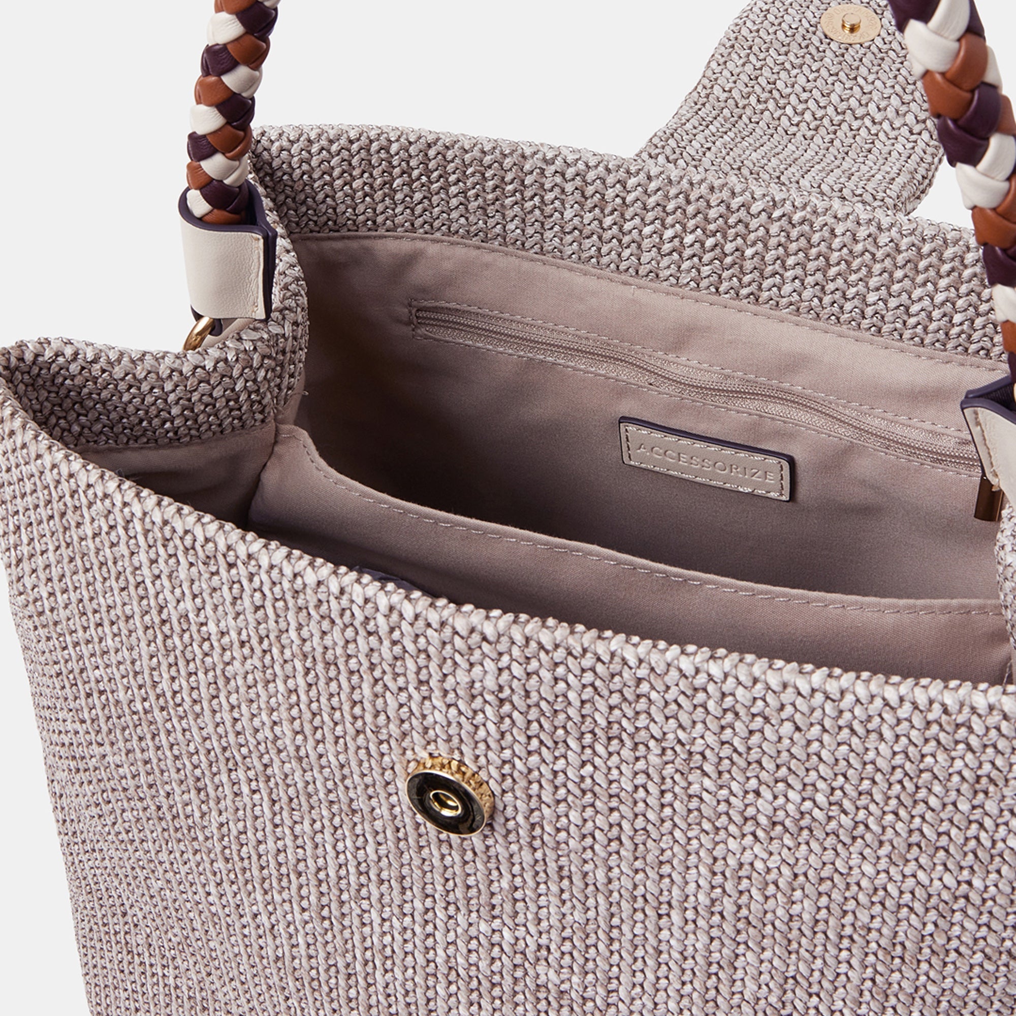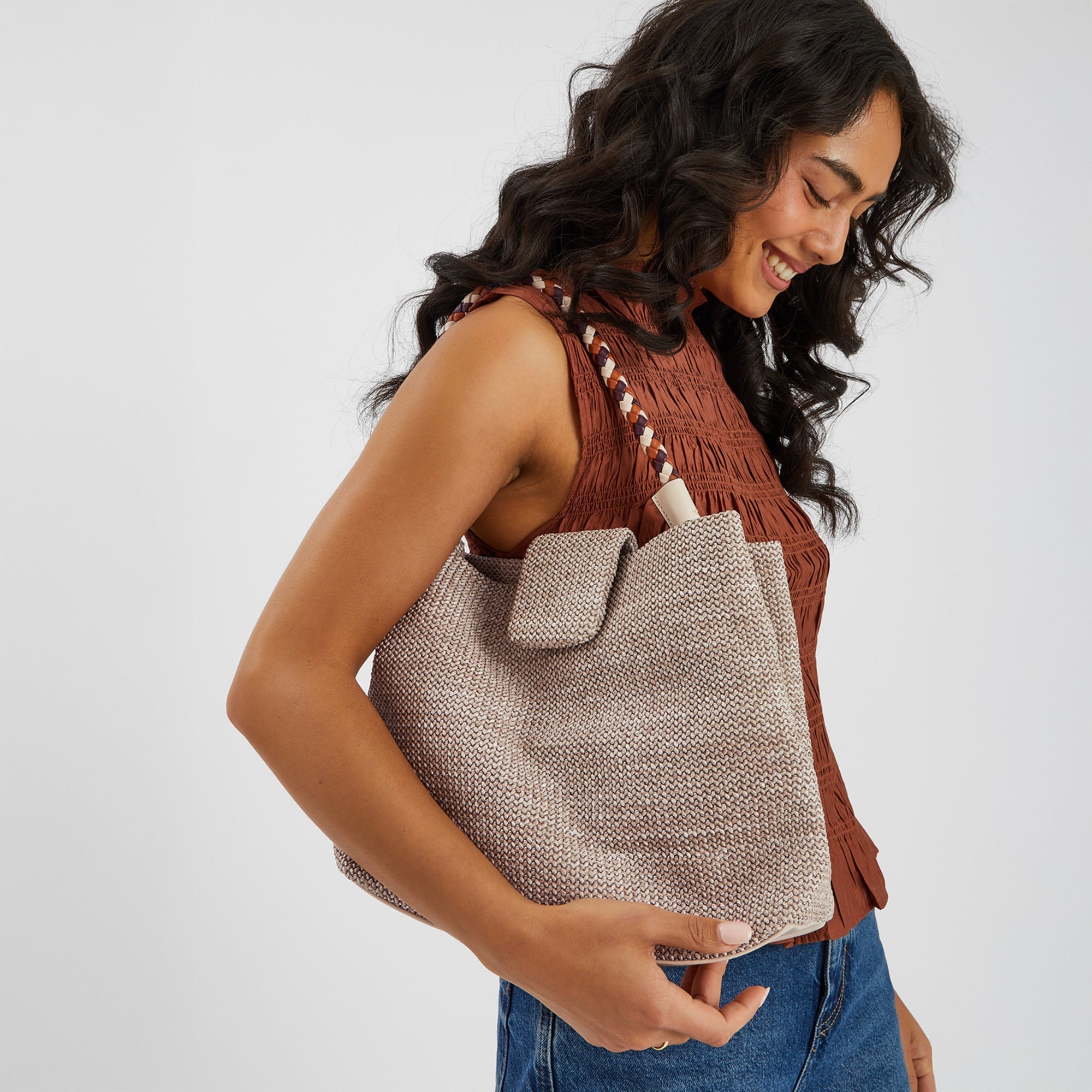 Protect the goods with this woven beauty. Designed in a slouchy profile with a magnetic button tab fastening, this bag is finished with a faux leather braided handle, two main compartments inside and a small zip pocket for the small essentials.
