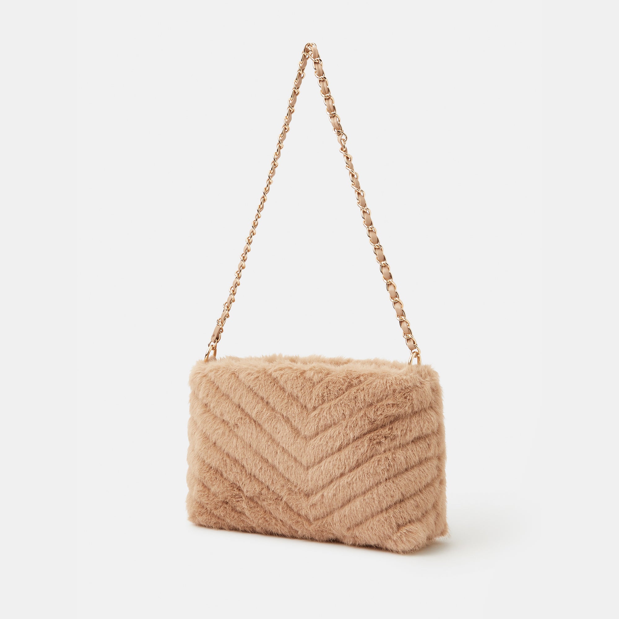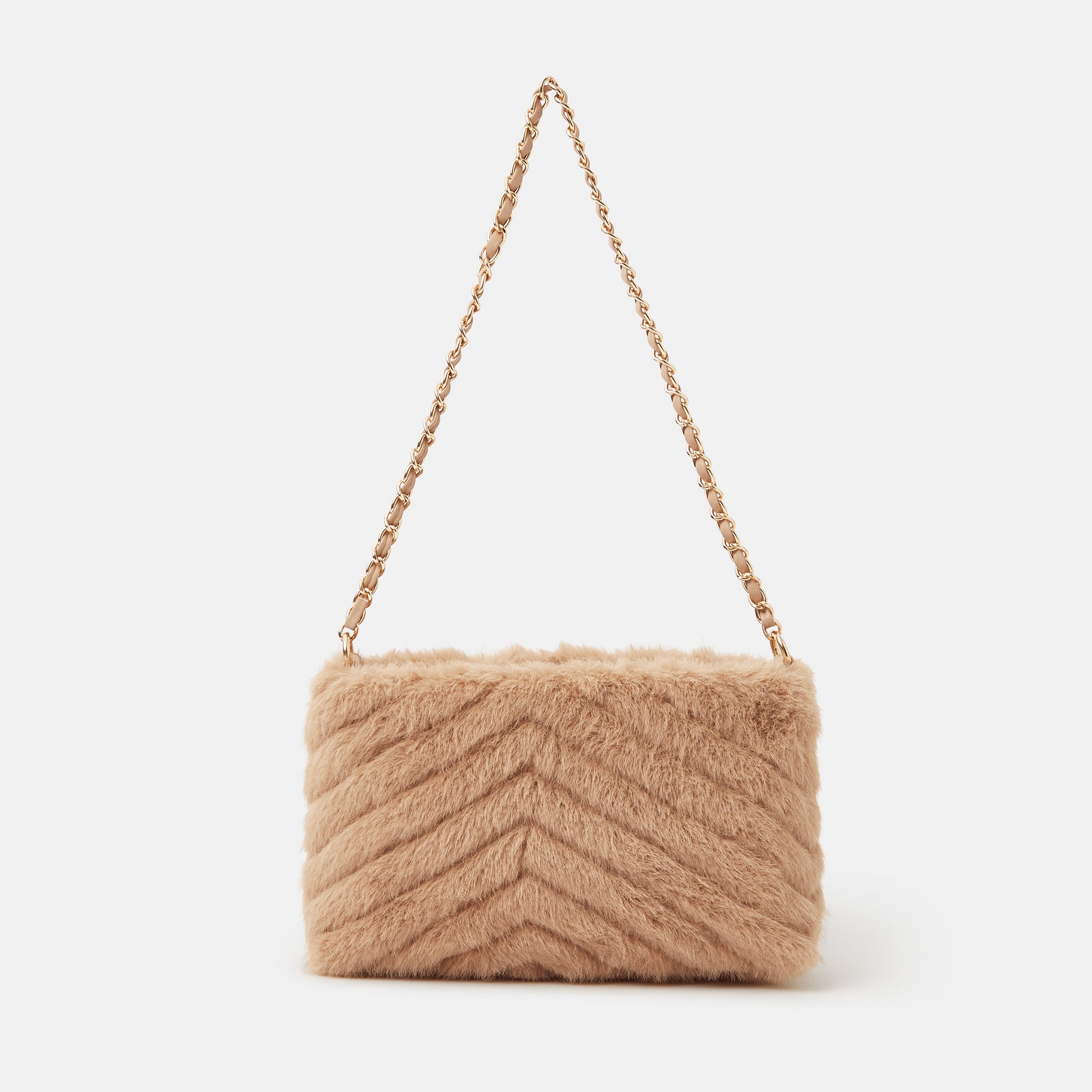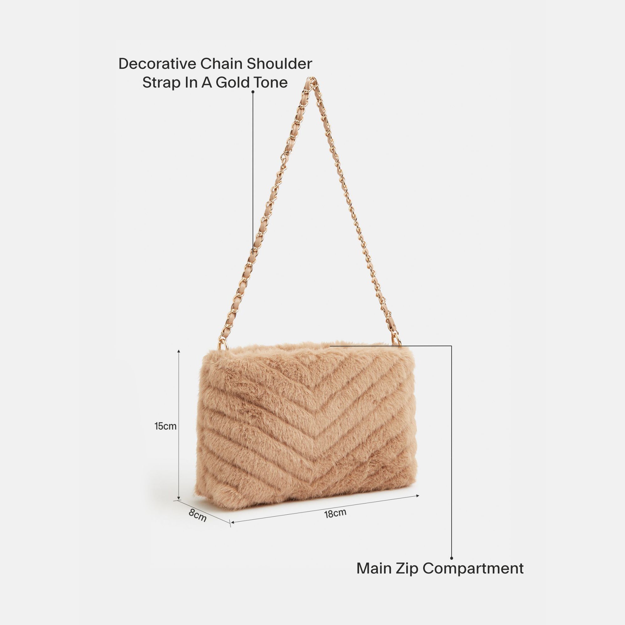 A night-out essential, faux real. Designed in a rectangular shape and covered in faux fur with a chevron stripe finish, this bag features a main zip compartment and decorative chain shoulder strap in a gold tone.
