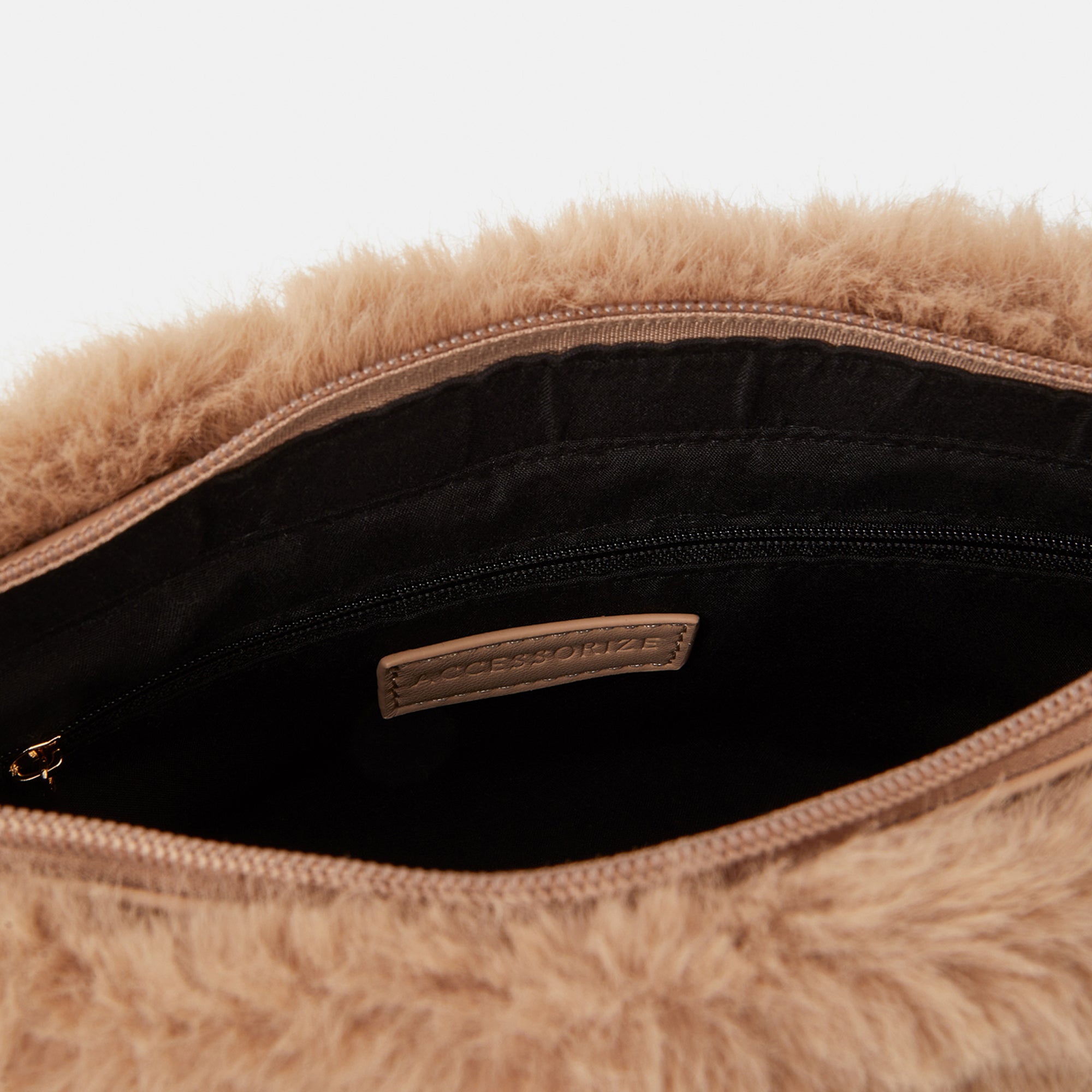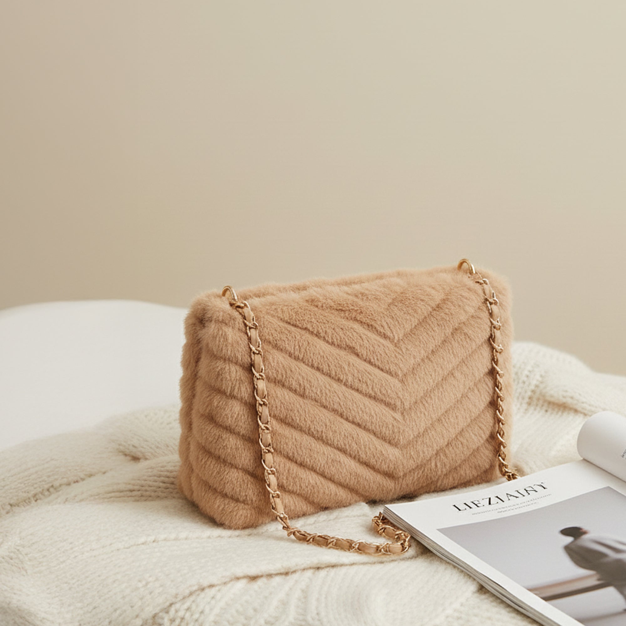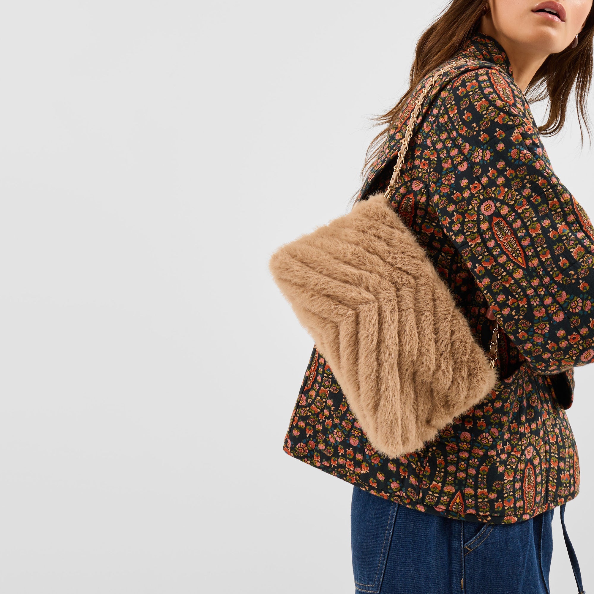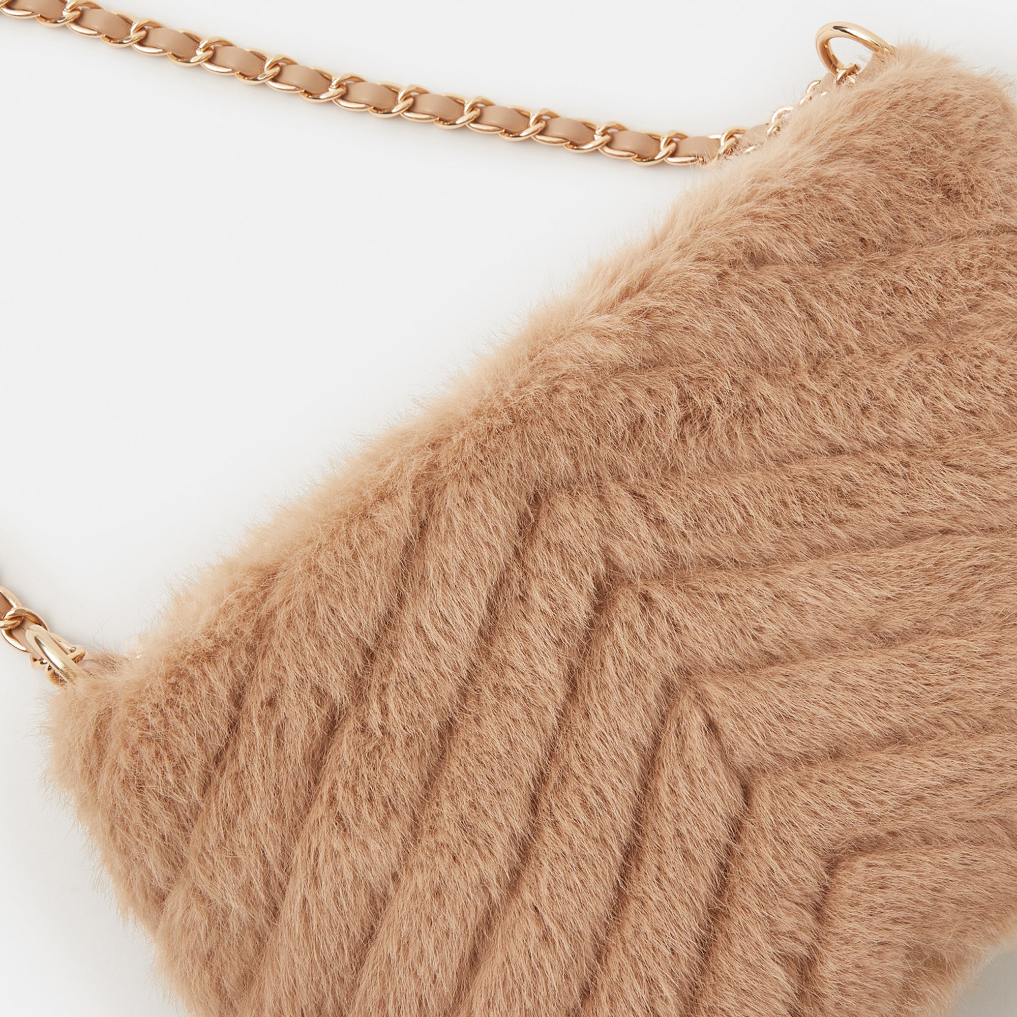 A night-out essential, faux real. Designed in a rectangular shape and covered in faux fur with a chevron stripe finish, this bag features a main zip compartment and decorative chain shoulder strap in a gold tone.
