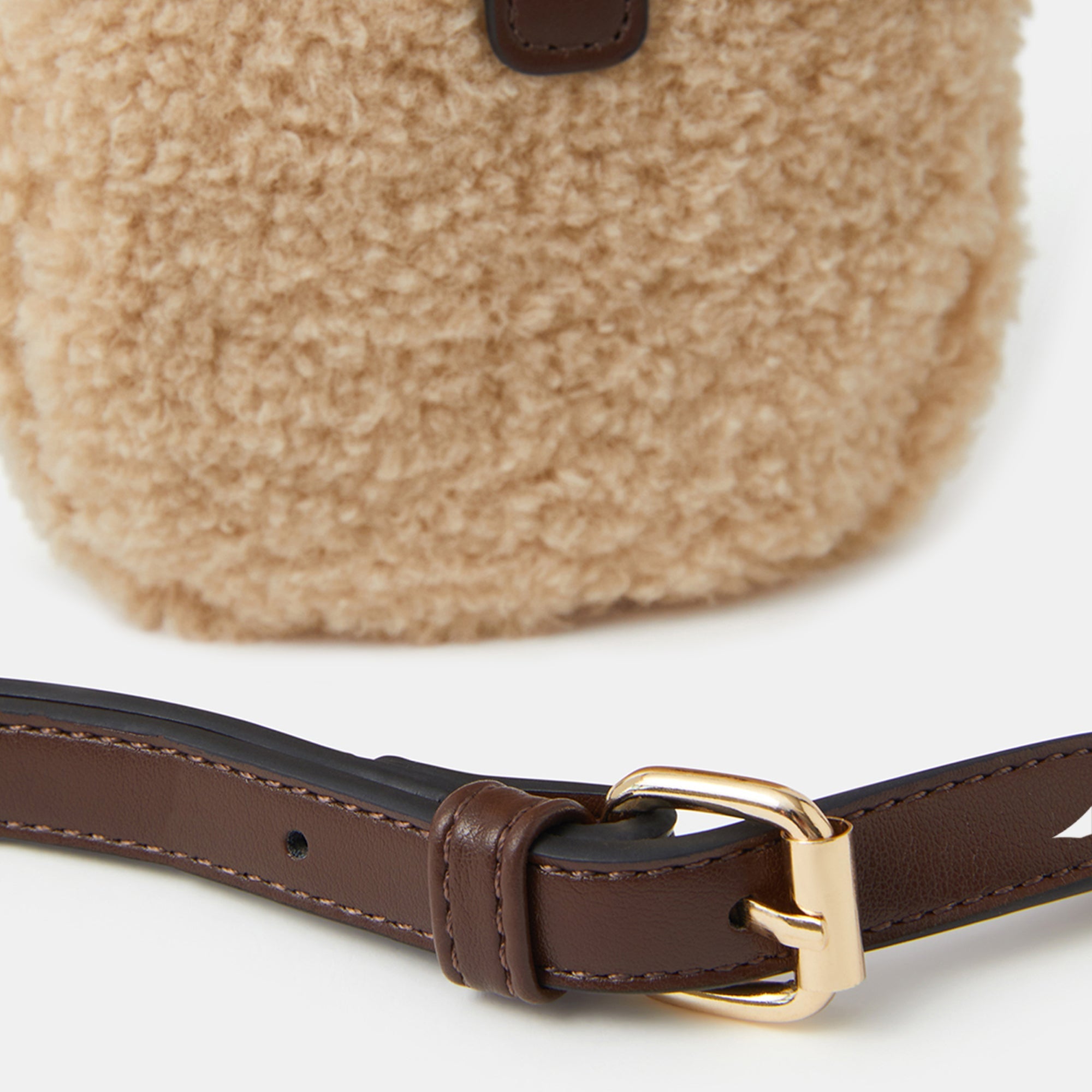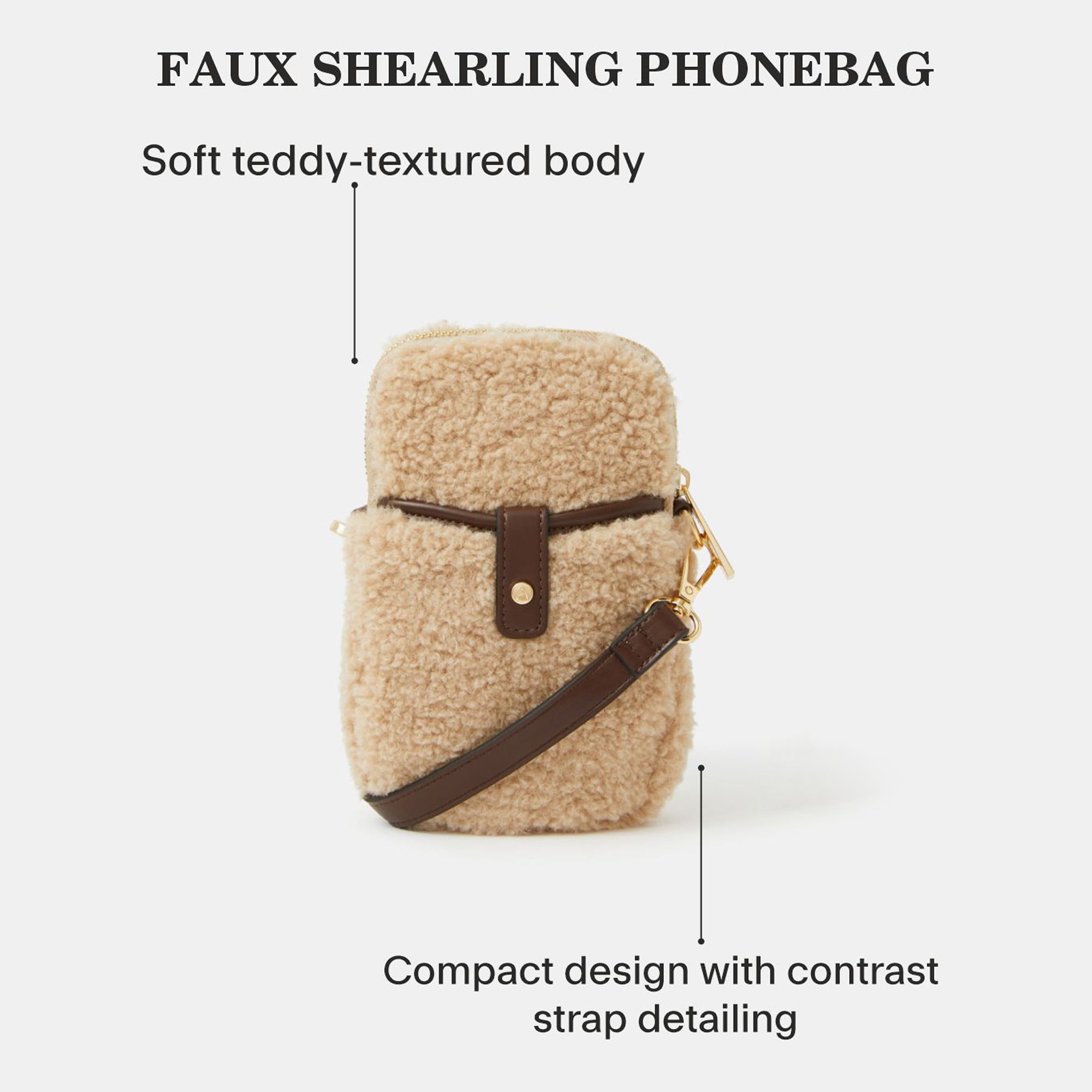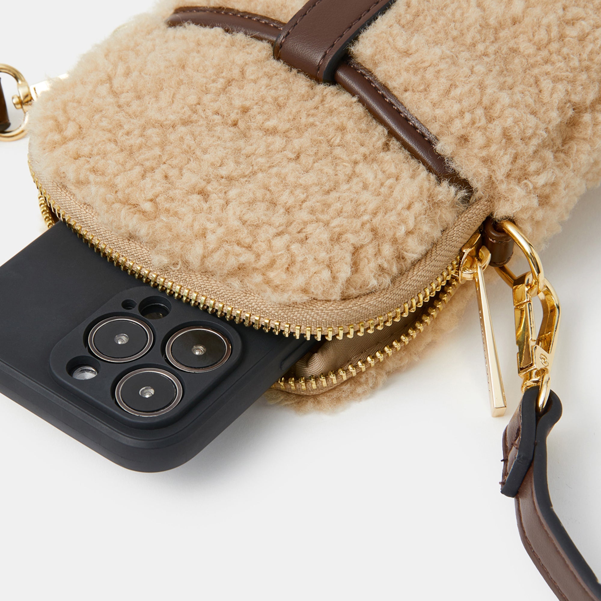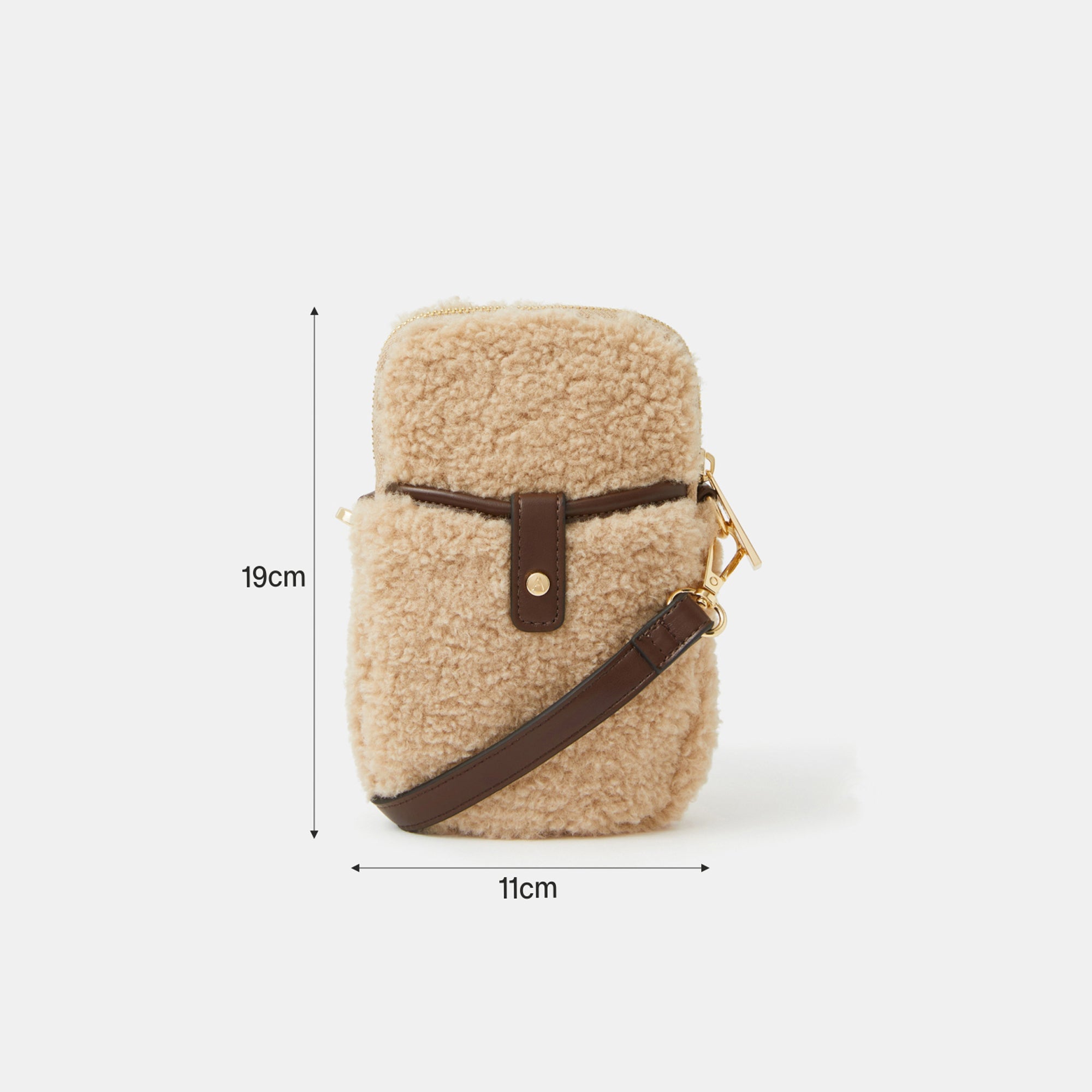 A cuddly home for your phone! Made from soft faux shearling fabric, this bag features a main phone-sized compartment with a zip fastening, front tab pocket and adjustable crossbody strap.