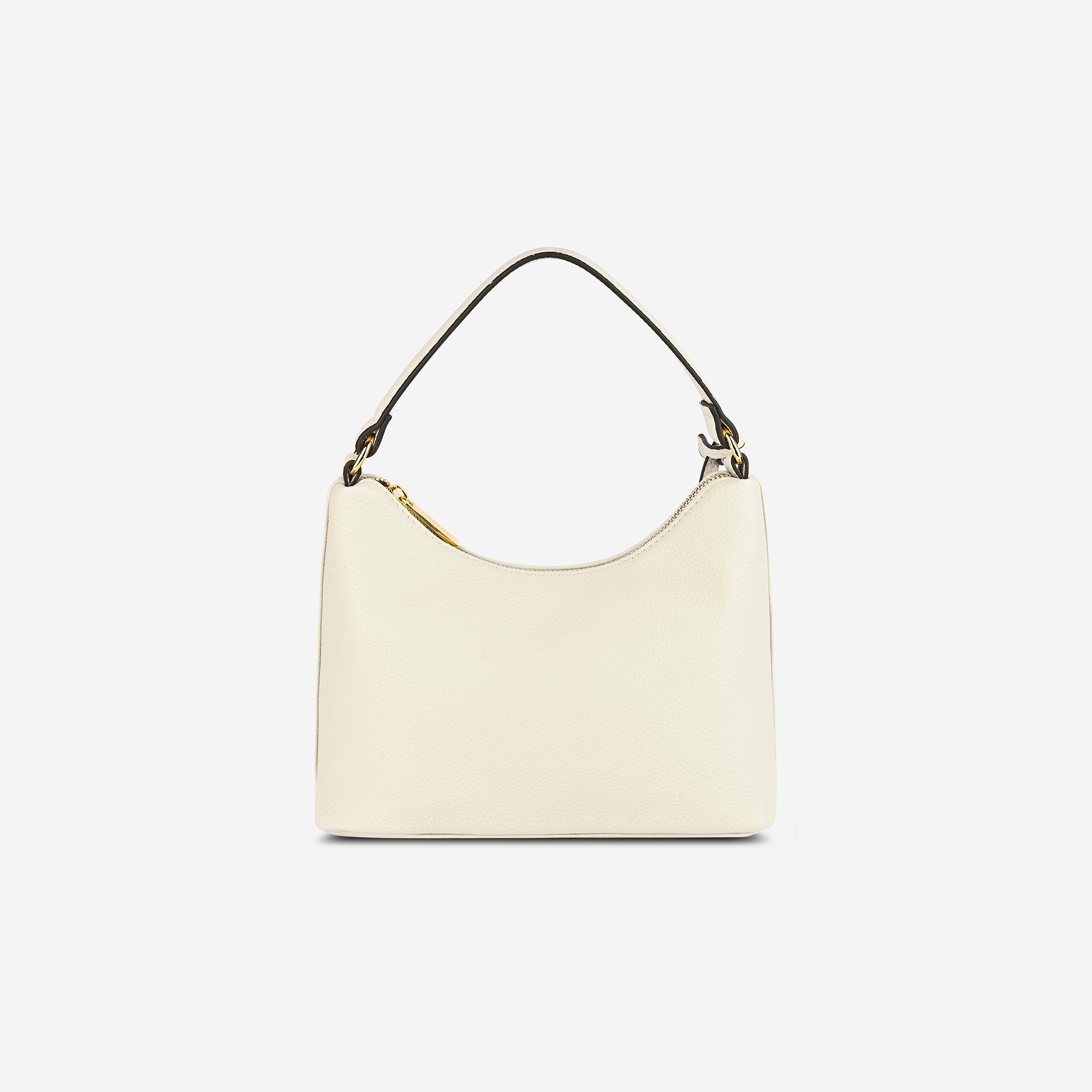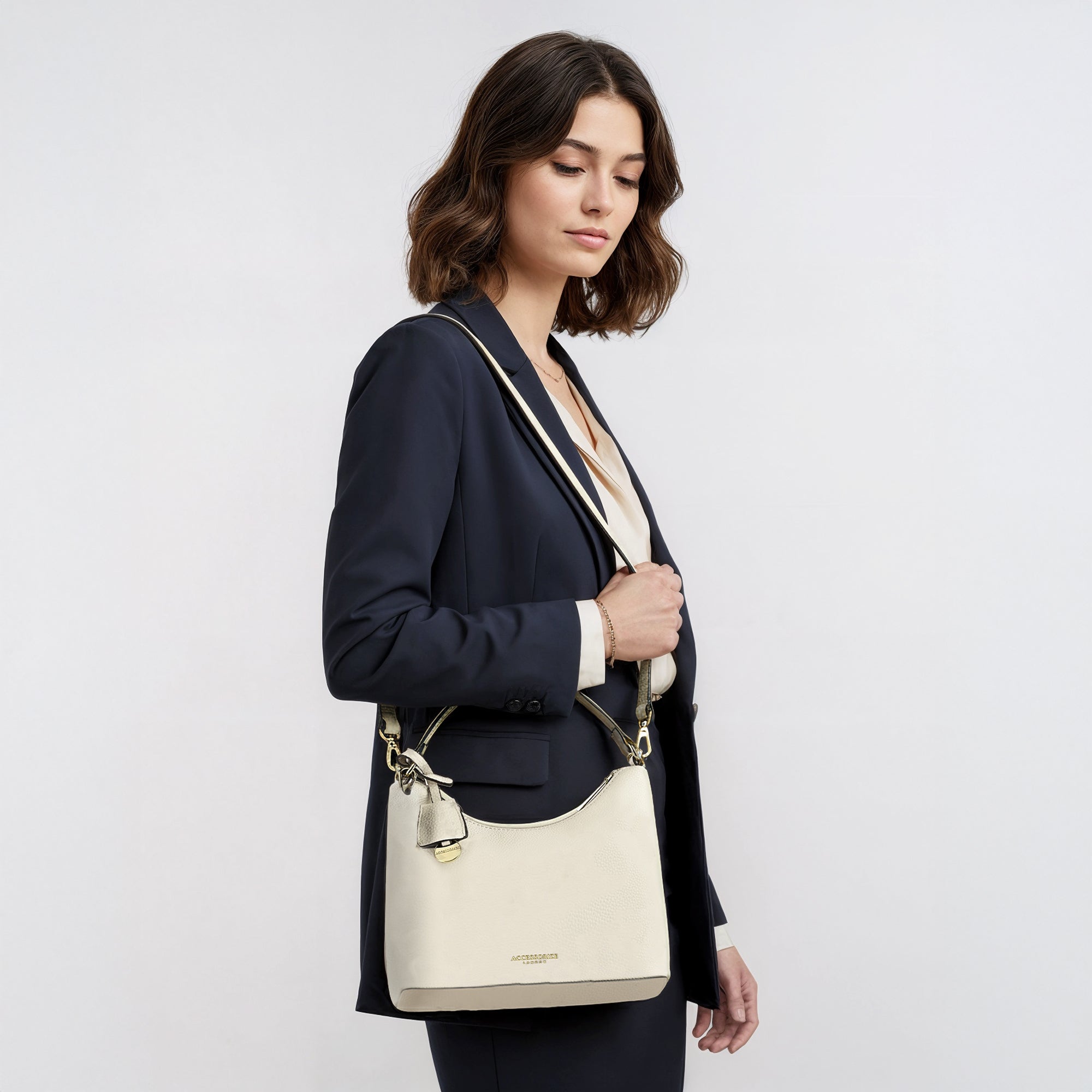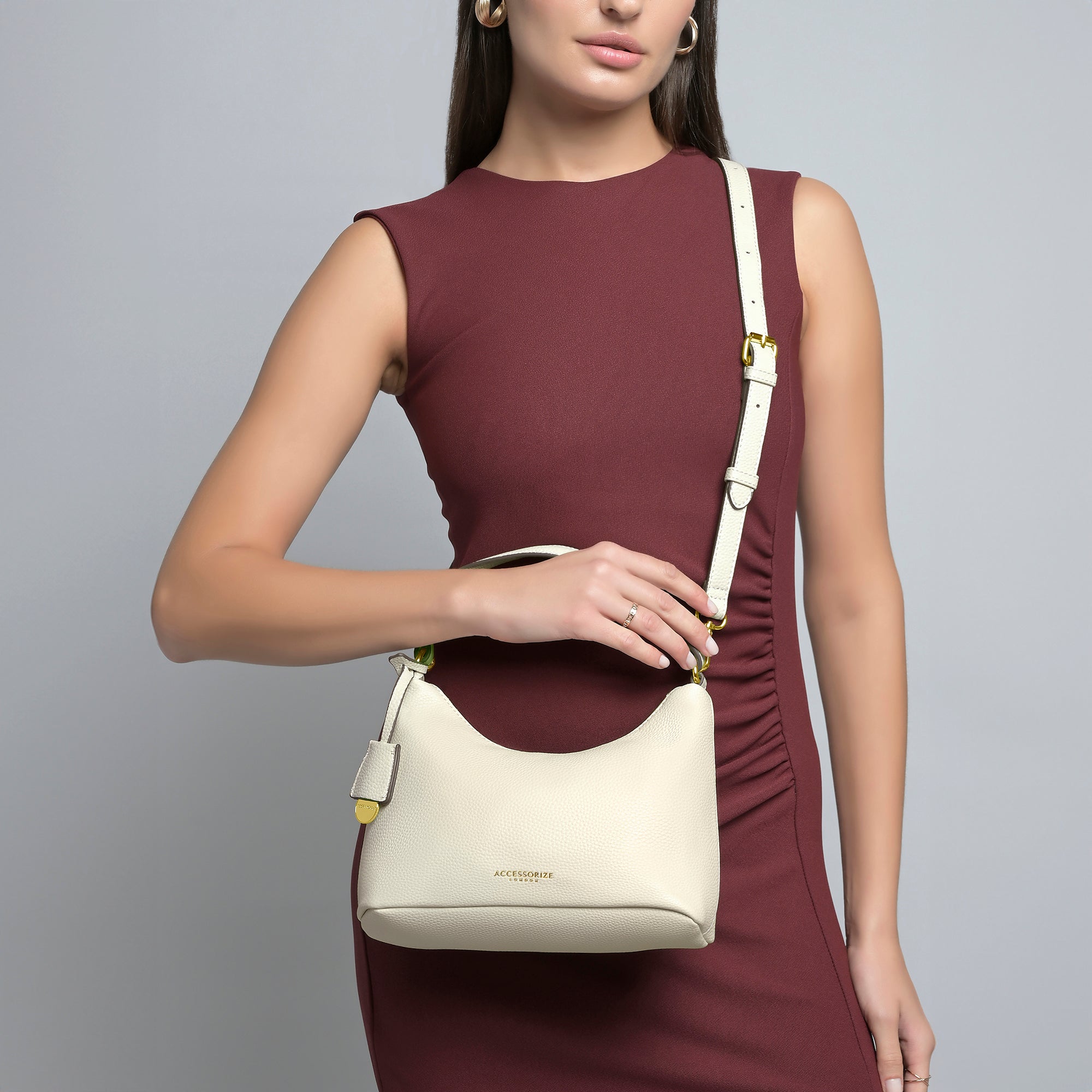 A minimal yet sophisticated essential, this cream shoulder bag is designed for effortless everyday style. Crafted in soft, textured faux leather, it features a structured hobo silhouette with a spacious interior to hold all your daily must-haves. The dual straps—an adjustable crossbody and a shorter top handle—offer versatile carrying options, while the gold-tone hardware and detachable tag detail add a polished finish. A timeless neutral that pairs easily with both casual and workwear looks, making it a must-have addition to your bag collection.