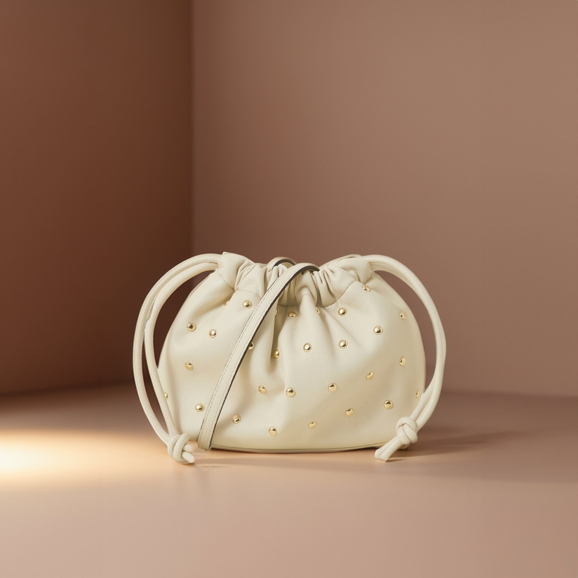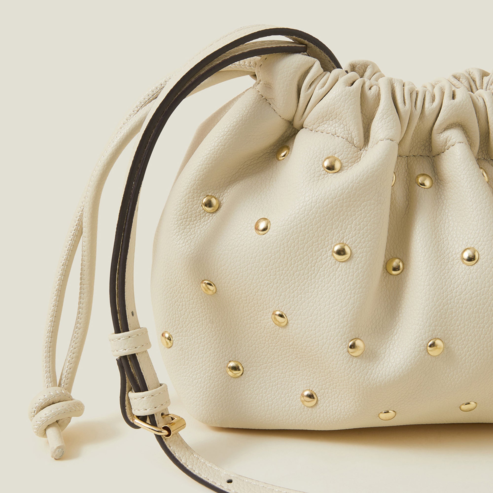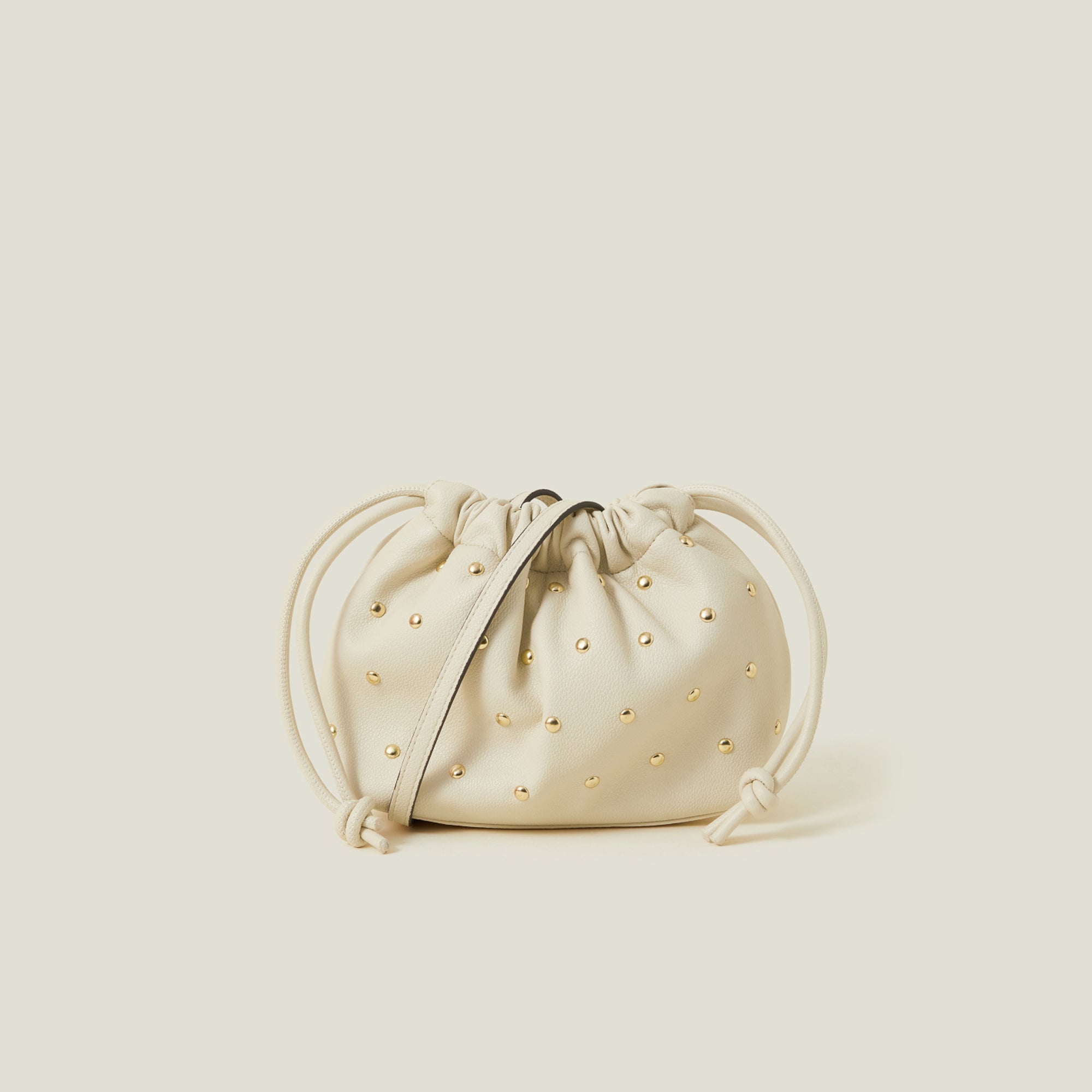 Cream Studded Drawstring Pouch Bag