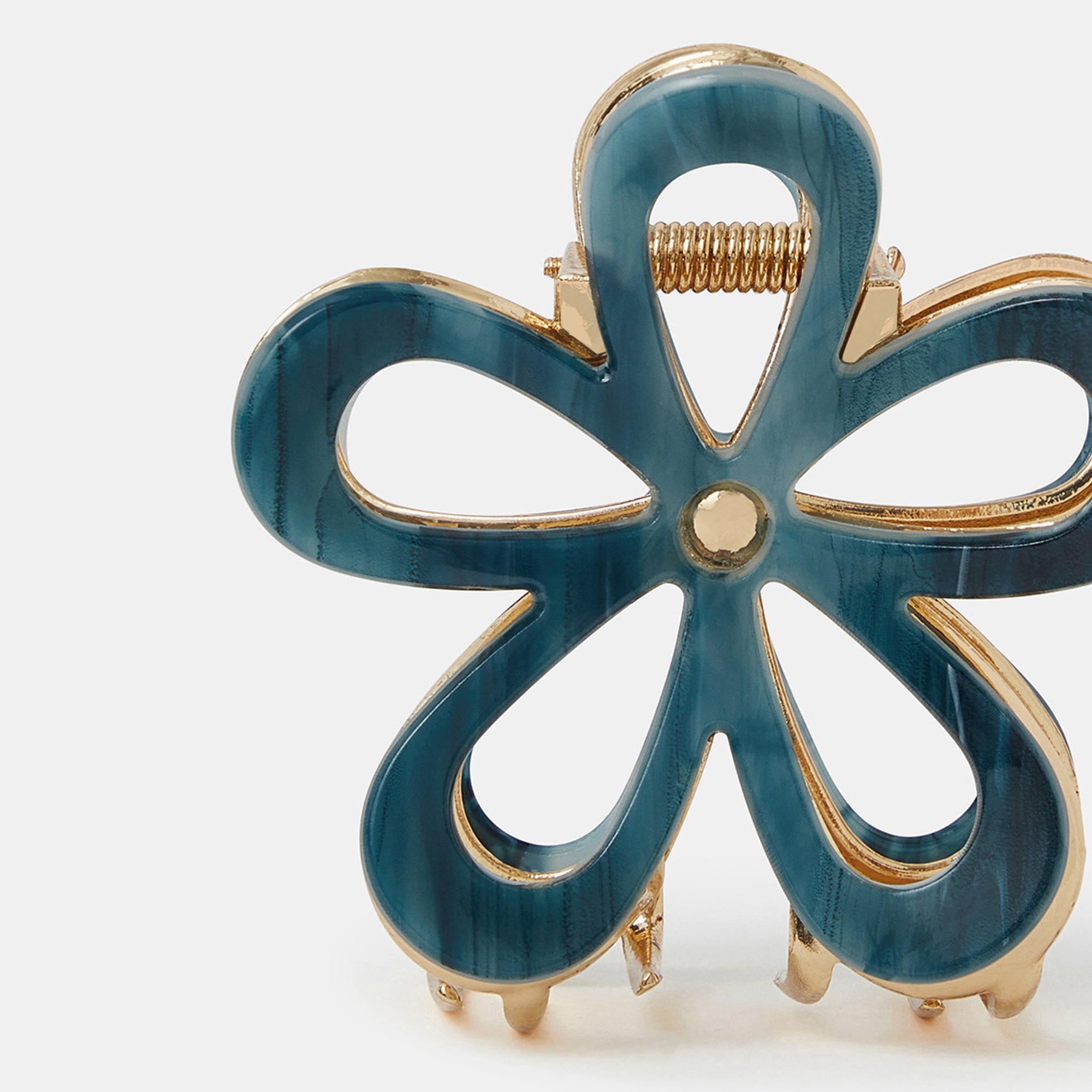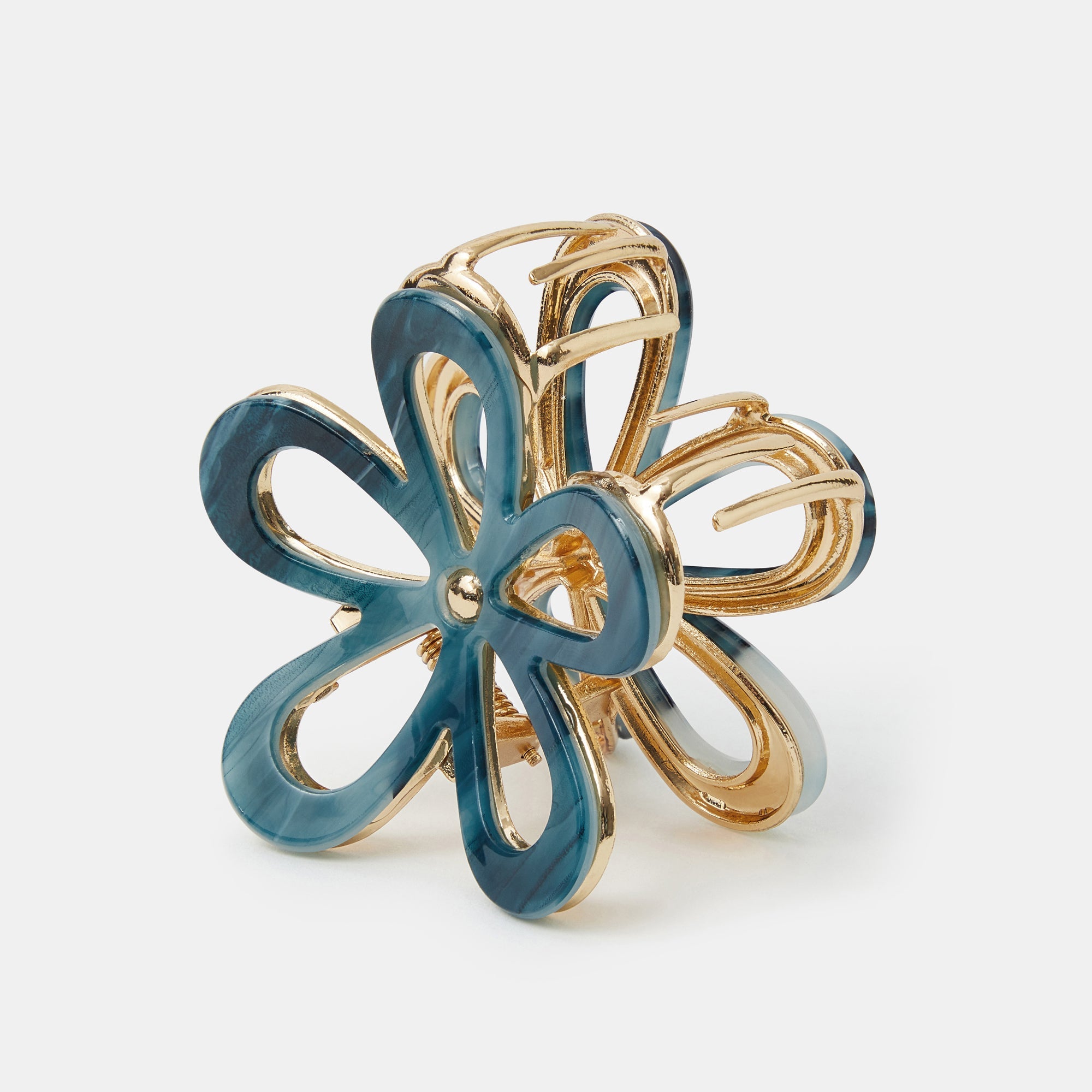 Made from sturdy gold-tone metal with a blue resin flower design, this claw clip is made to secure your updos (whilst looking cute) all day long.
