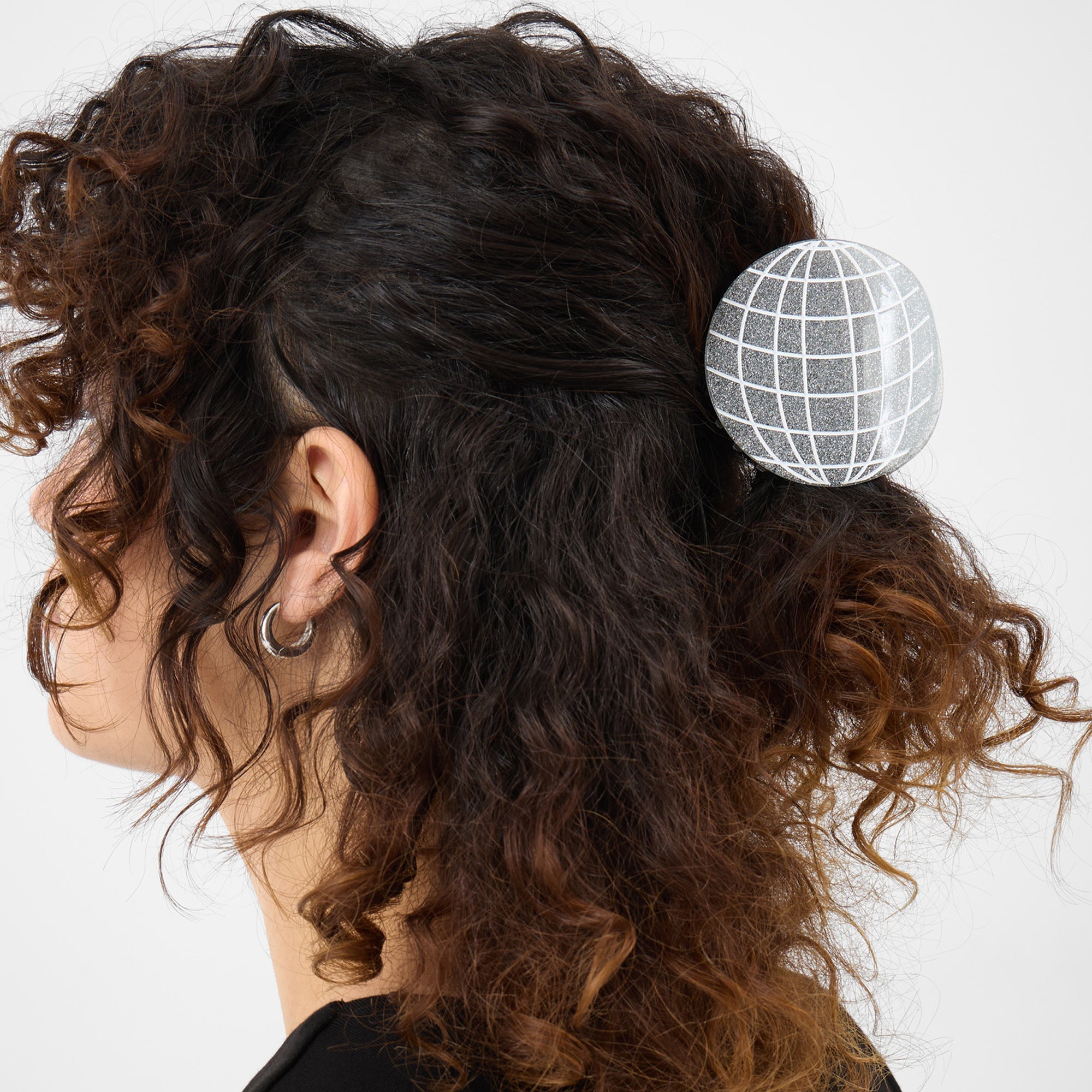 Hey party princess, this is for you! Shaped like a disco ball and covered in silver glitter, this claw clip is perfect for nights-out and house parties.