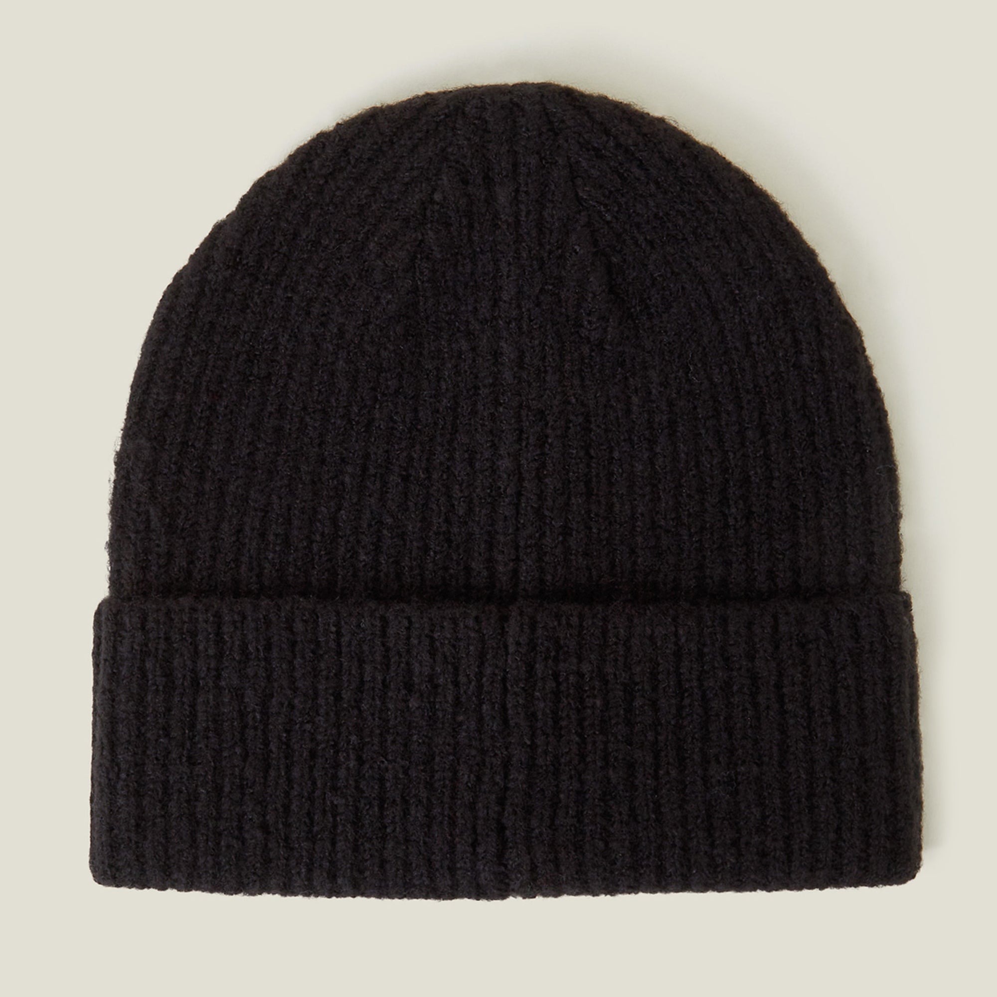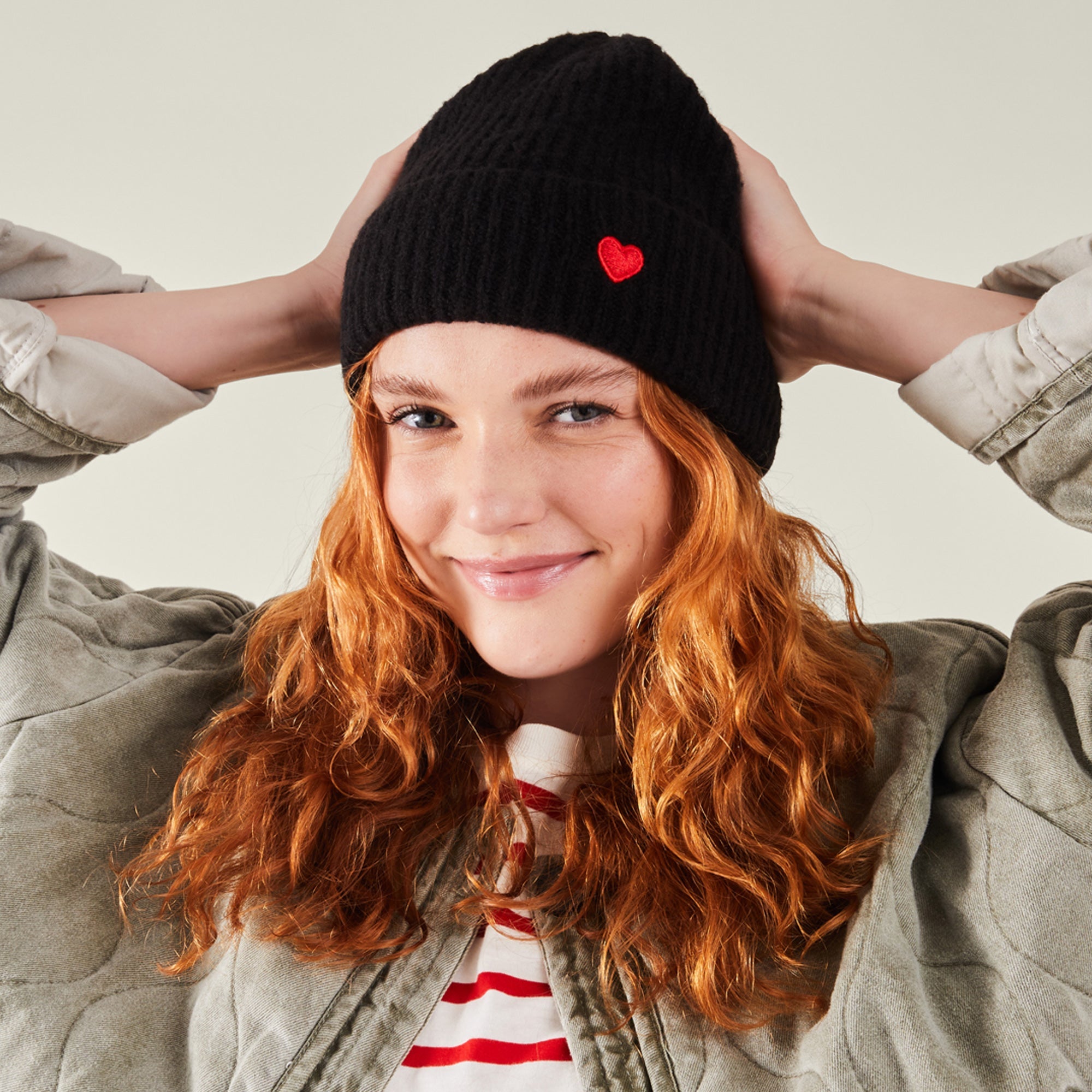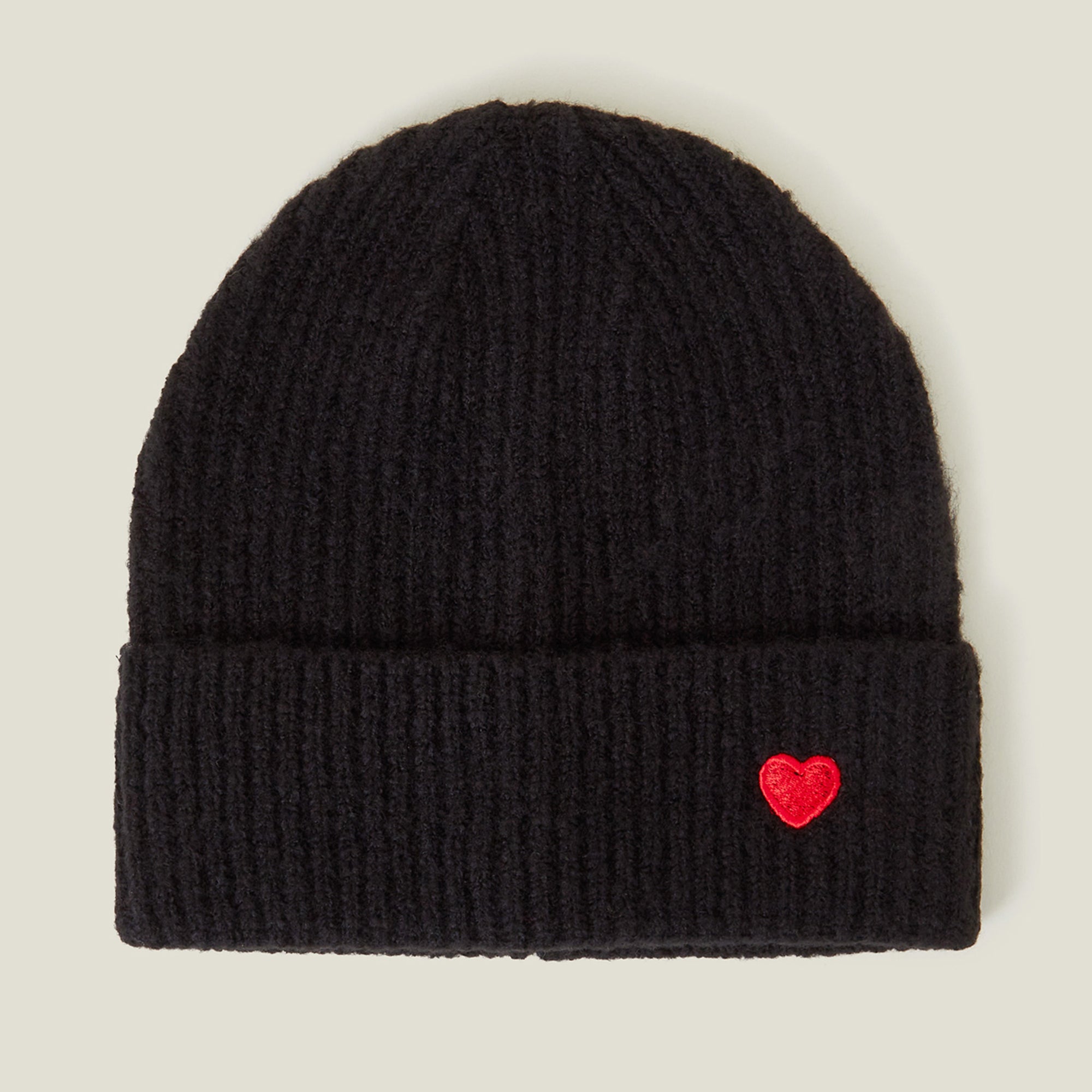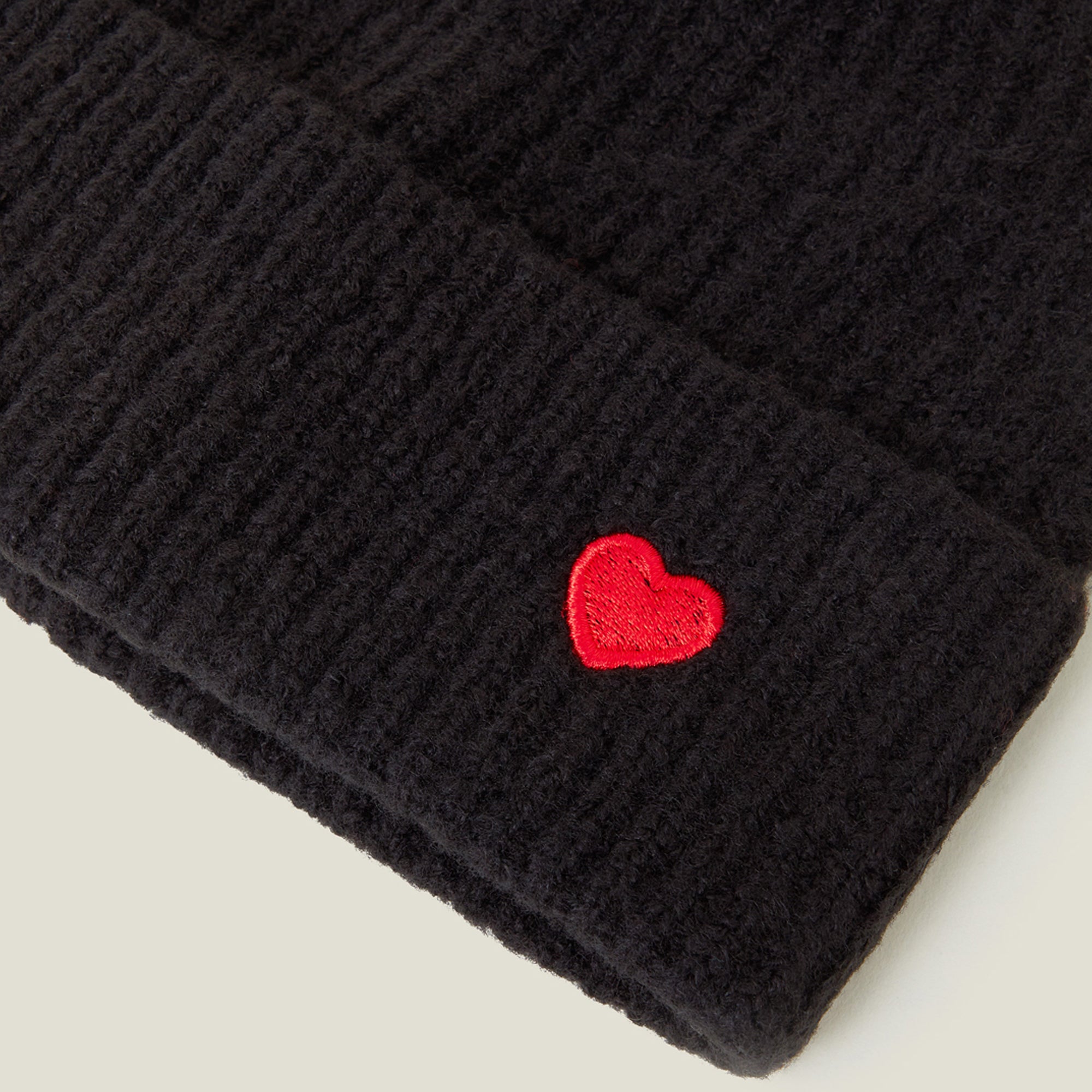 A love-ly addition to your winter warmers, this beanie hat is stitched in a classic design with a ribbed finish. Complete with an embroidered heart at the turned-up brim. Black