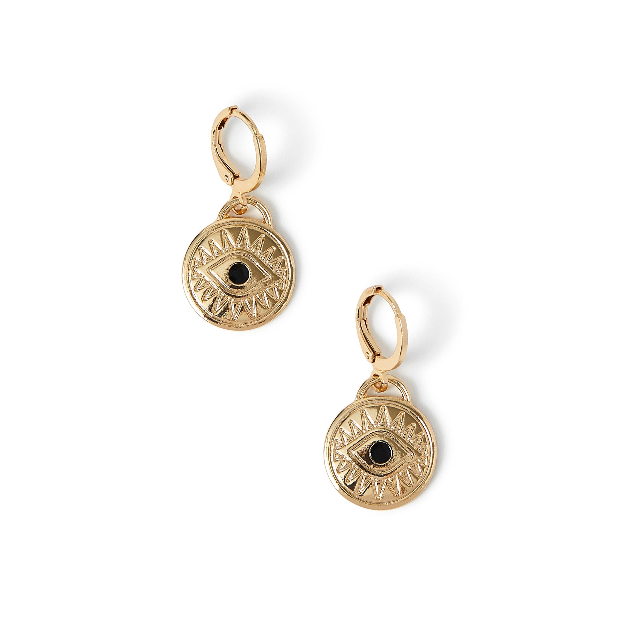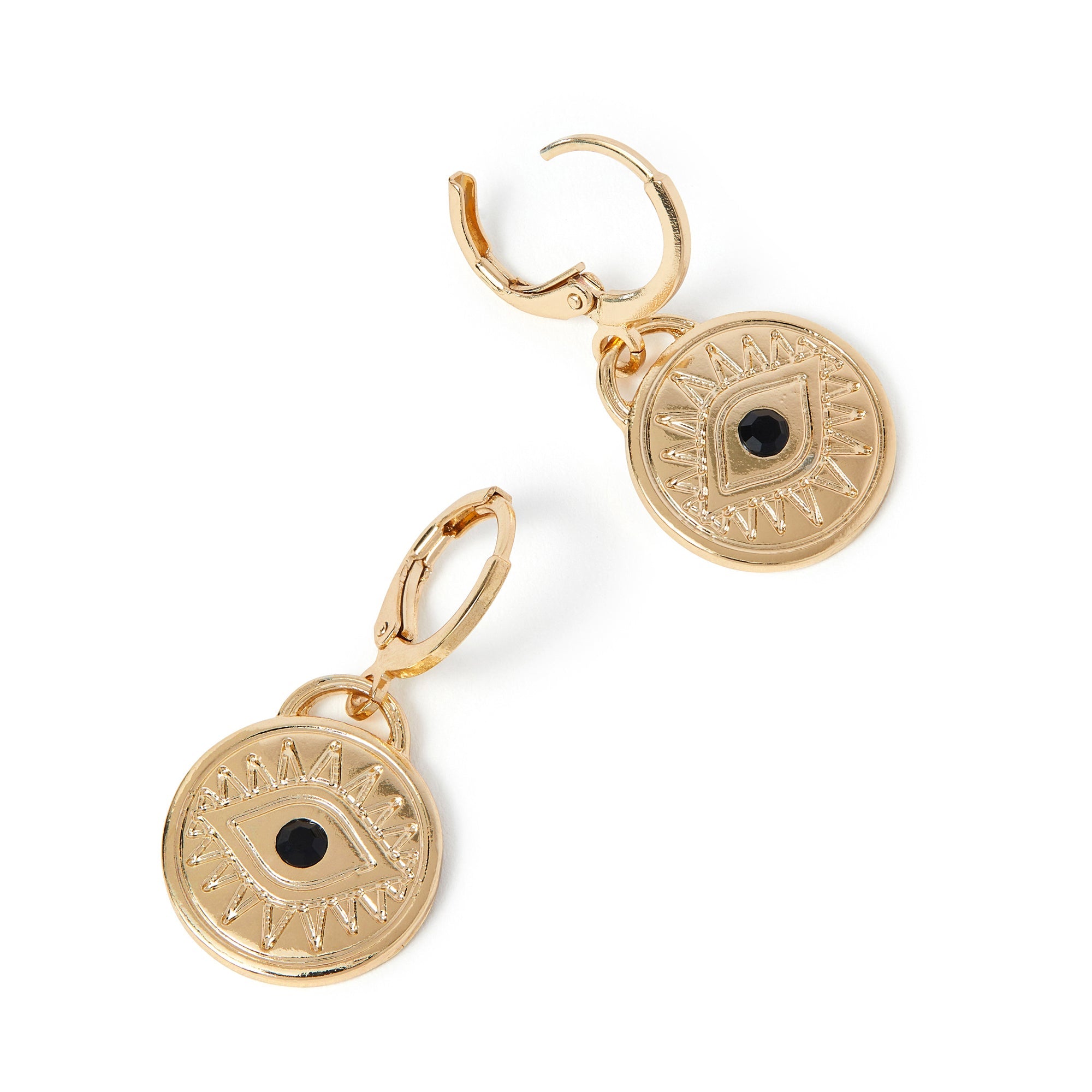 Symbolised as a form of protection from bad, negative energy, these earrings showcase an evil eye coin pendant dangling from a clasp hoop profile.
