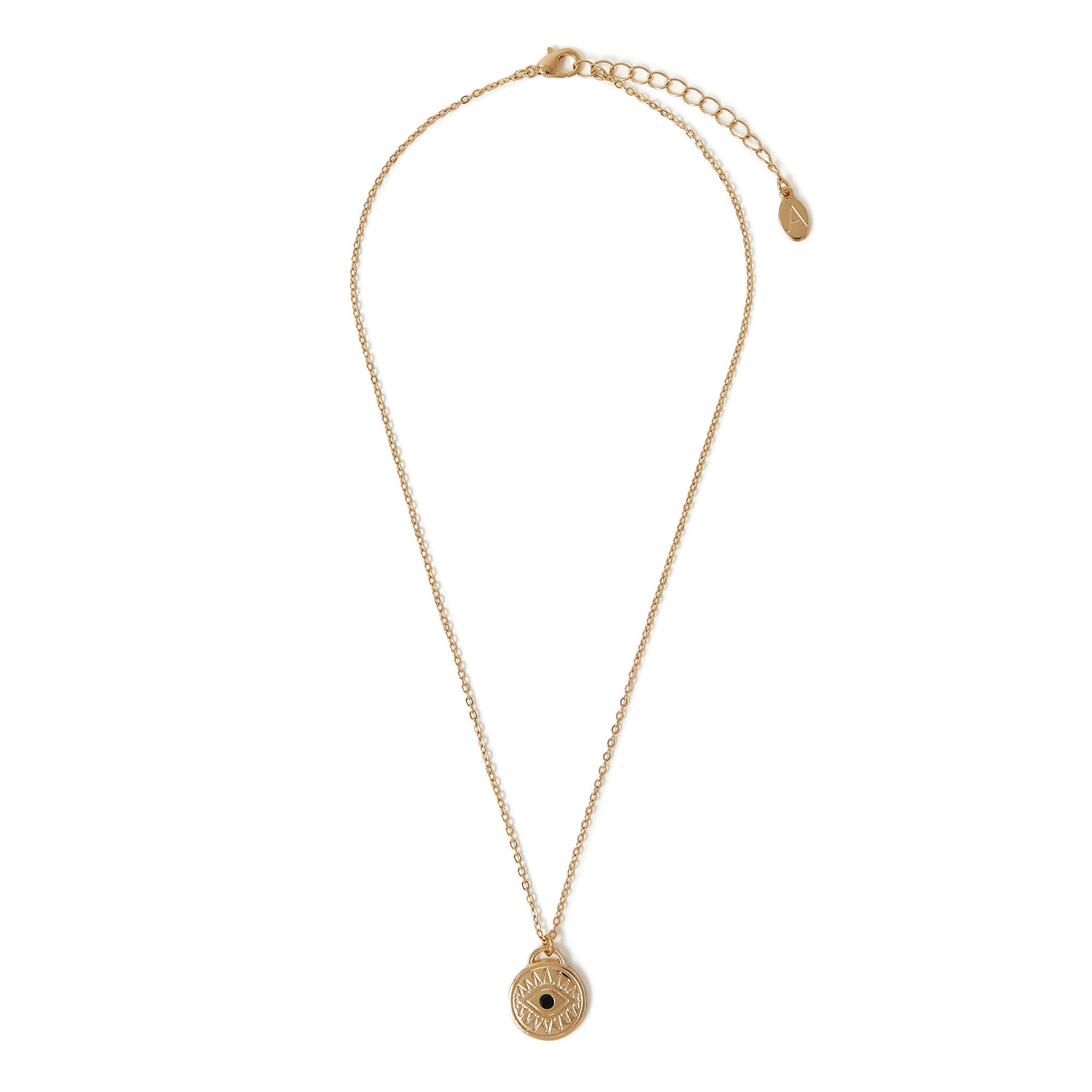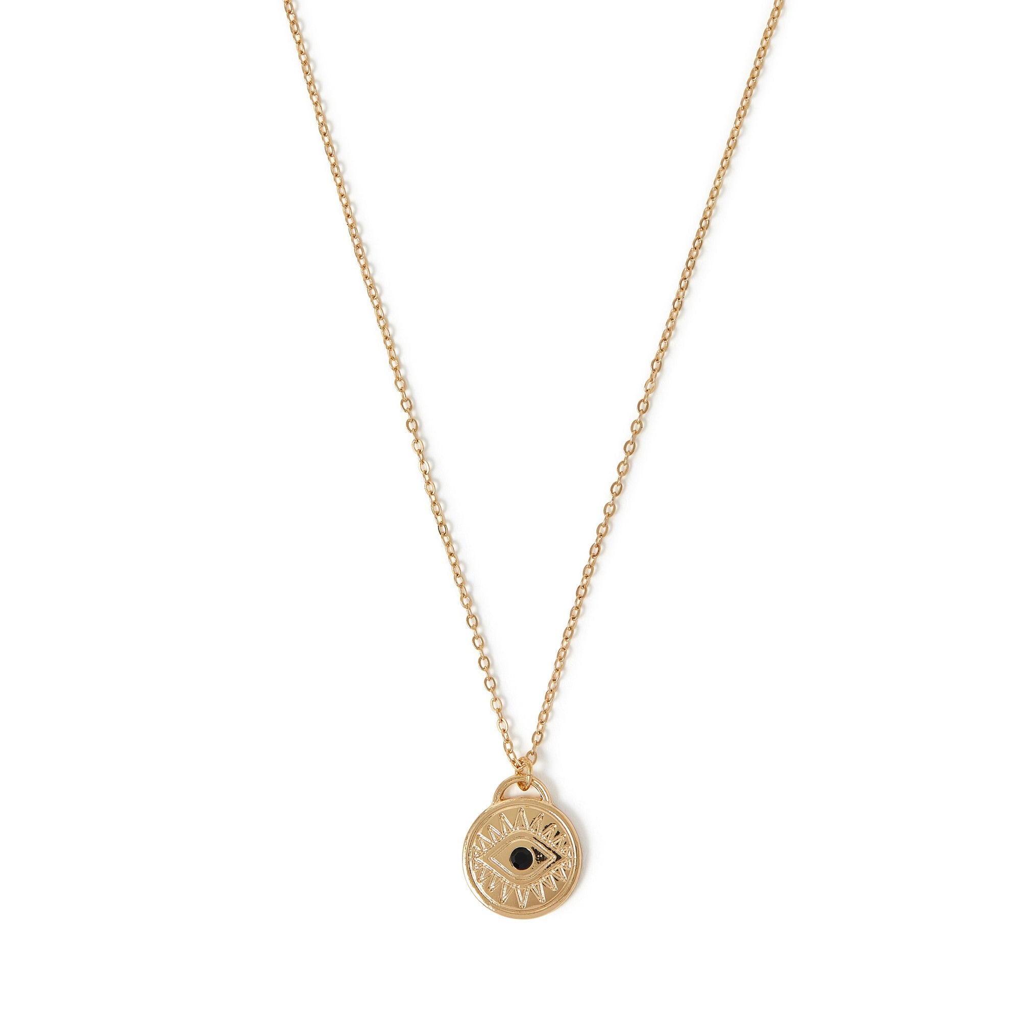 Symbolised as a form of protection against negative energy and bad vibes, this necklace showcases a coin pendant with an evil eye design.