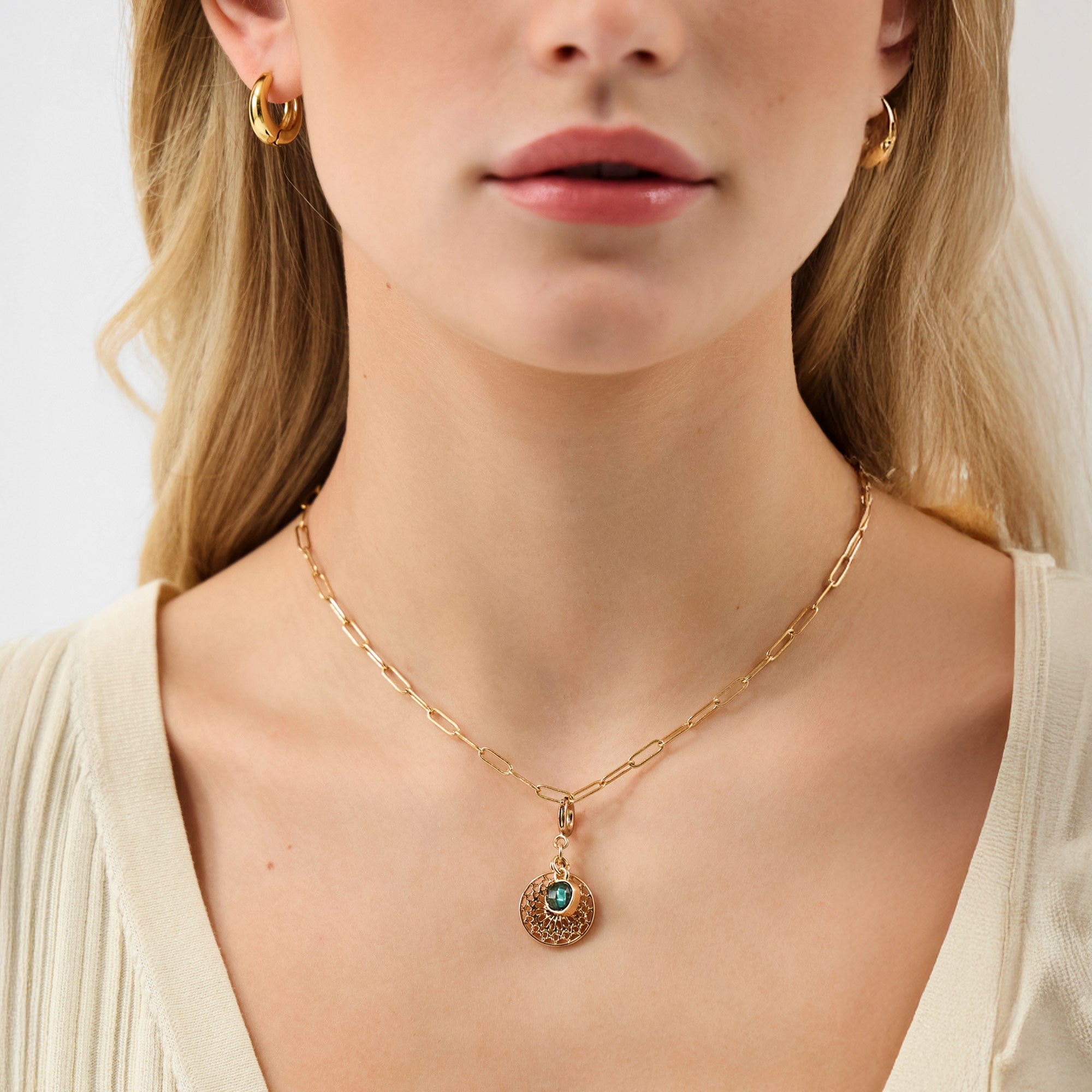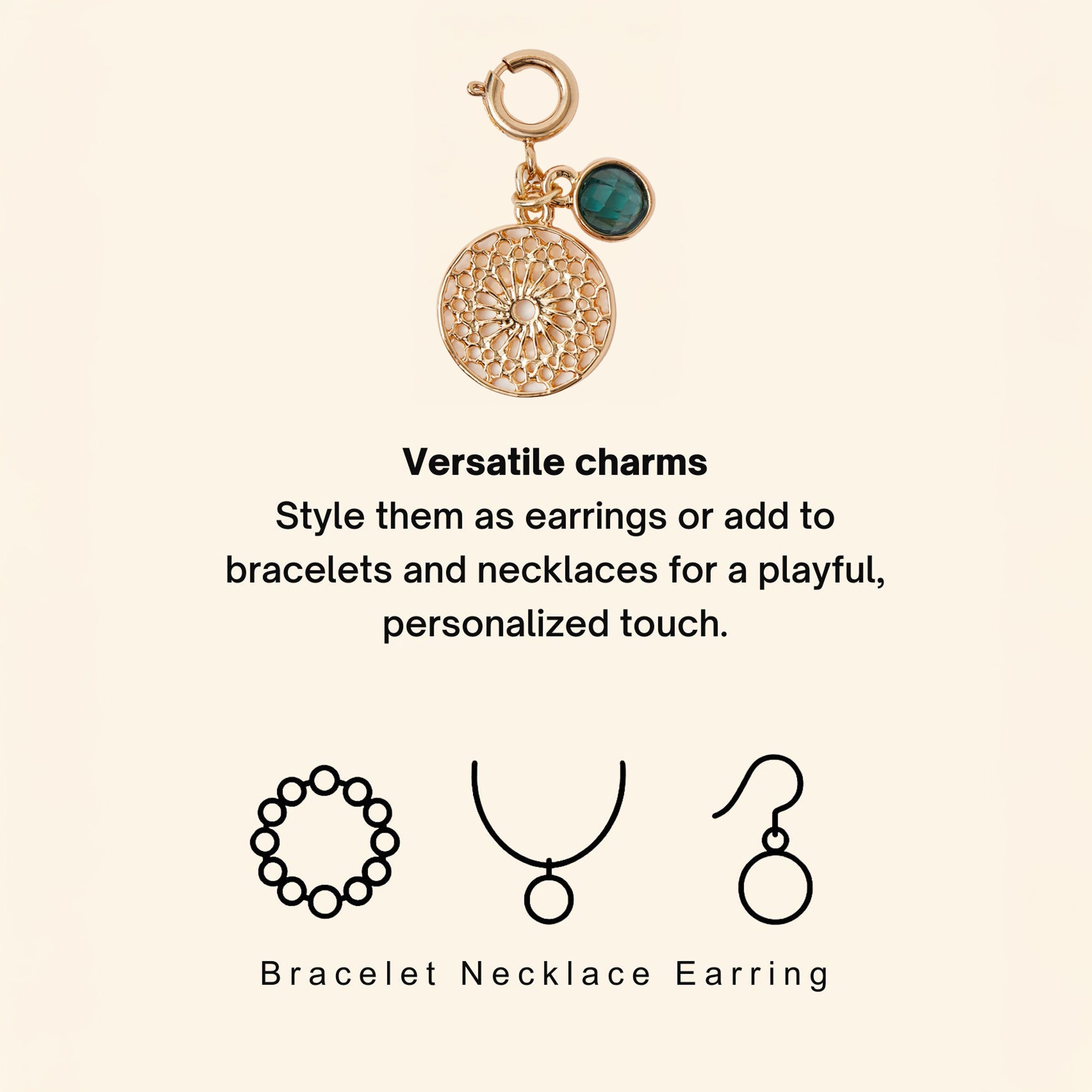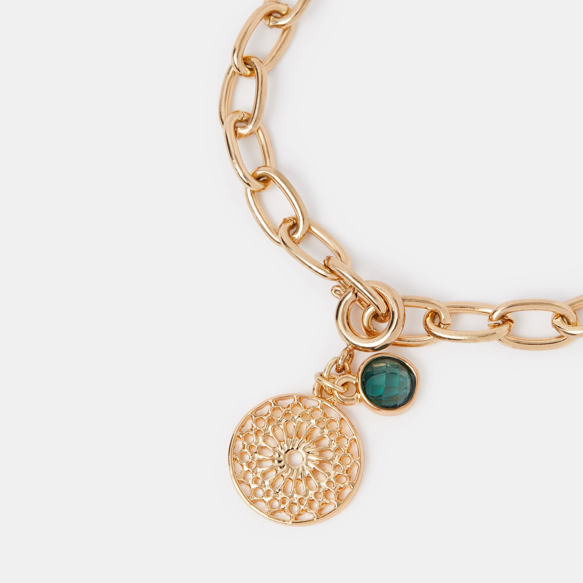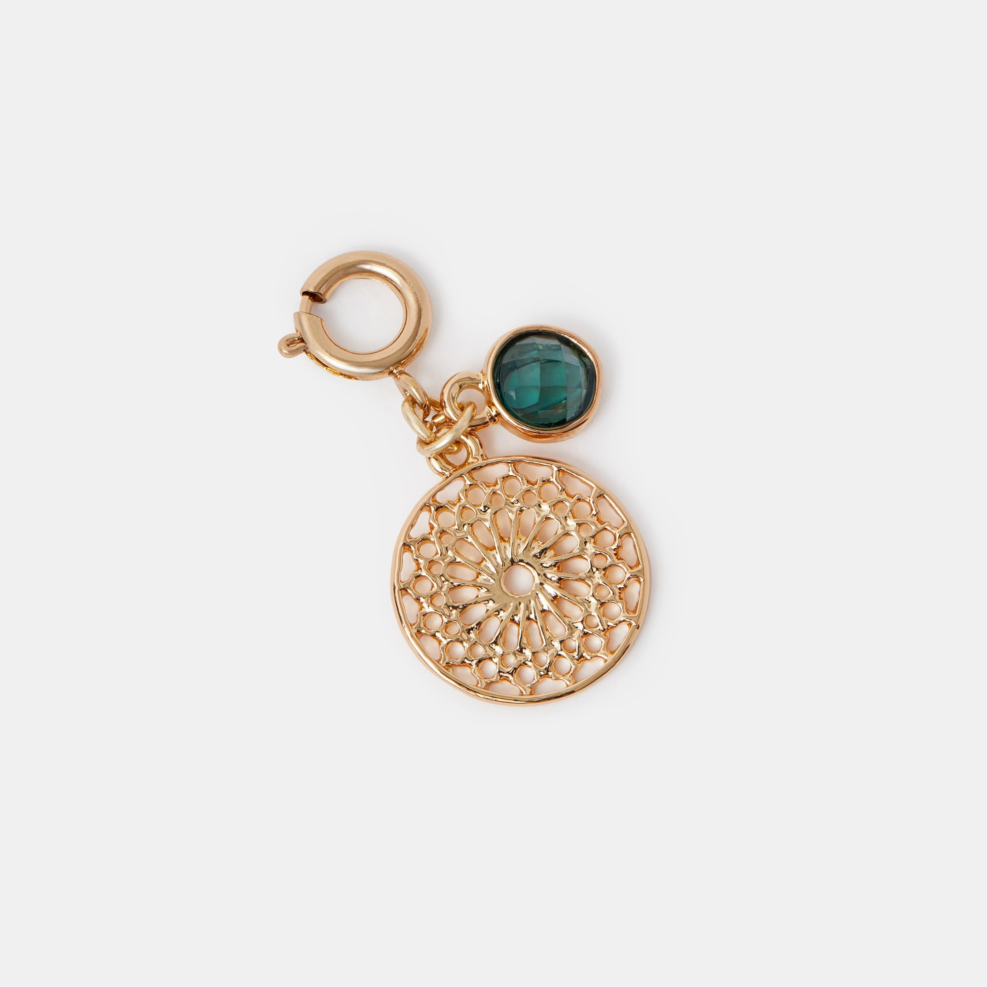 Designed with intricate shapes and a deep green gemstone, this gold-tone filigree charm is a unique addition to your jewellery selection. Attach it to your necklace or bracelet using the round clip fastening.