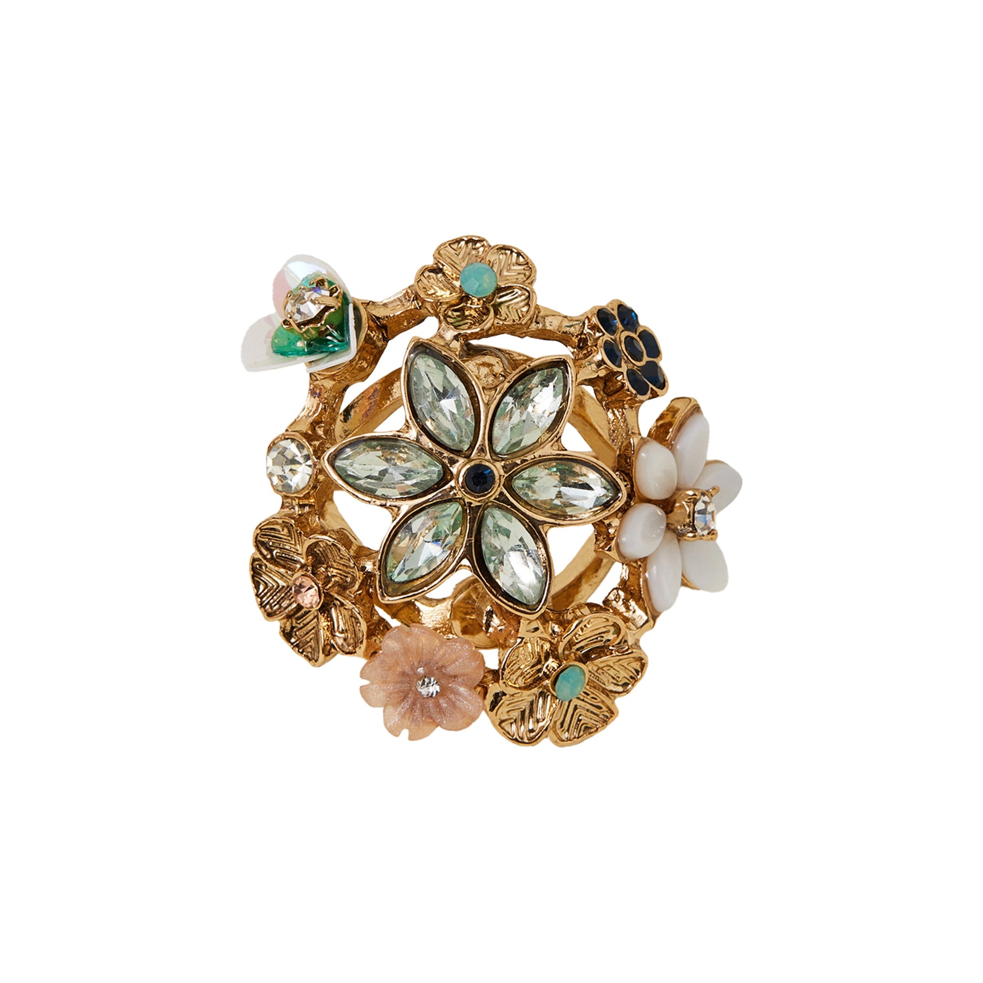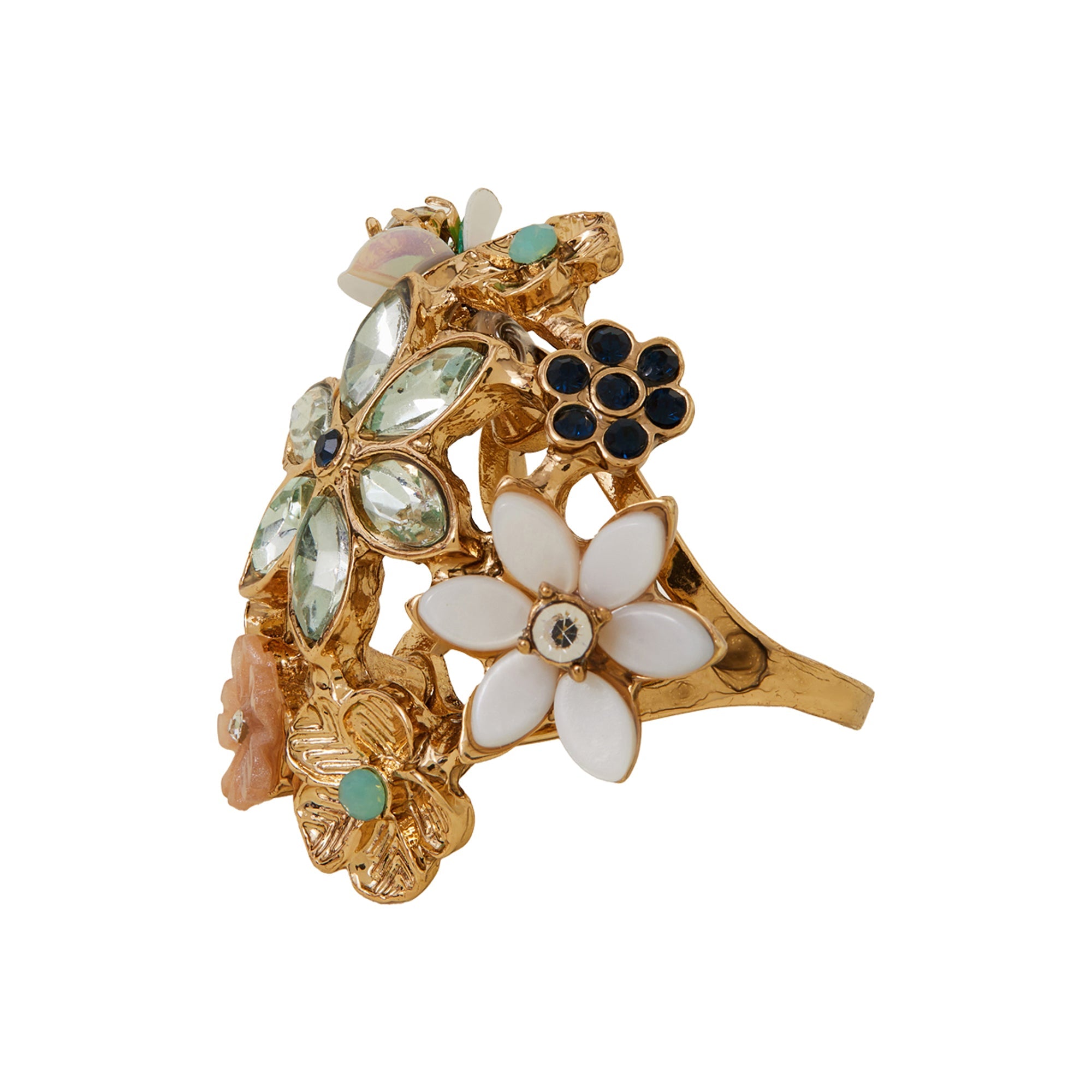 Wear the whole bouquet on your hand with this ring. Encrusted with diamantes, gems, and stones, this statement ring is dipped in gold-tone metal for an ethereal finish.