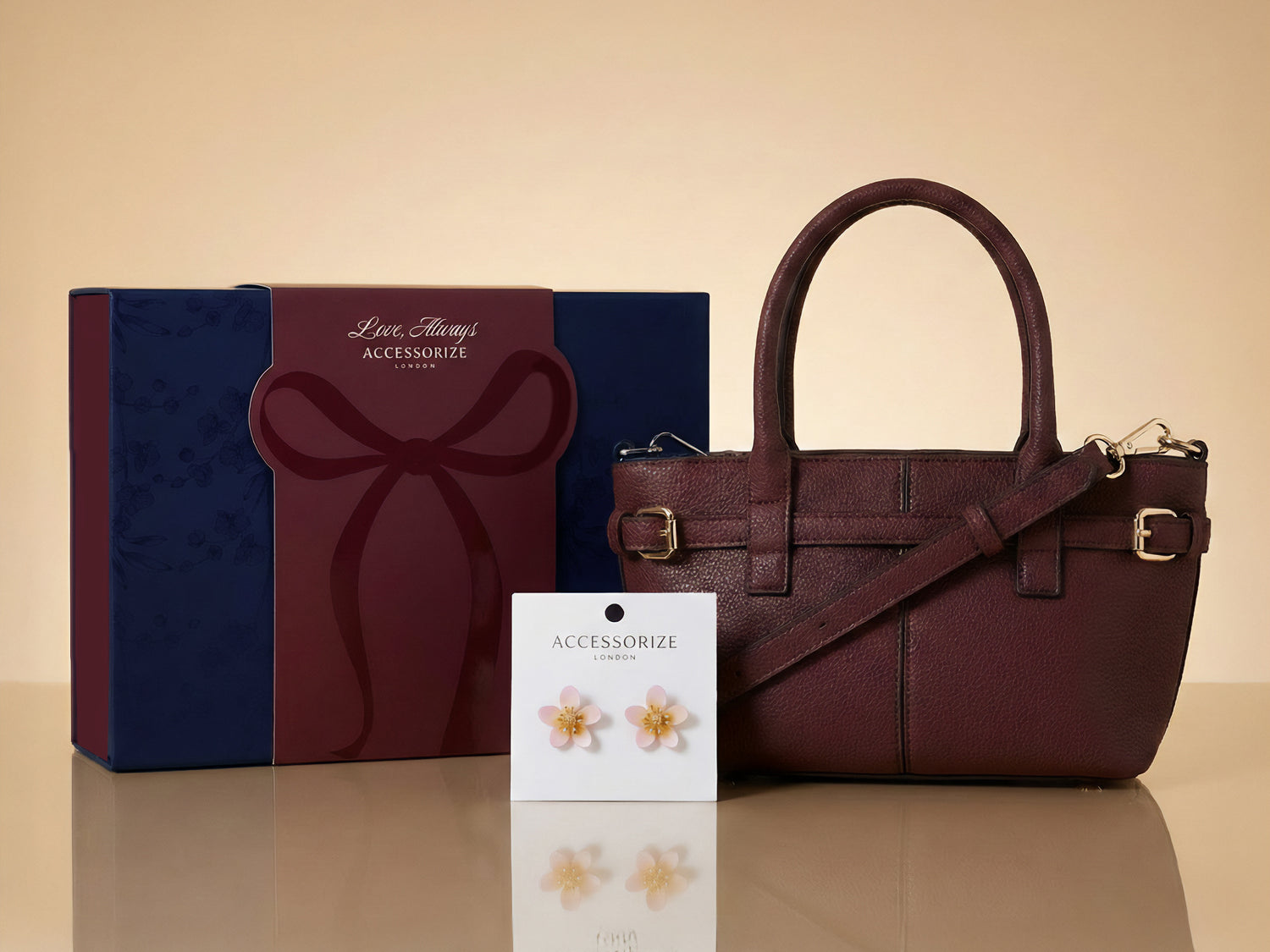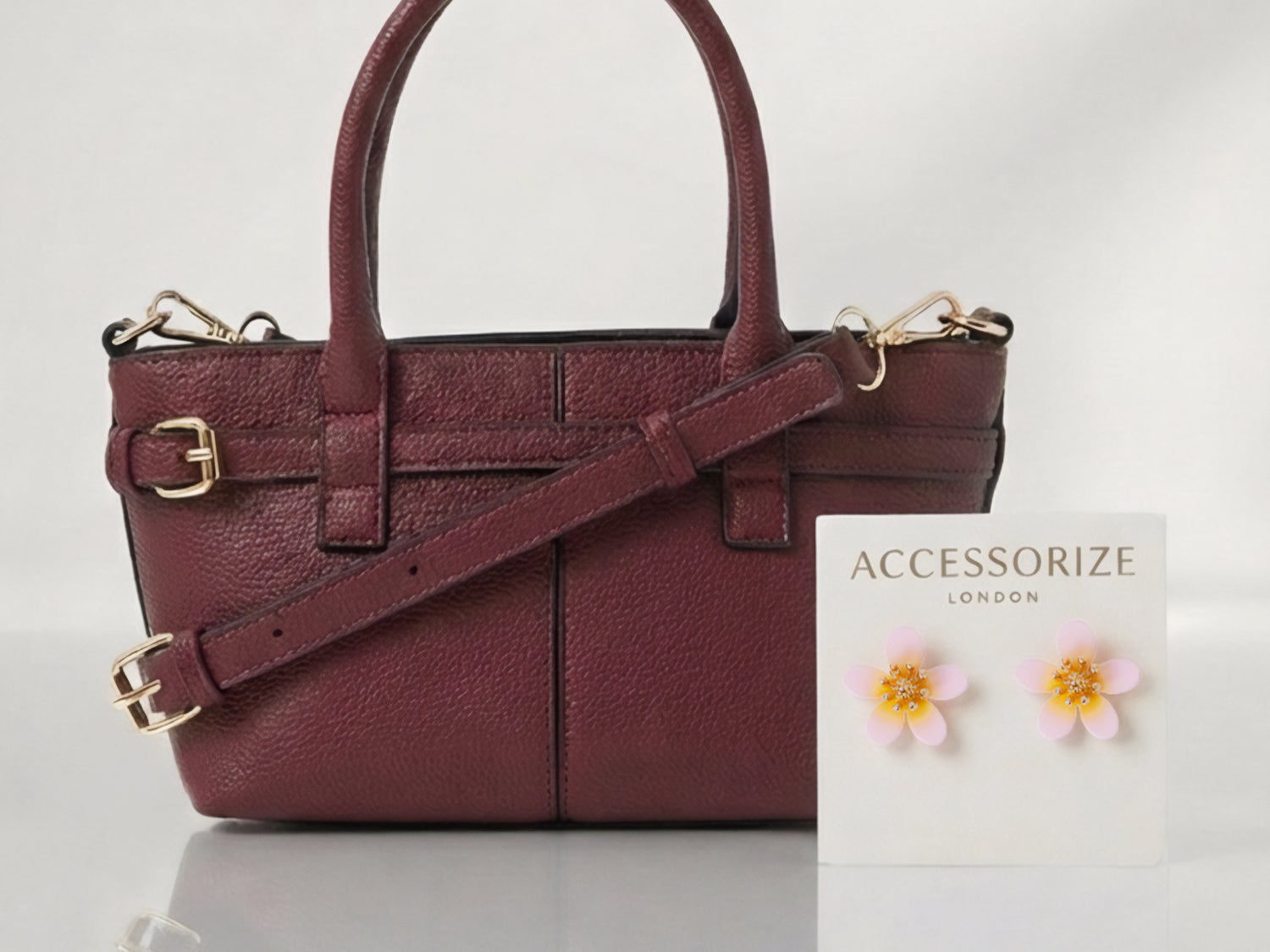 Thoughtfully curated for Valentine’s gifting, this elegant combo from Accessorize London pairs soft femininity with everyday sophistication. The delicate floral stud earrings, finished in gentle pink tones with a golden center, add a romantic and playful charm to any look. Complementing them is a Buckle Strap Handbag in a rich wine hue, designed with clean lines, dual handles, and a detachable sling strap for versatile styling. Wear the earrings to add a subtle pop of romance, while the compact tote completes the outfit with polished elegance—perfect for brunch dates, evenings out, or special moments. A timeless gift that blends charm, style, and practicality.