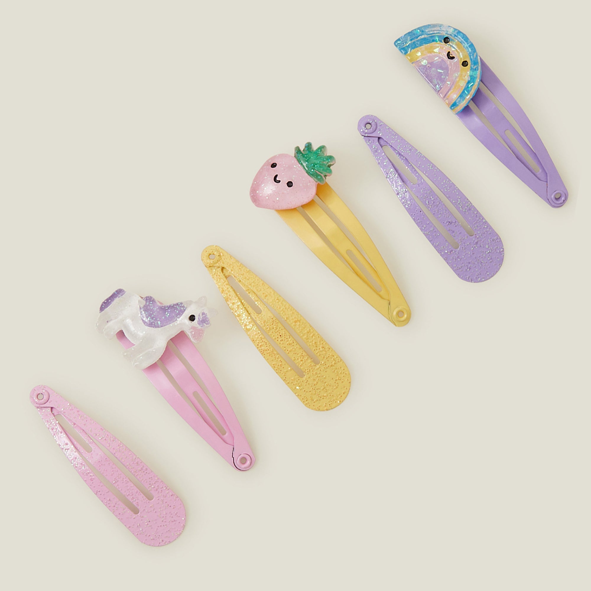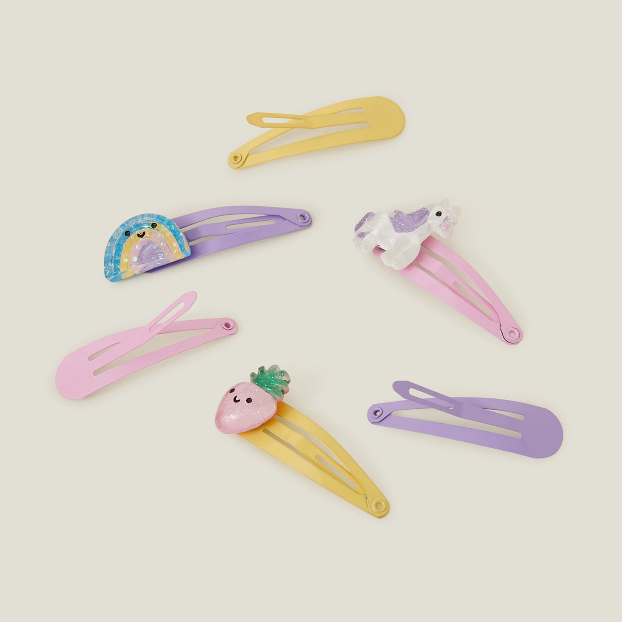 Equal measures playful and practical, these hair clips not only keep stray hairs in place, but they add cute accents to all their hairstyles. Dipped in pretty pastel tones with rainbow, strawberry, and unicorn designs.