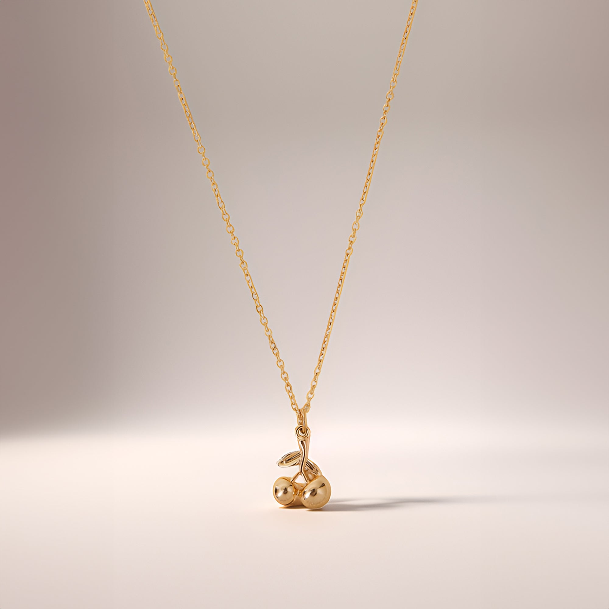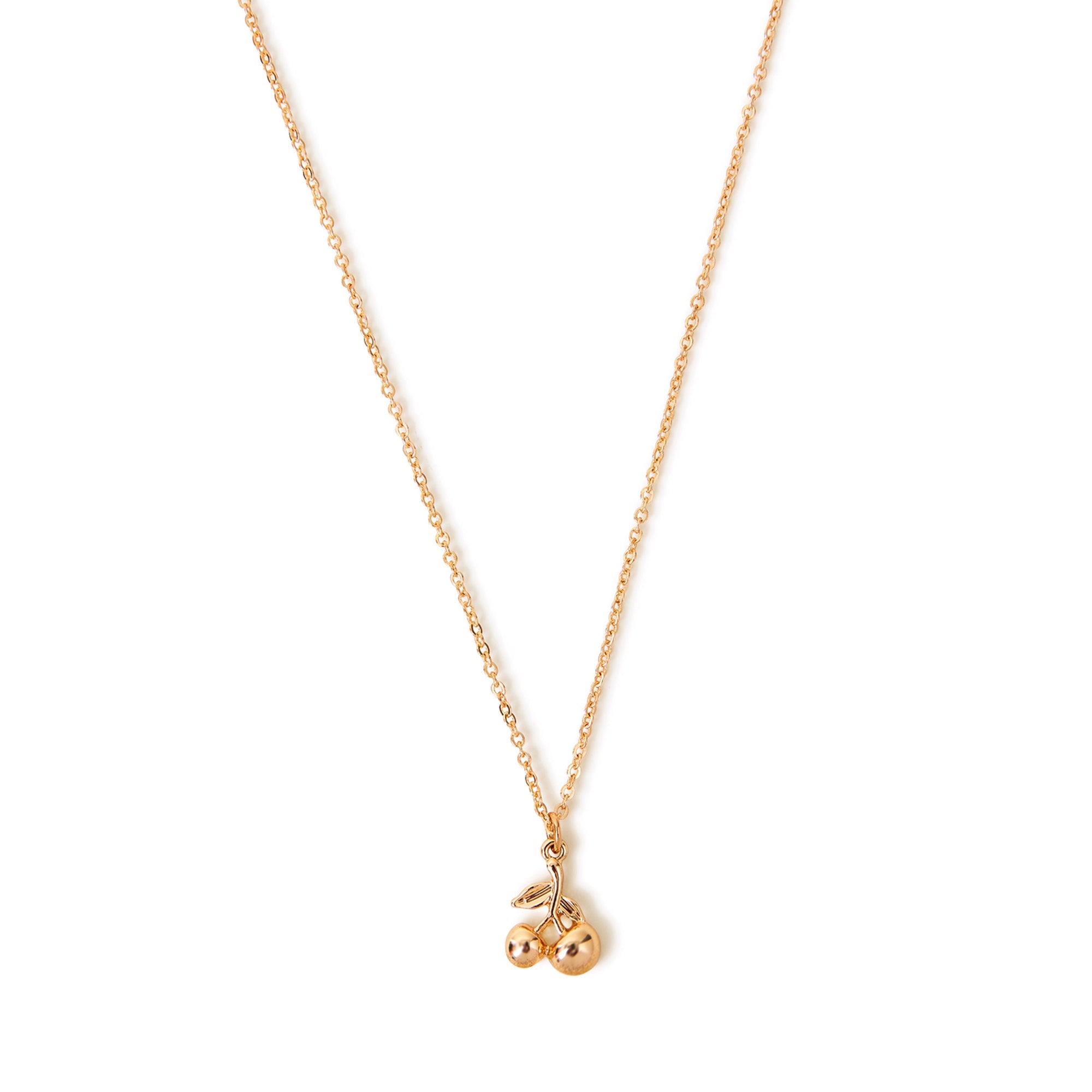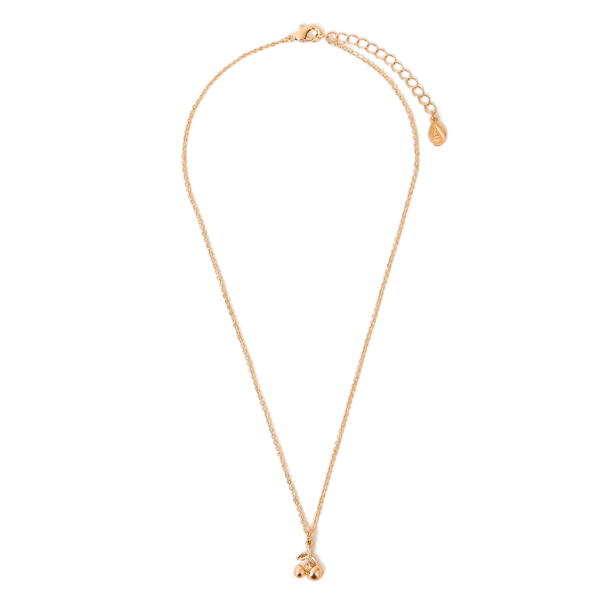 Cherr-ific. Dipped in gold, this necklace boasts an adorable cherry pendant on a fine chain. Fastens with a lobster clasp and extender.