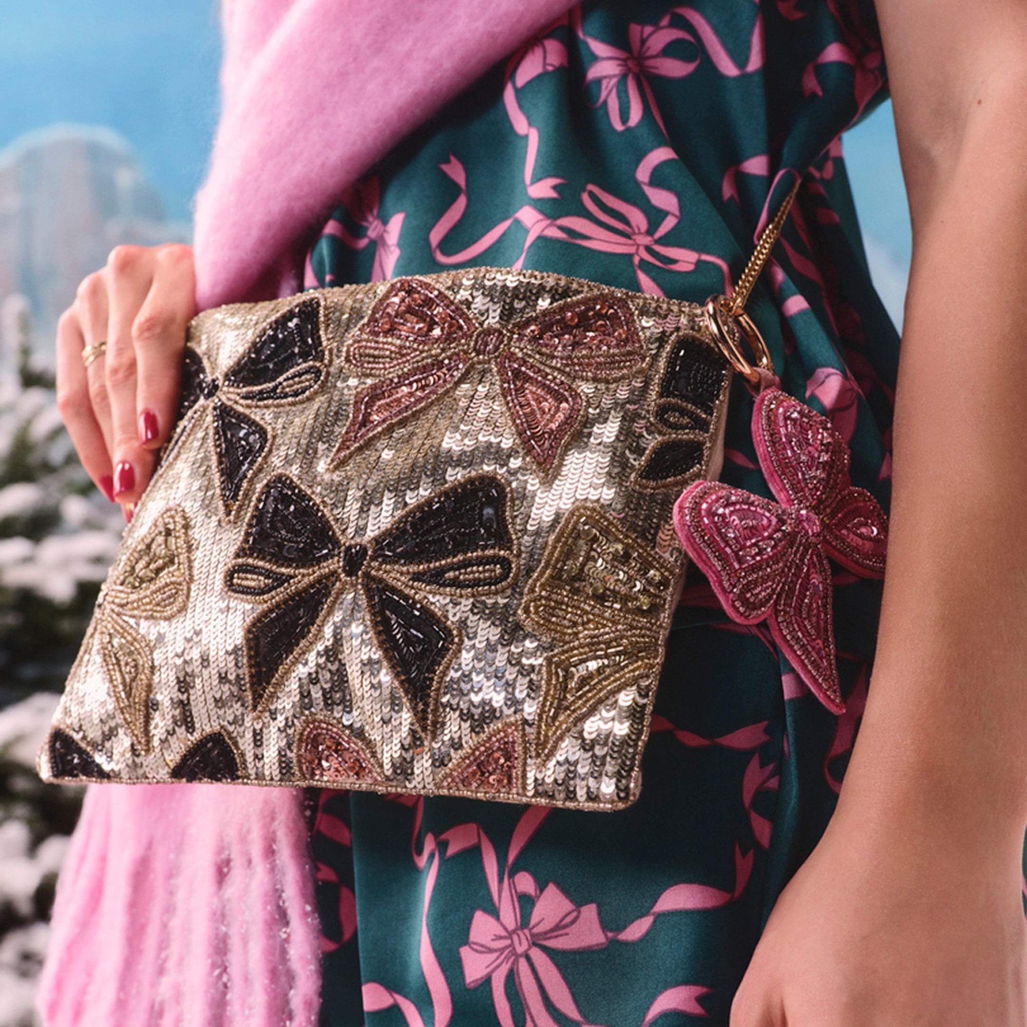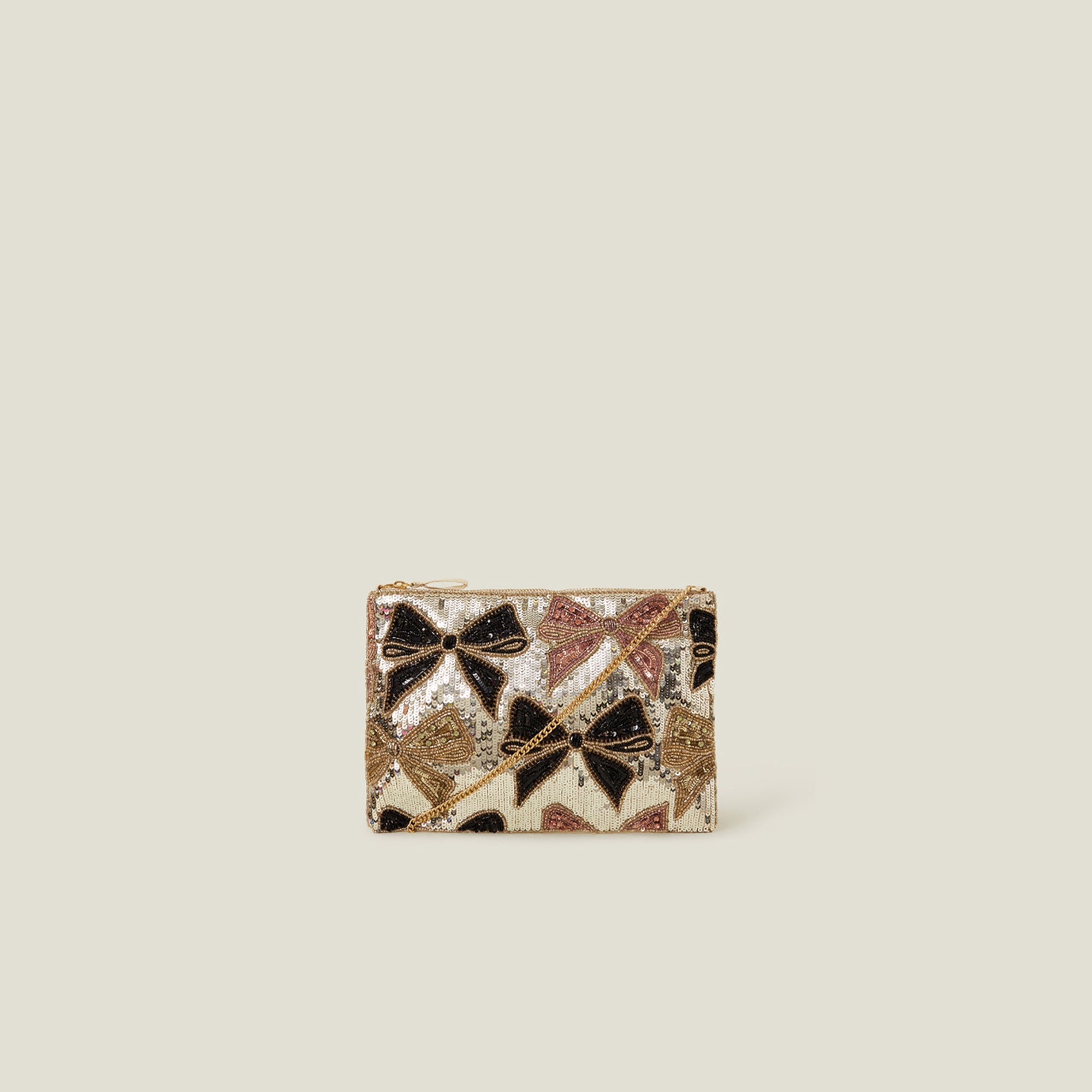 We're not letting go of the bow trend any time soon... And neither are you. Embellished with all over sequins in a bow design, this clutch bag is a perfectly sparkly addition to your going out look. Fastens with a zip to the top and finished with a gold-tone chain strap.