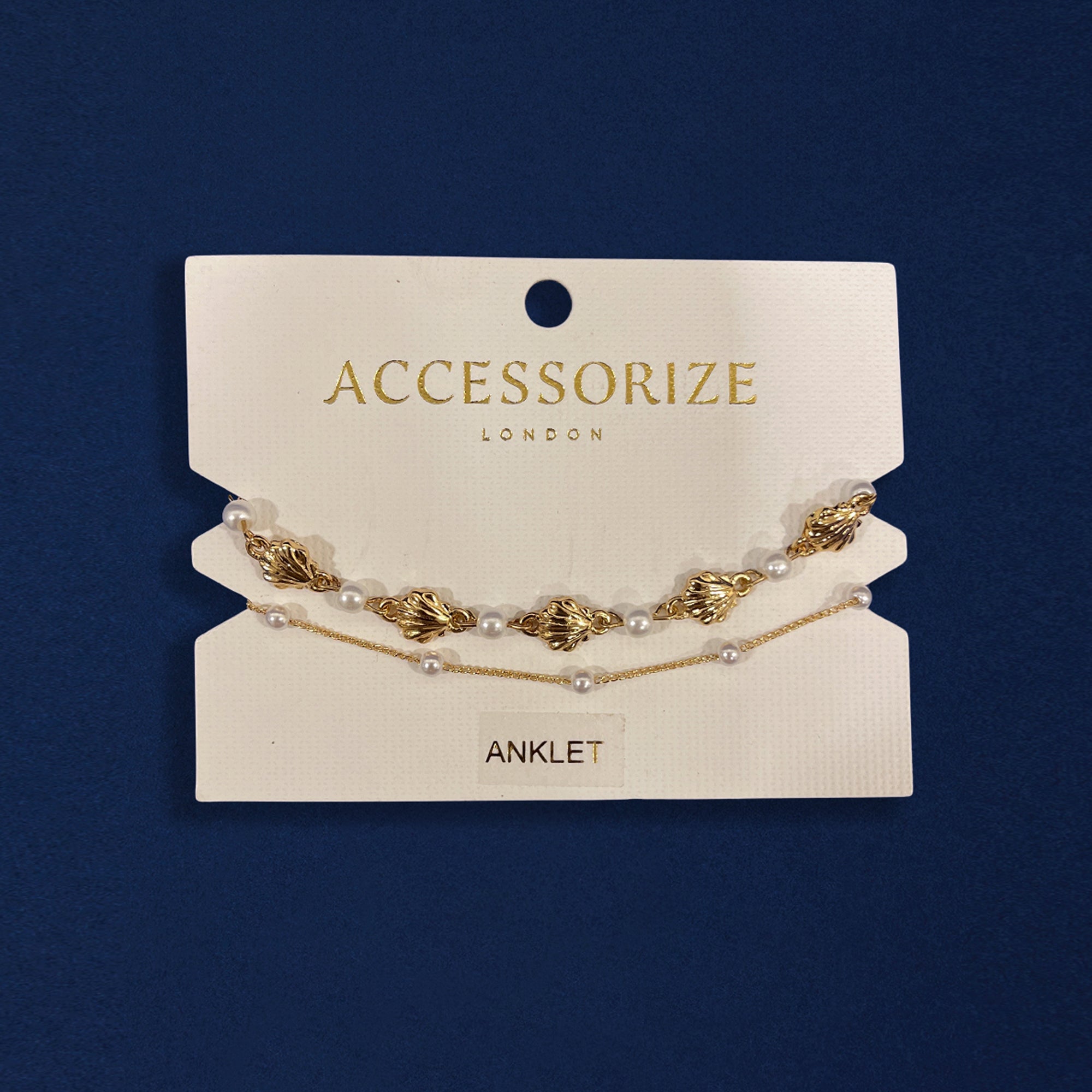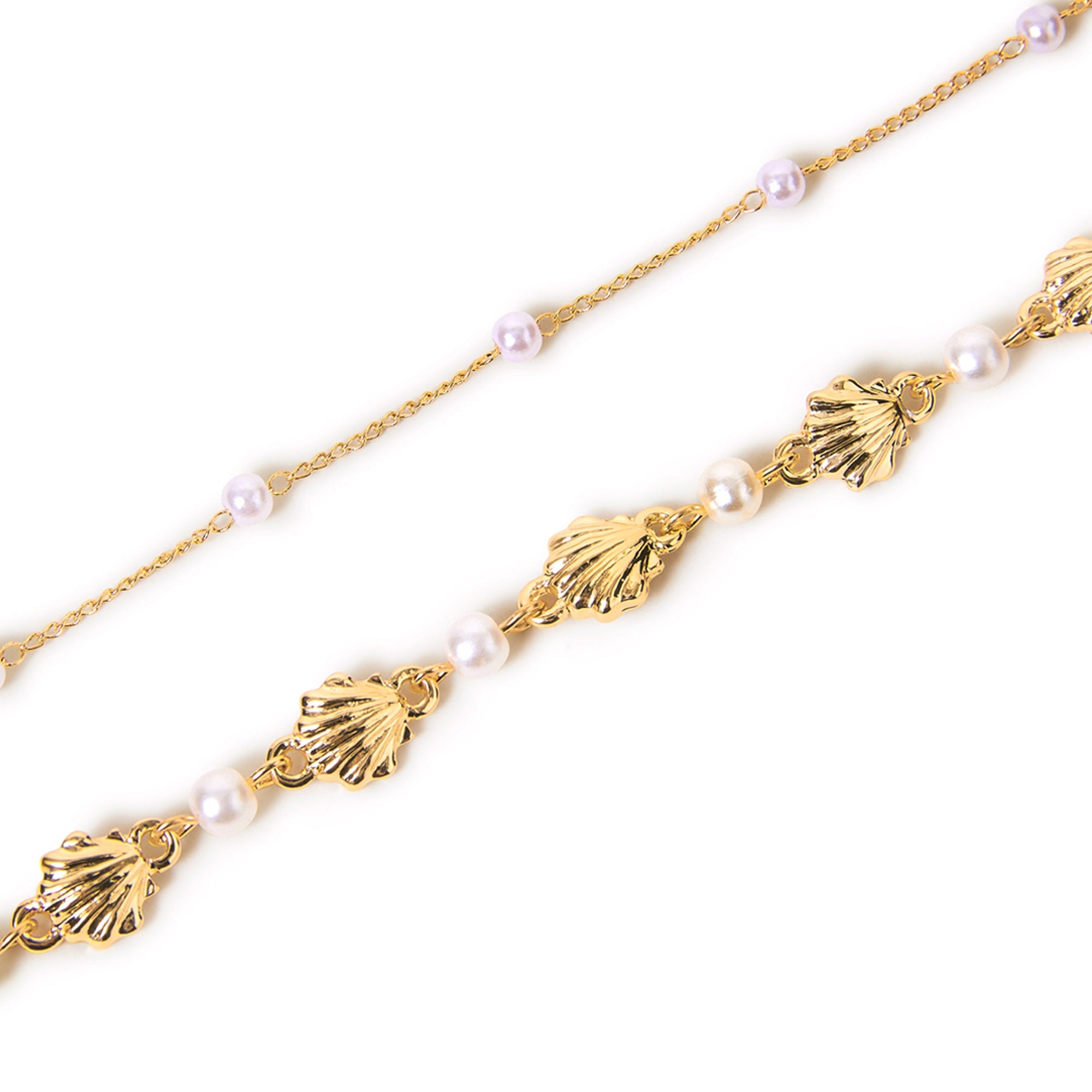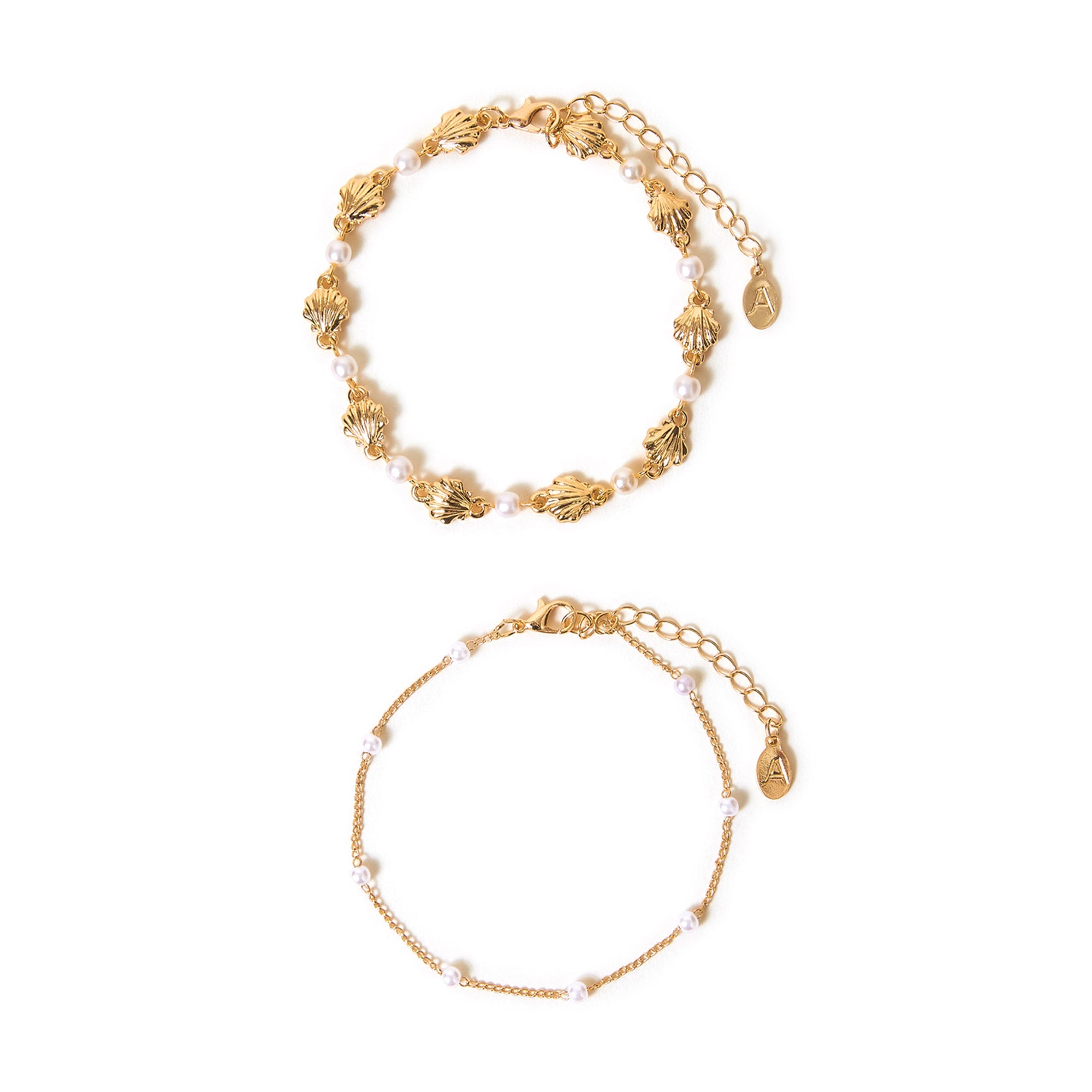 If mermaids had legs, they would deffo wear these. Dipped in a tone to match golden hour, these chain anklets are decorated with scallop shells and pearly beads. Fasten with a lobster clasp and extender.