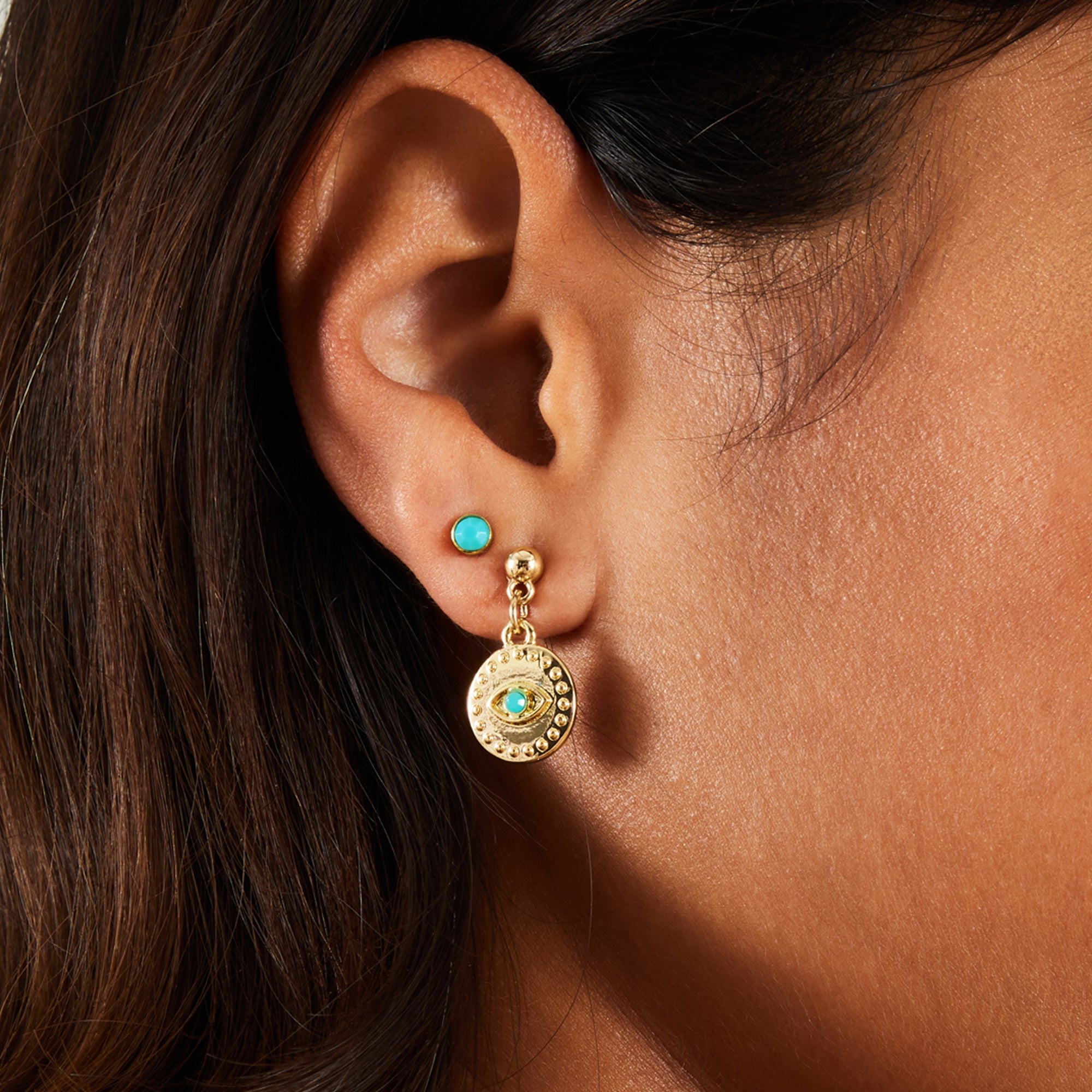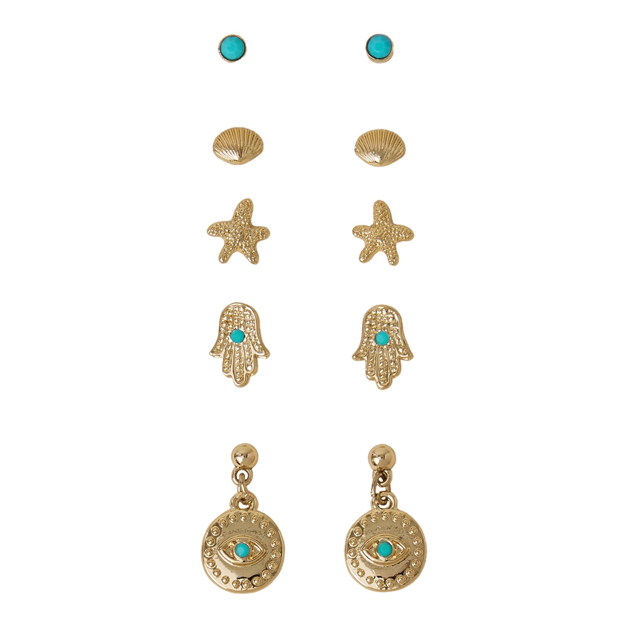 Featuring starfish, shells, and simple studs with pops of turquoise on gold-tone metal, these earrings are perfect for your next sunny getaway.